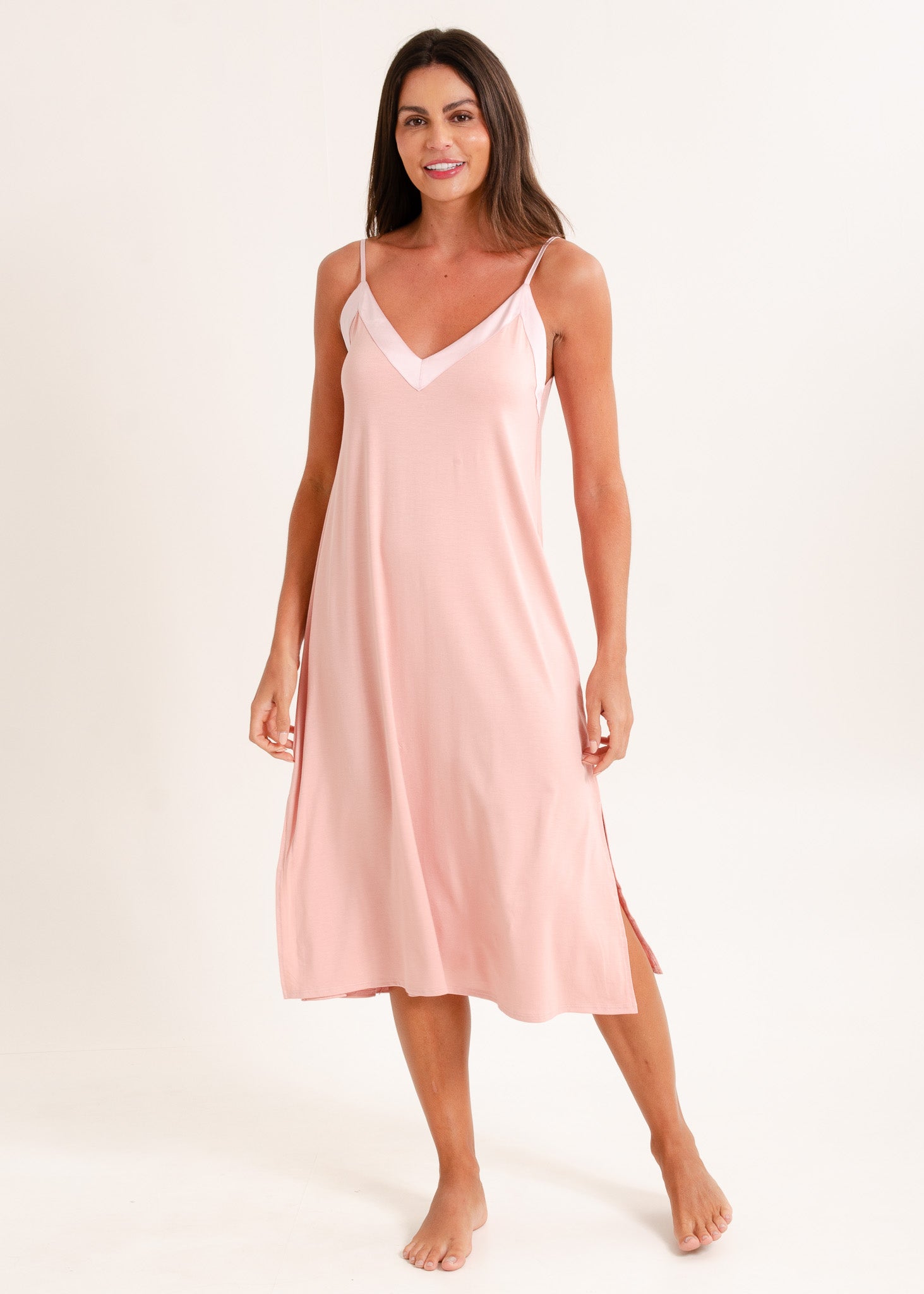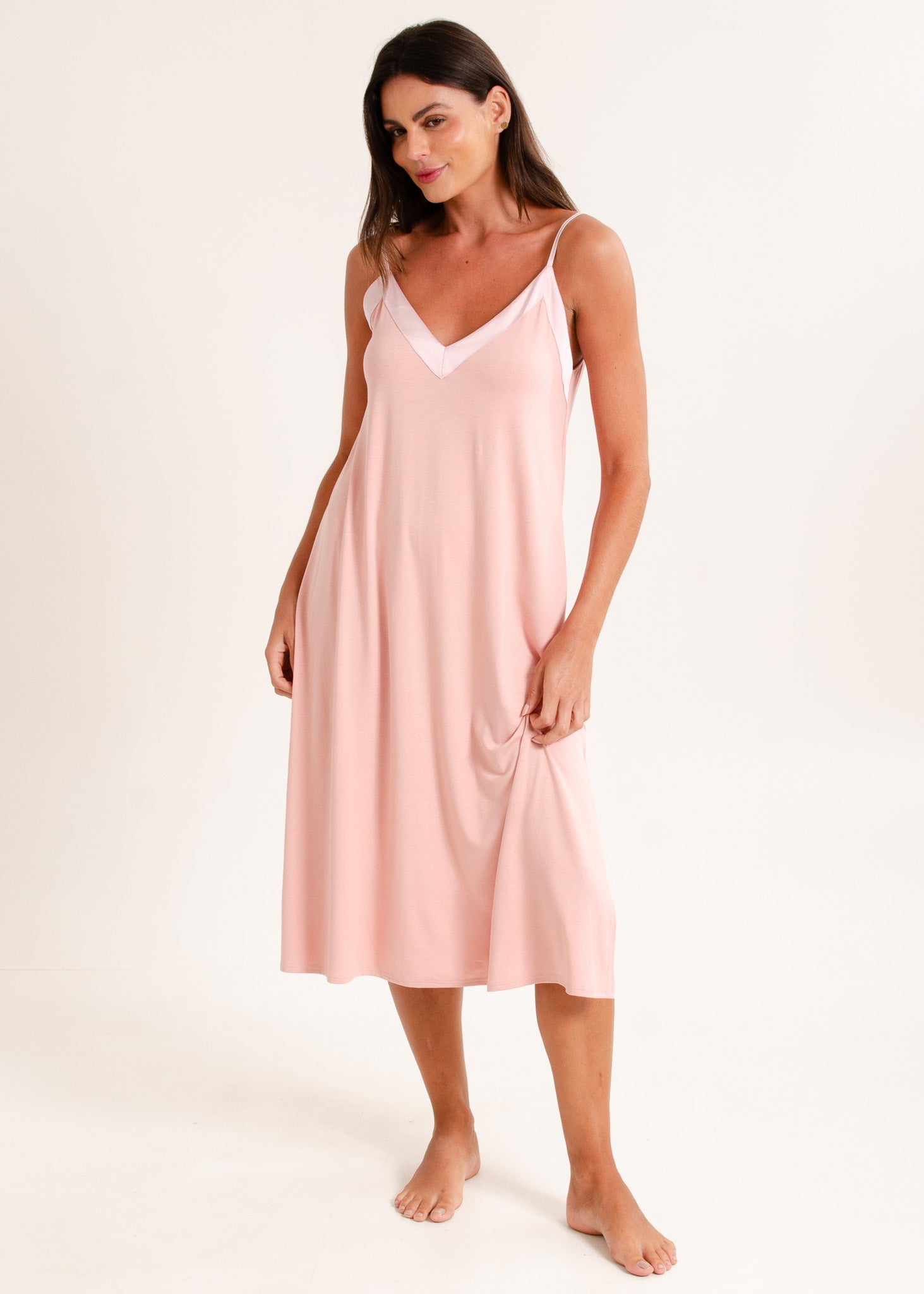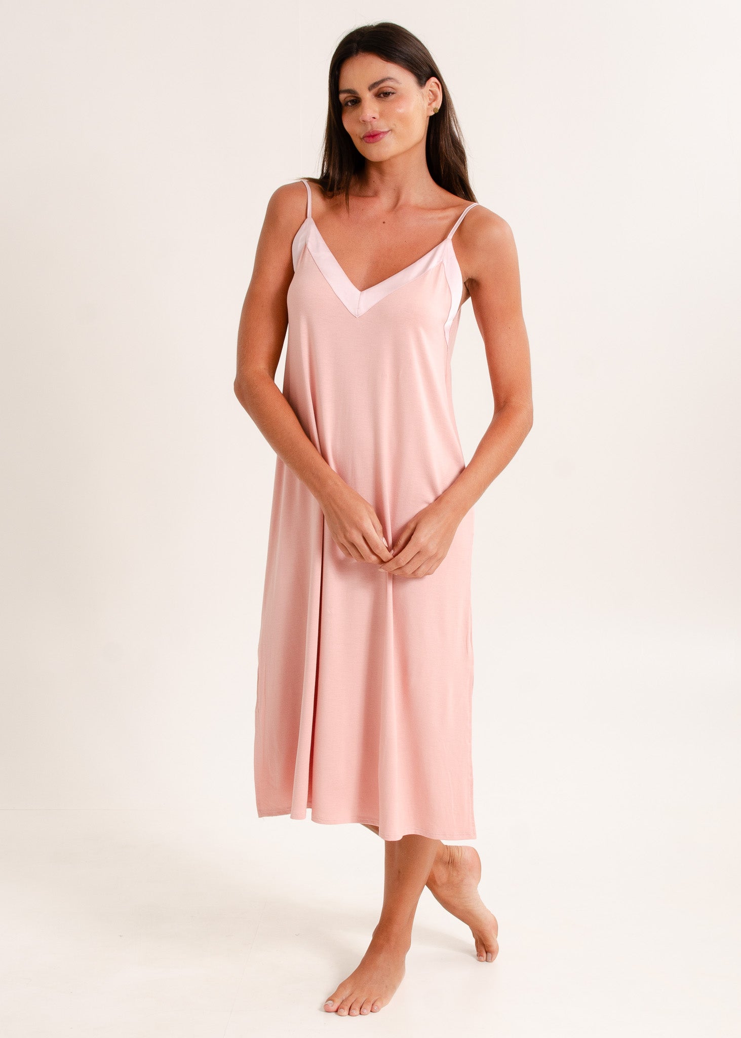 Camisola feminina, modelo alças com detalhe em cetim tom sobre tom no decote. O comprimento midi alonga a silhueta. Fendas laterais na barra.