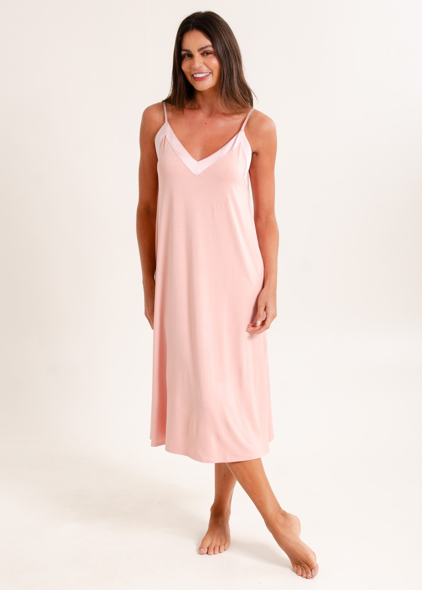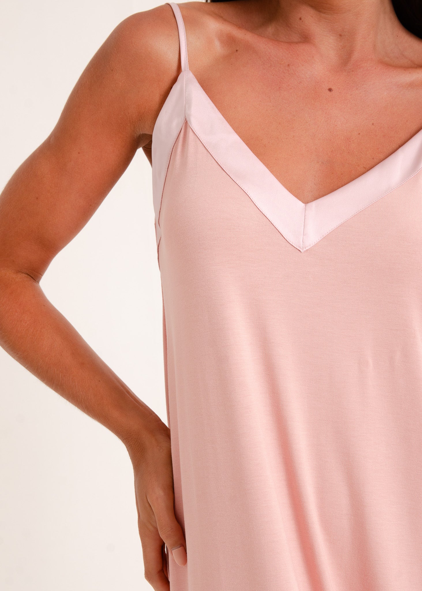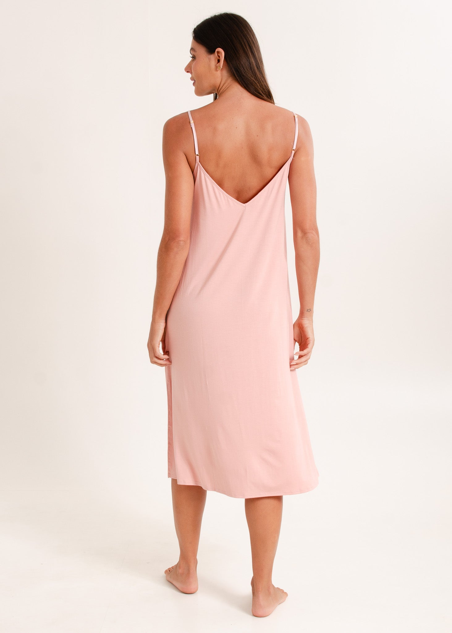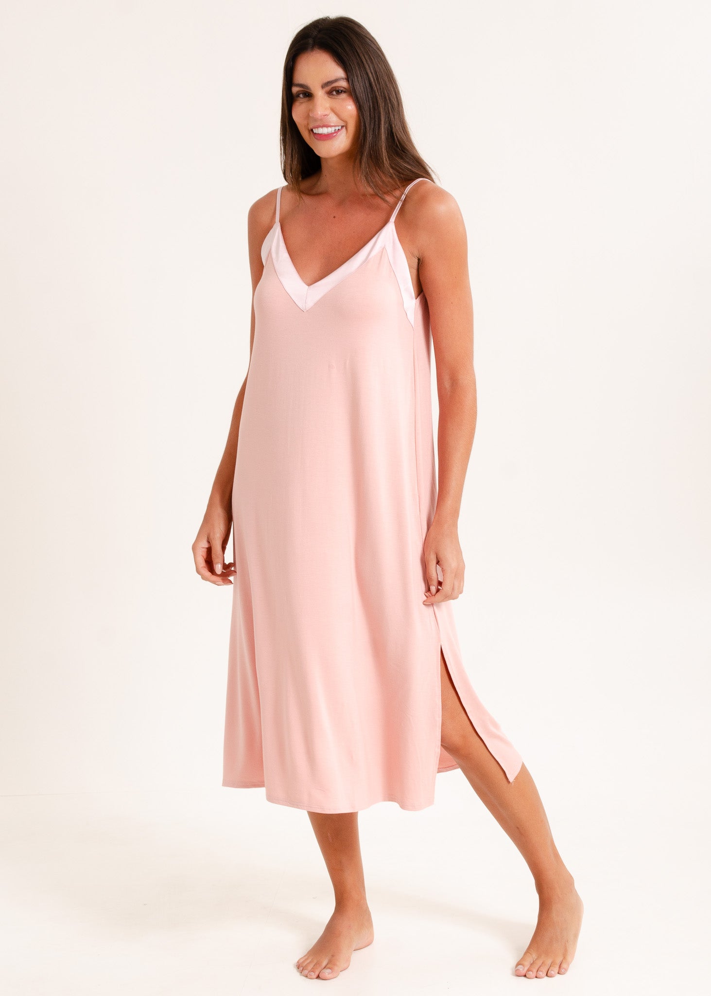 Camisola feminina, modelo alças com detalhe em cetim tom sobre tom no decote. O comprimento midi alonga a silhueta. Fendas laterais na barra.