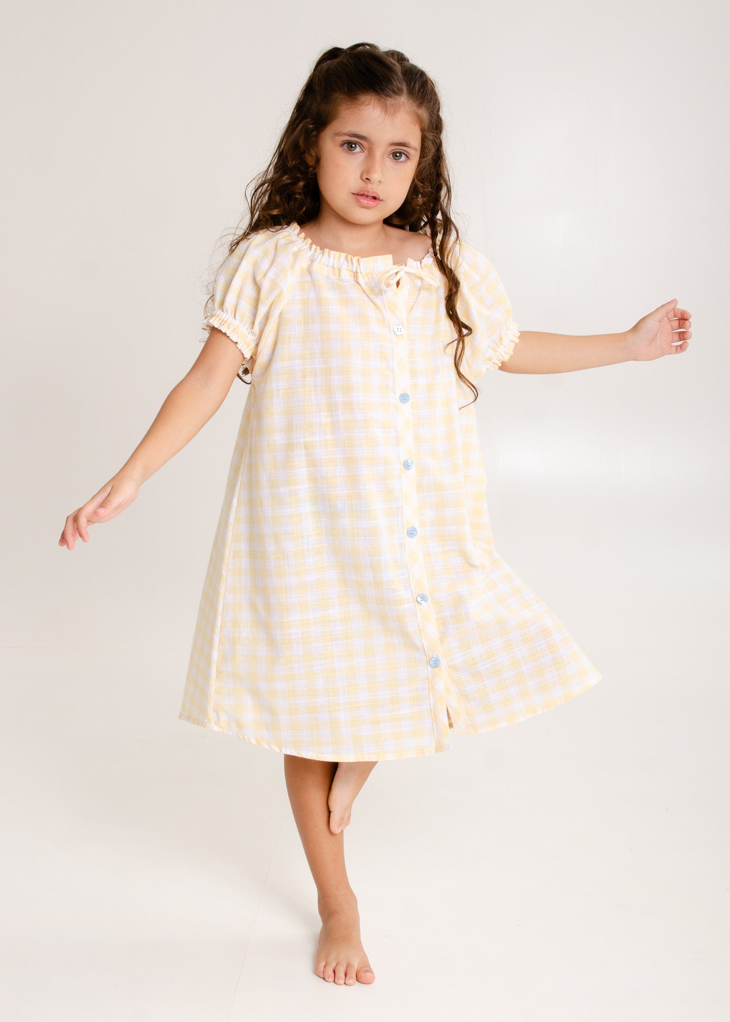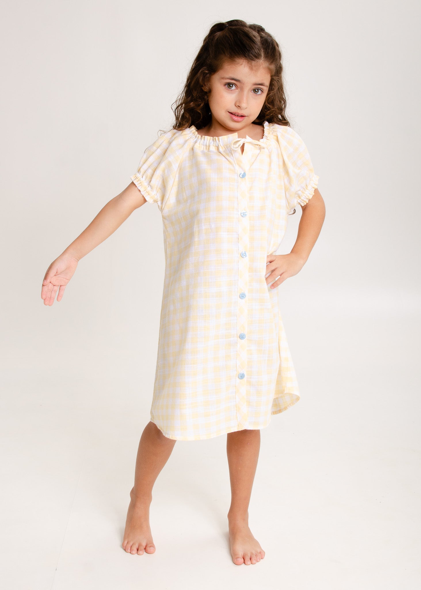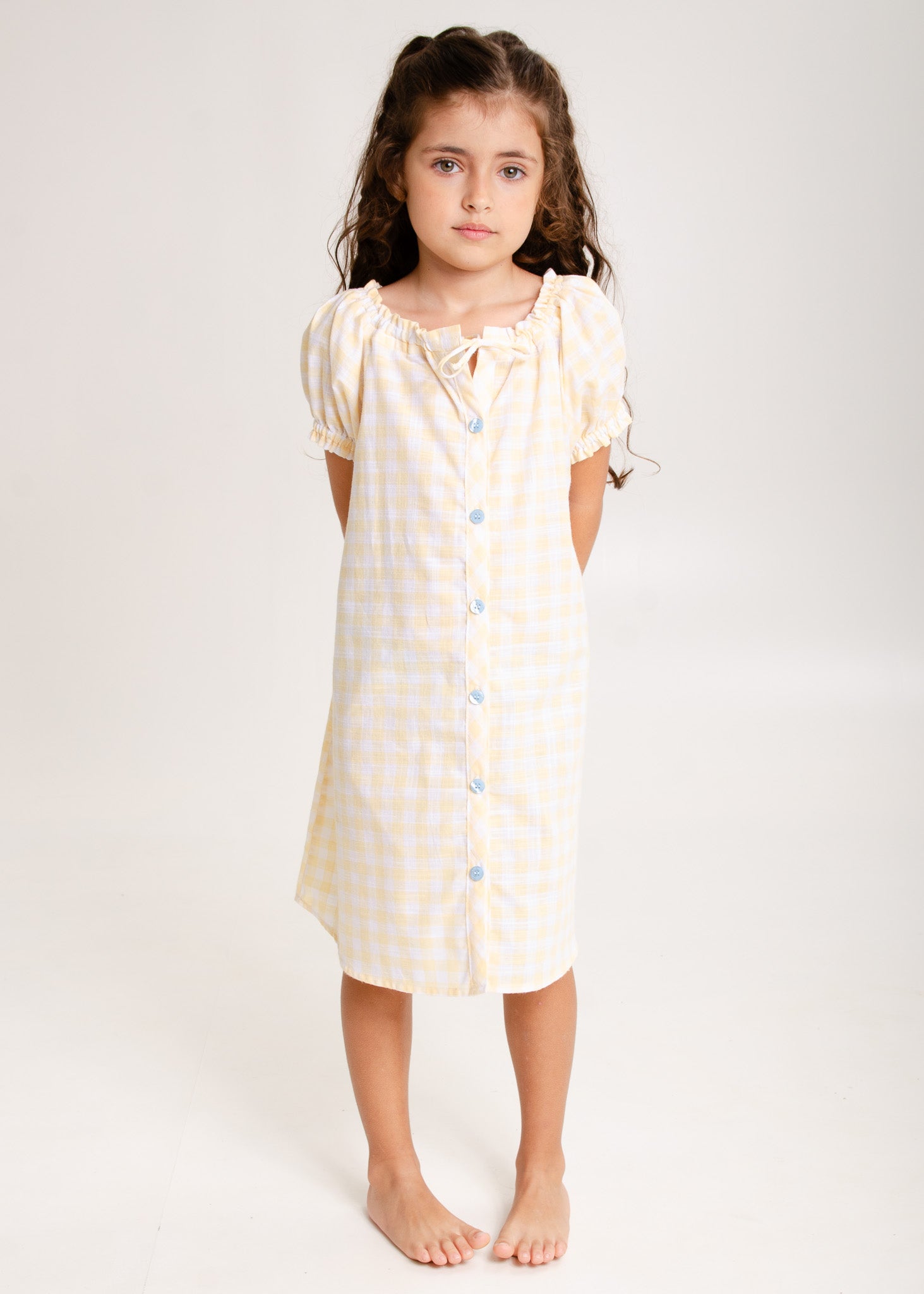 A Coleção Sol foi inspirada na luz dourada dos raios de sol de uma manhã de primavera. É toda em tecido 100% algodão xadrez na cor amarela bem suave, com detalhes azul clarinho.
