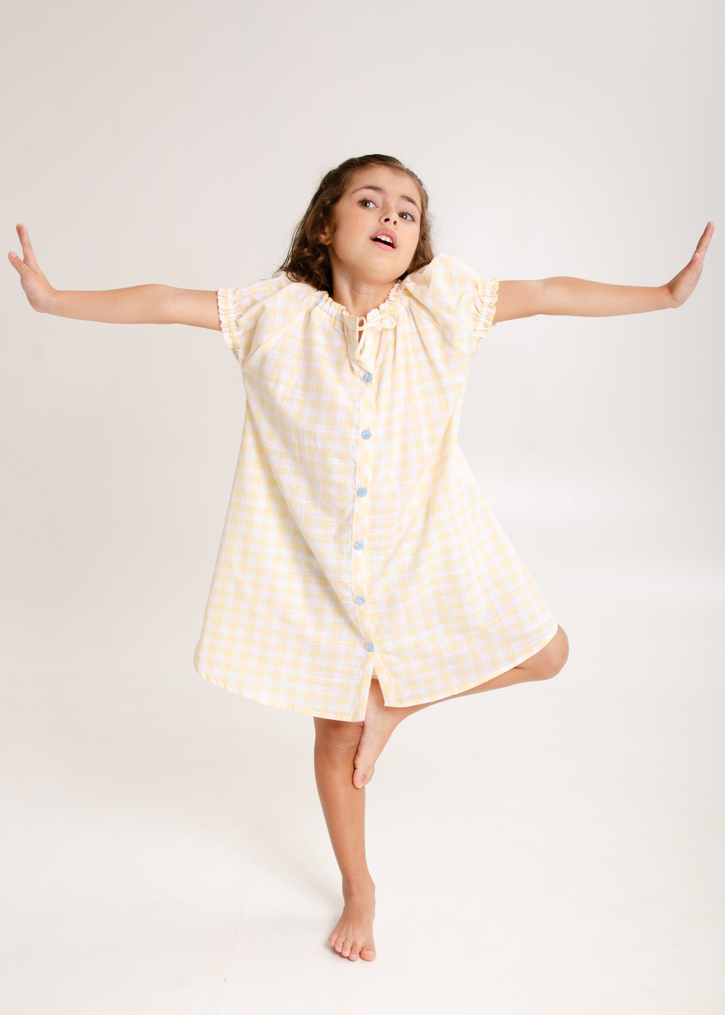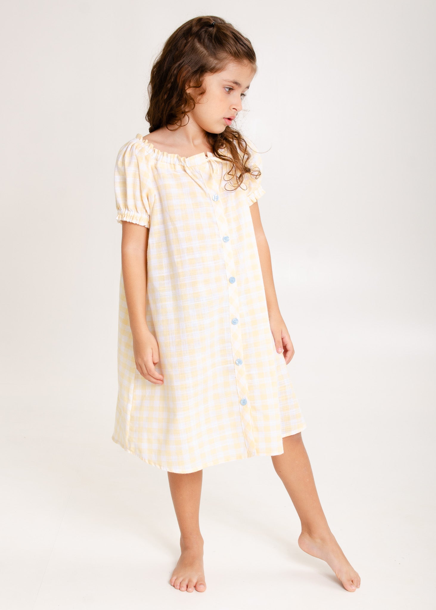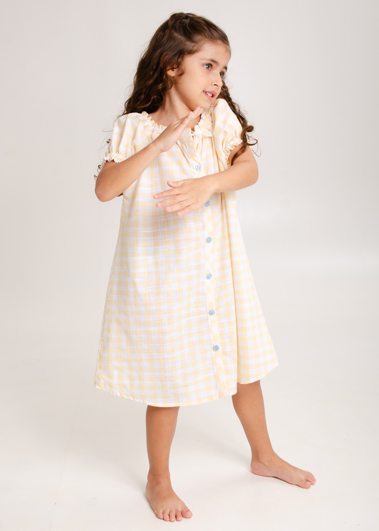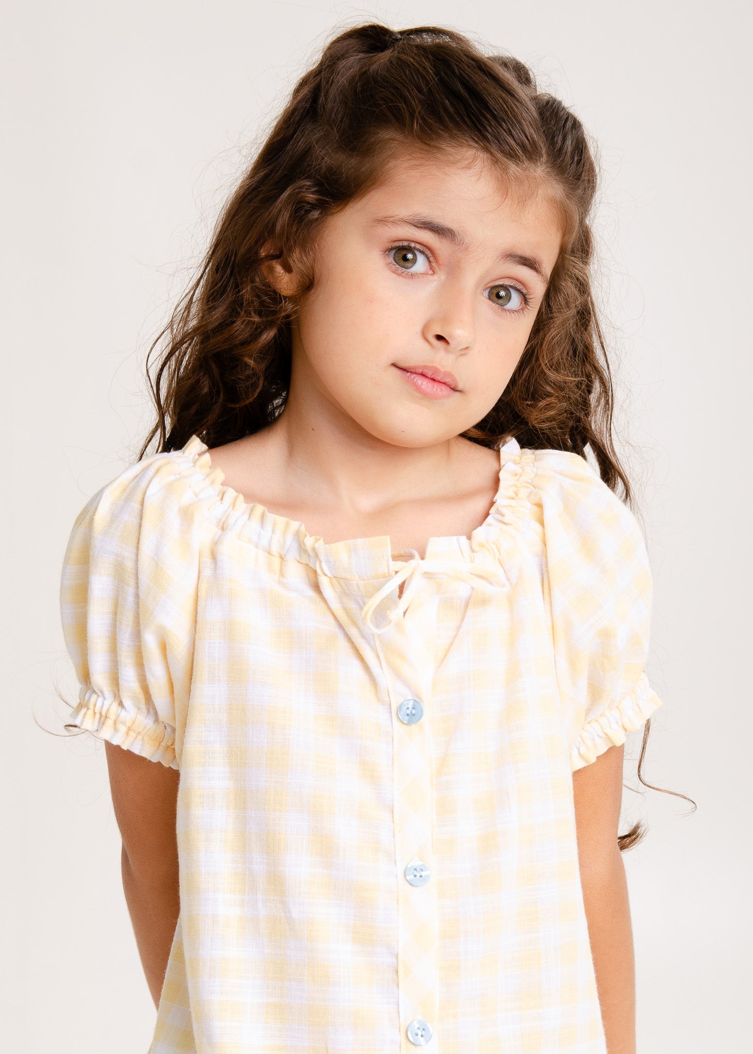 A Coleção Sol foi inspirada na luz dourada dos raios de sol de uma manhã de primavera. É toda em tecido 100% algodão xadrez na cor amarela bem suave, com detalhes azul clarinho.