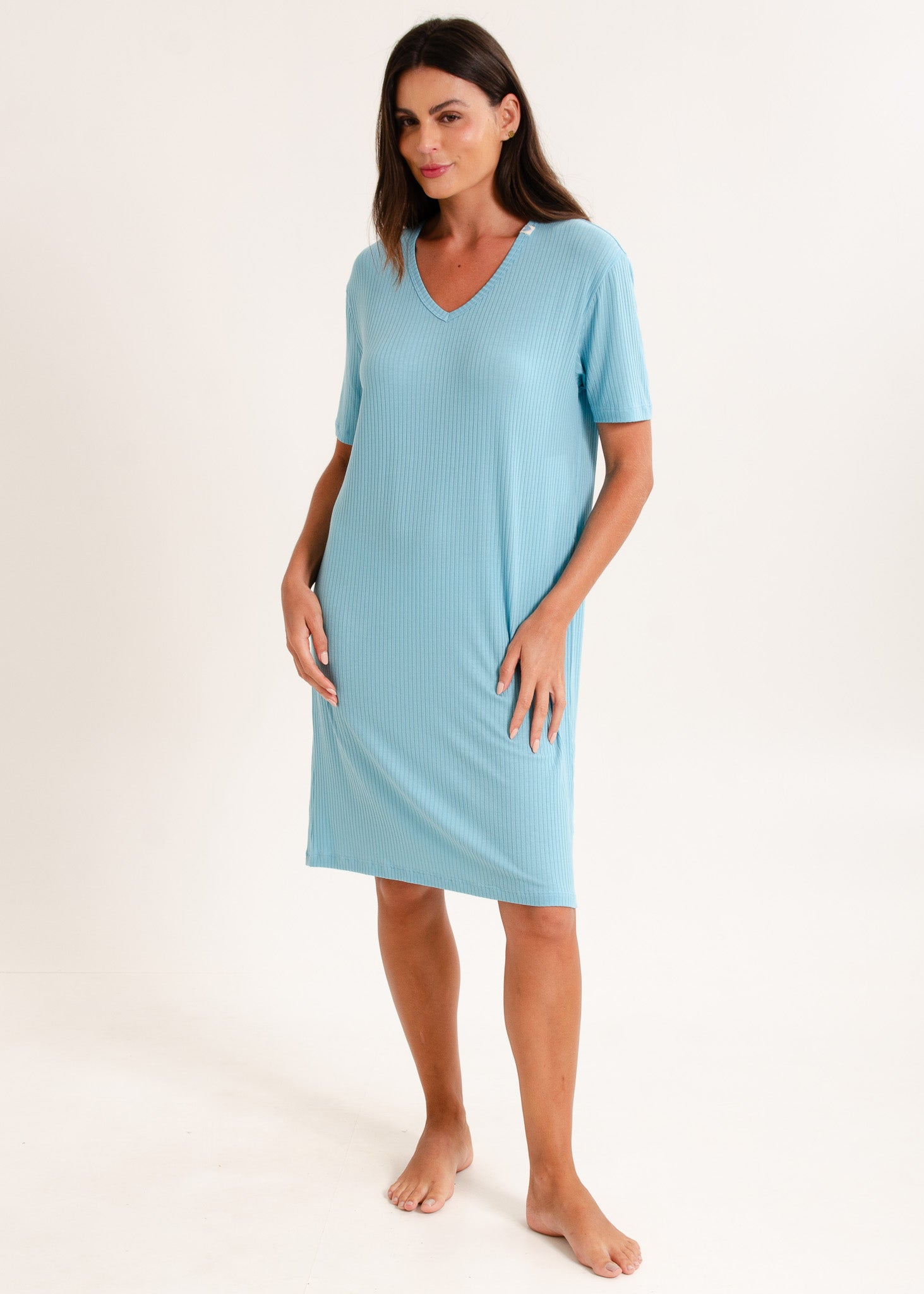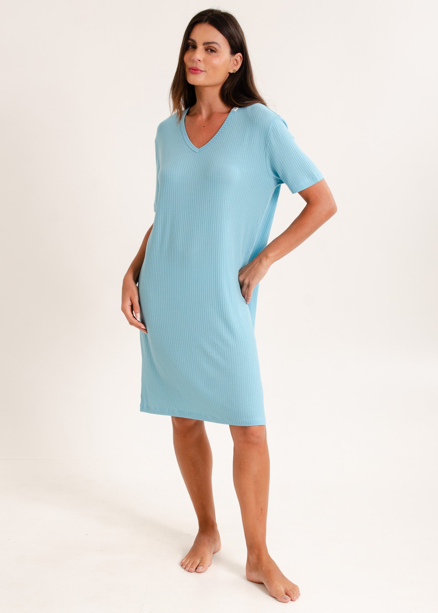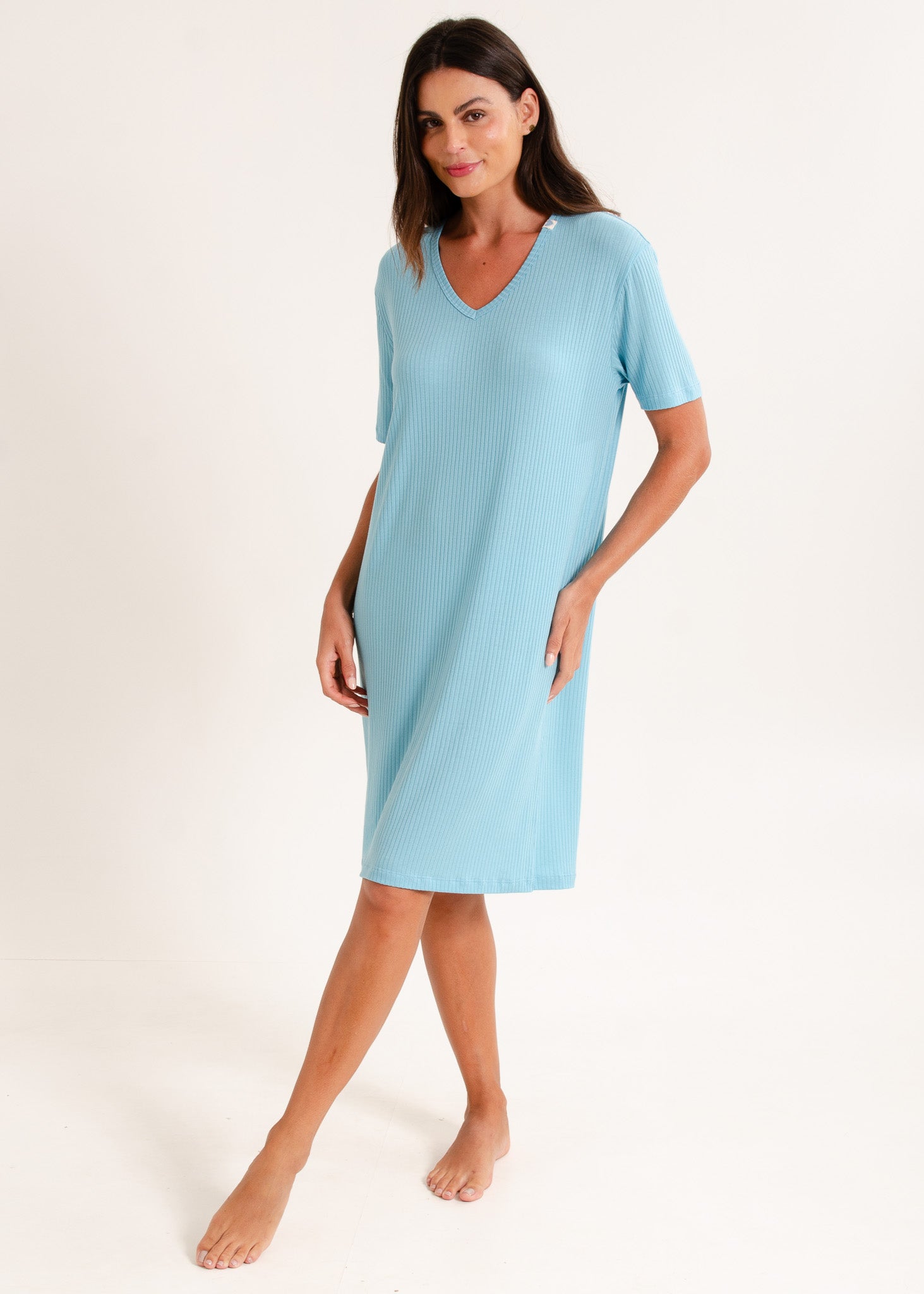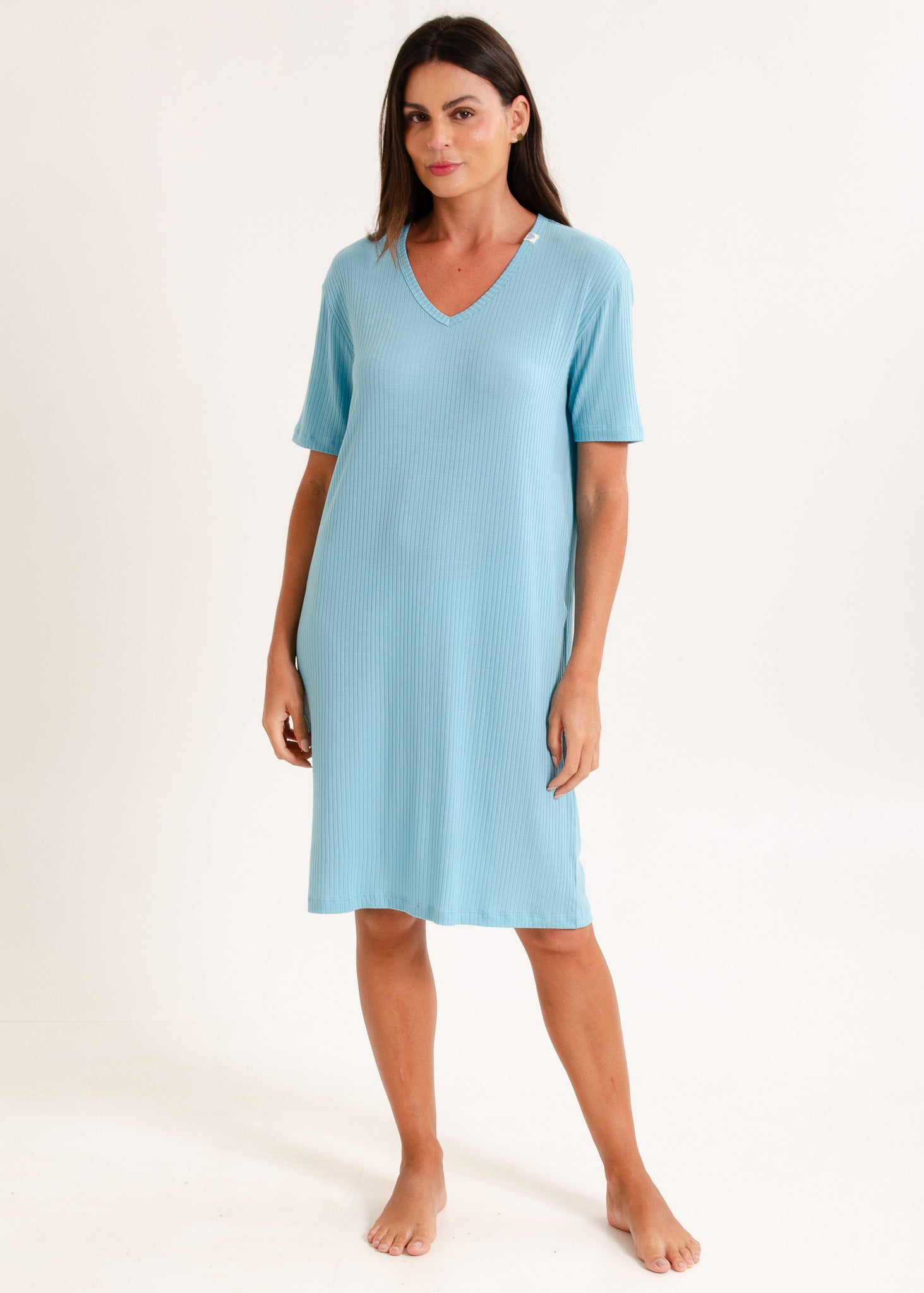 Camisola feminina com mangas curtas, comprimento no joelho, gola V com delicado detalhe. Com toque geladinho do liocel e modelagem soltinha você vai literalmente se sentir no céu!