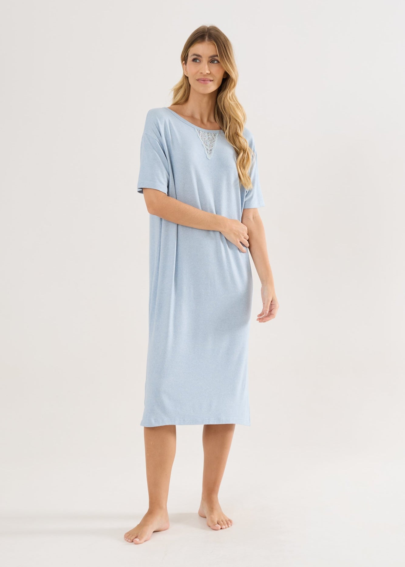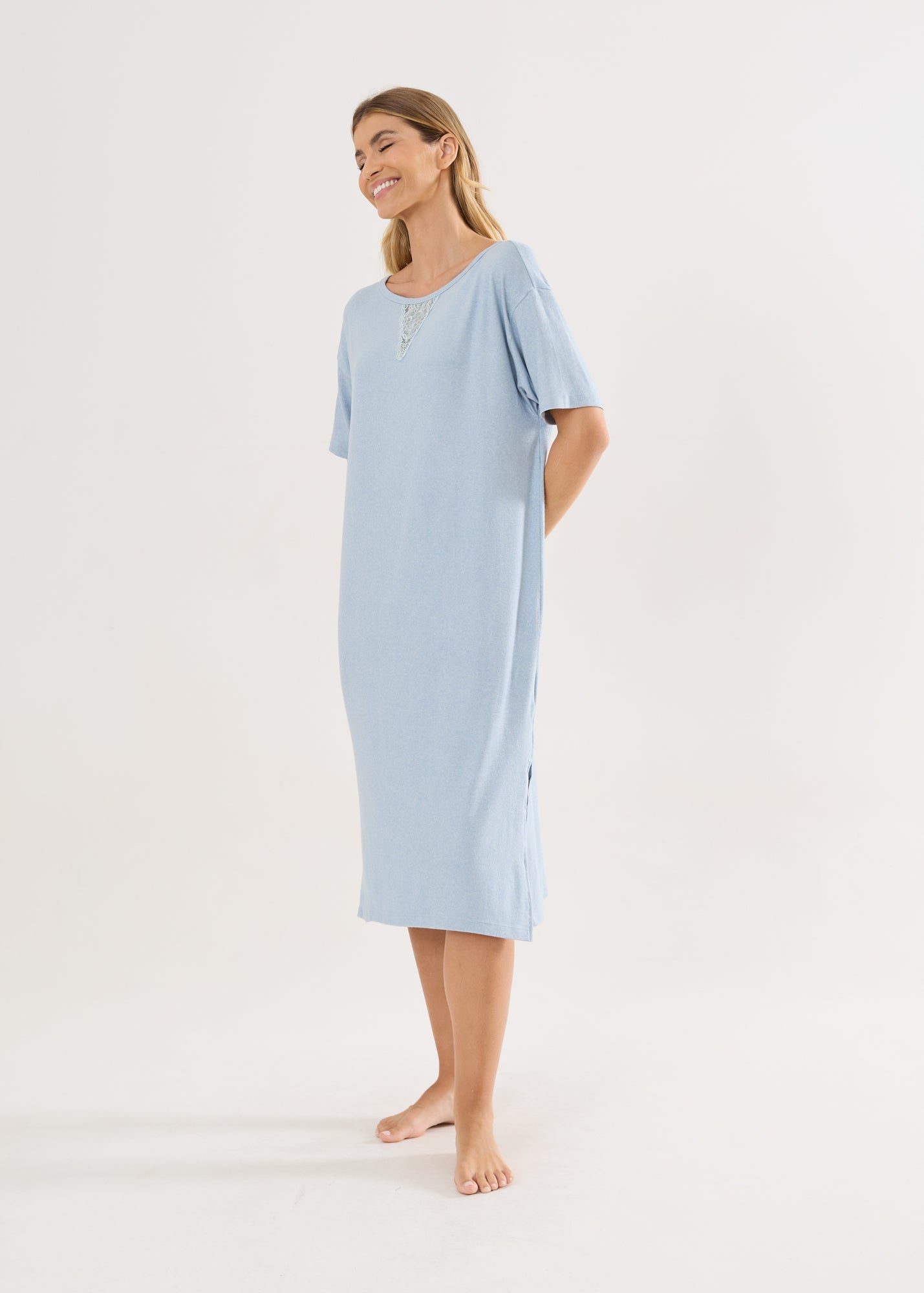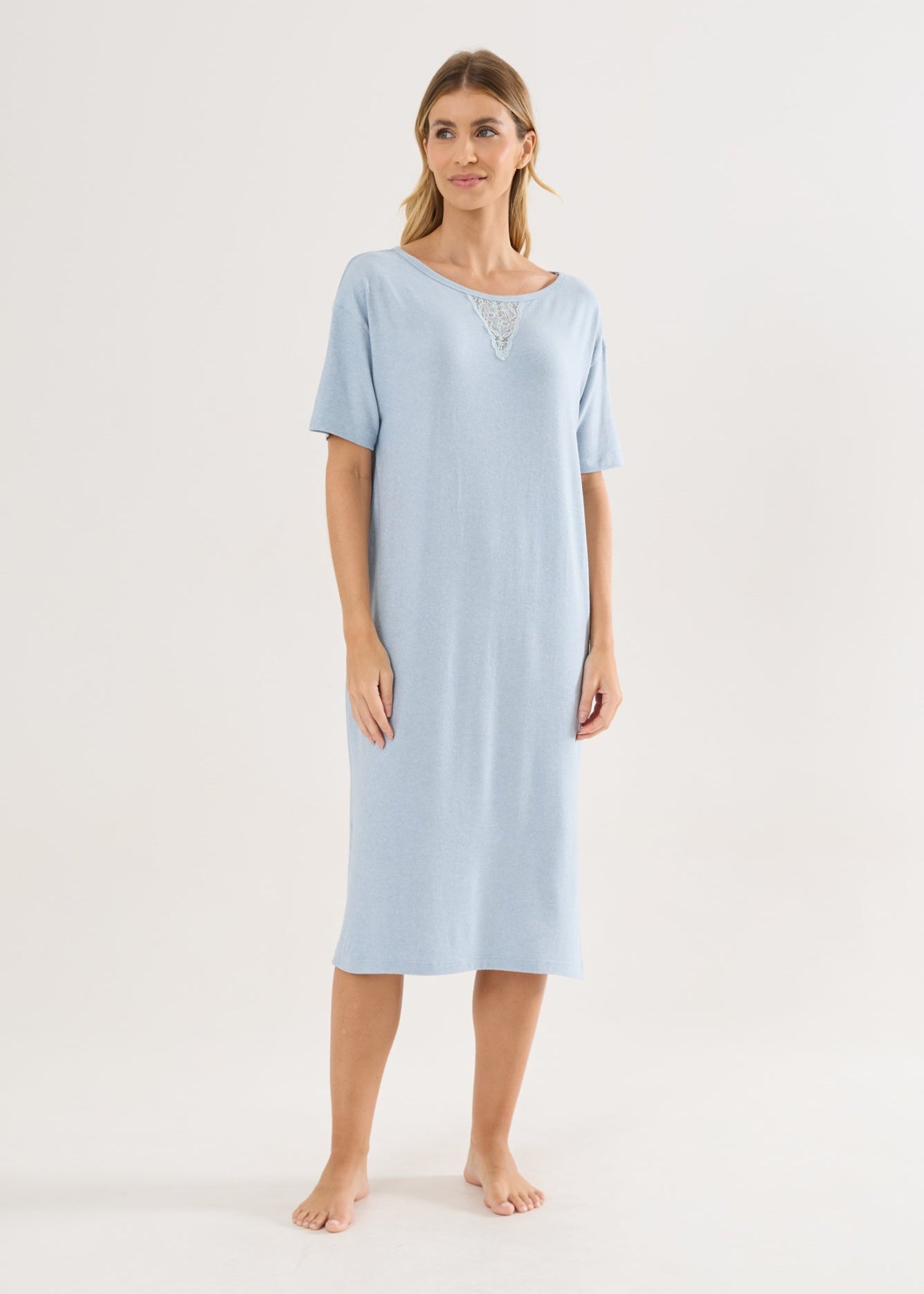Camisola mangas curtas, comprimento midi que é extremamente elegante e alonga a silhueta, aberturas laterais na barra e o detalhe da renda no decote da frente e nas costas dão o toque delicado à peça.