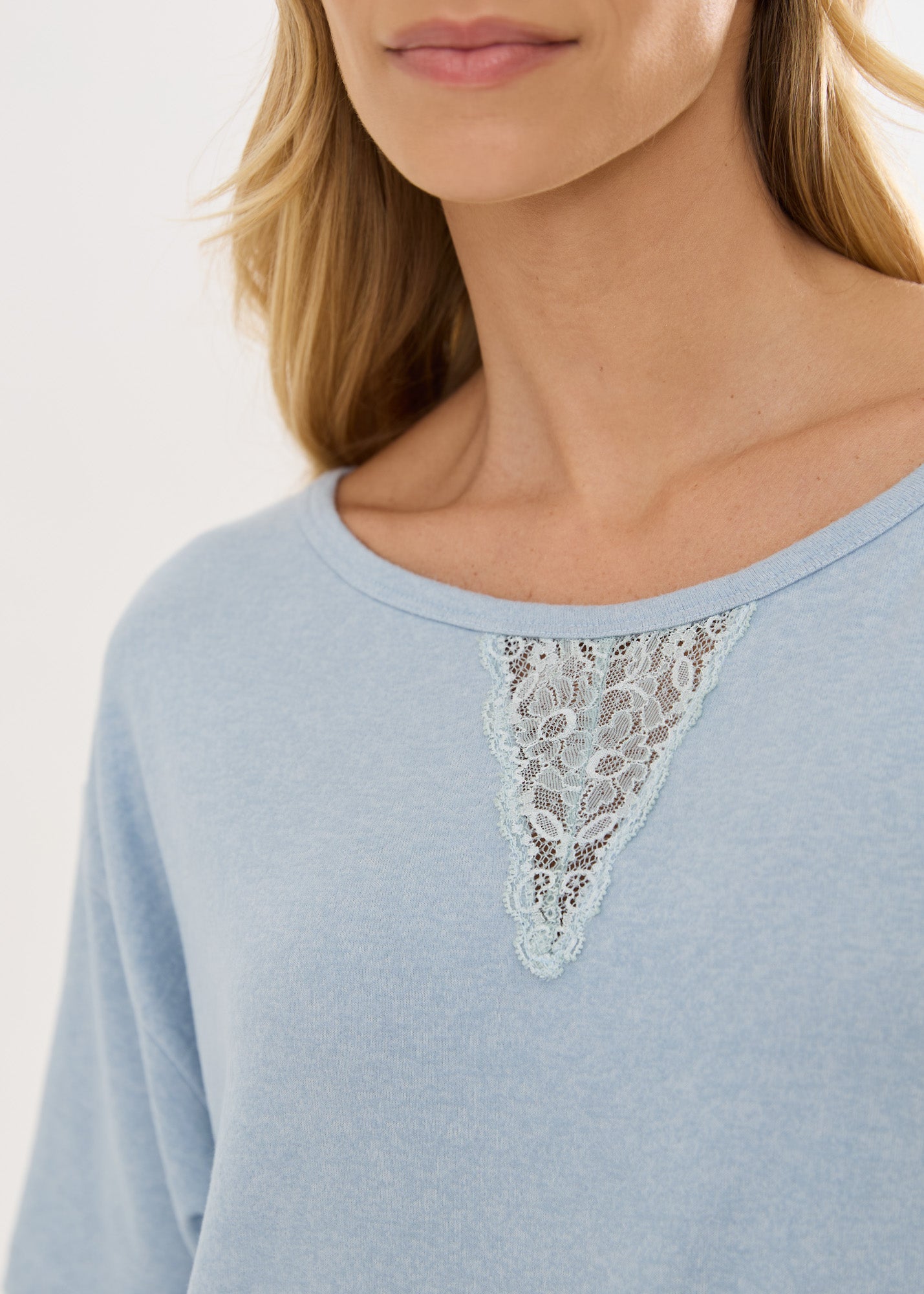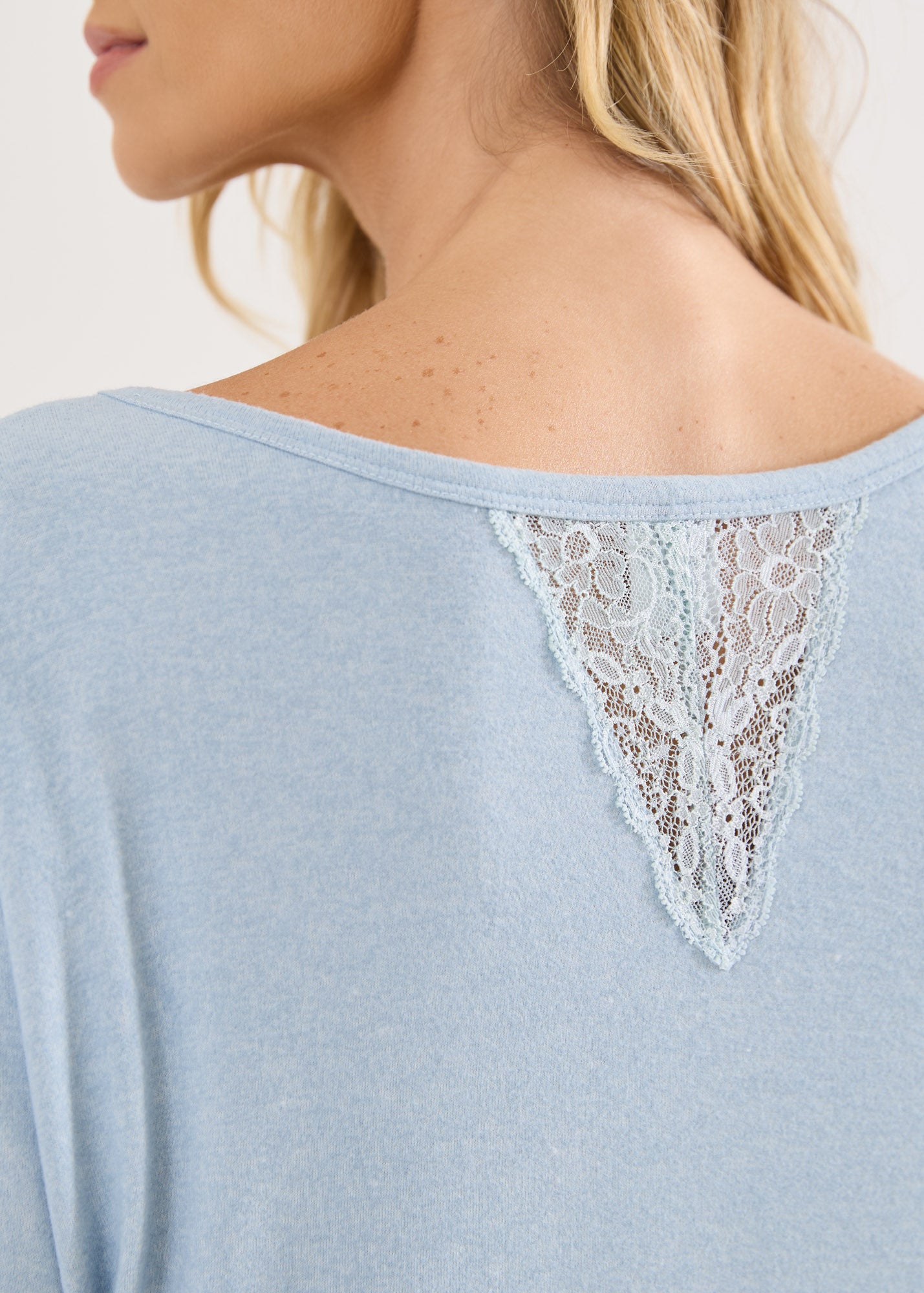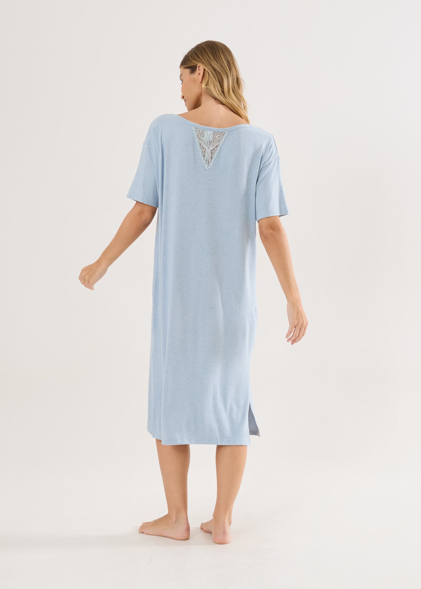 Camisola mangas curtas, comprimento midi que é extremamente elegante e alonga a silhueta, aberturas laterais na barra e o detalhe da renda no decote da frente e nas costas dão o toque delicado à peça.