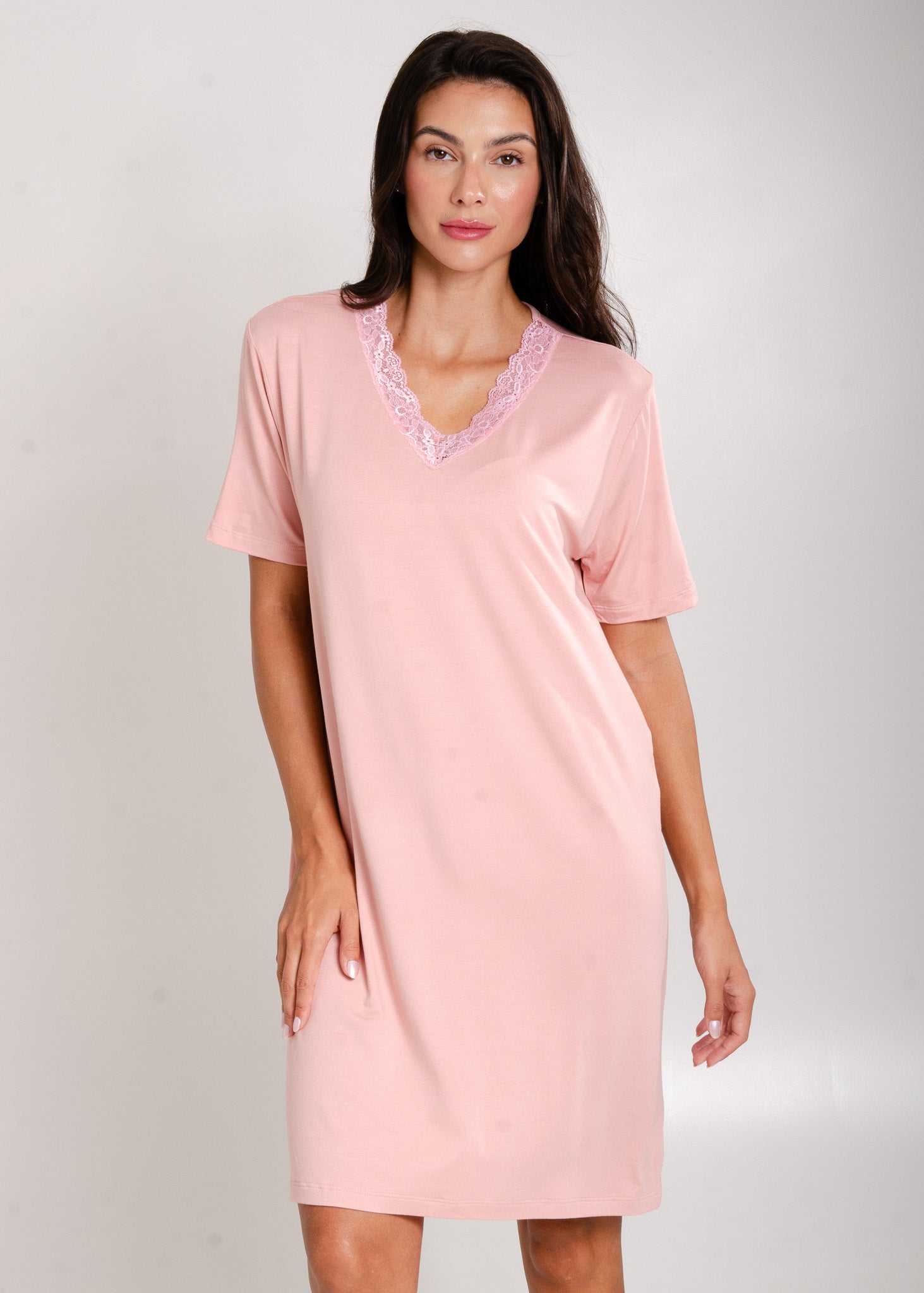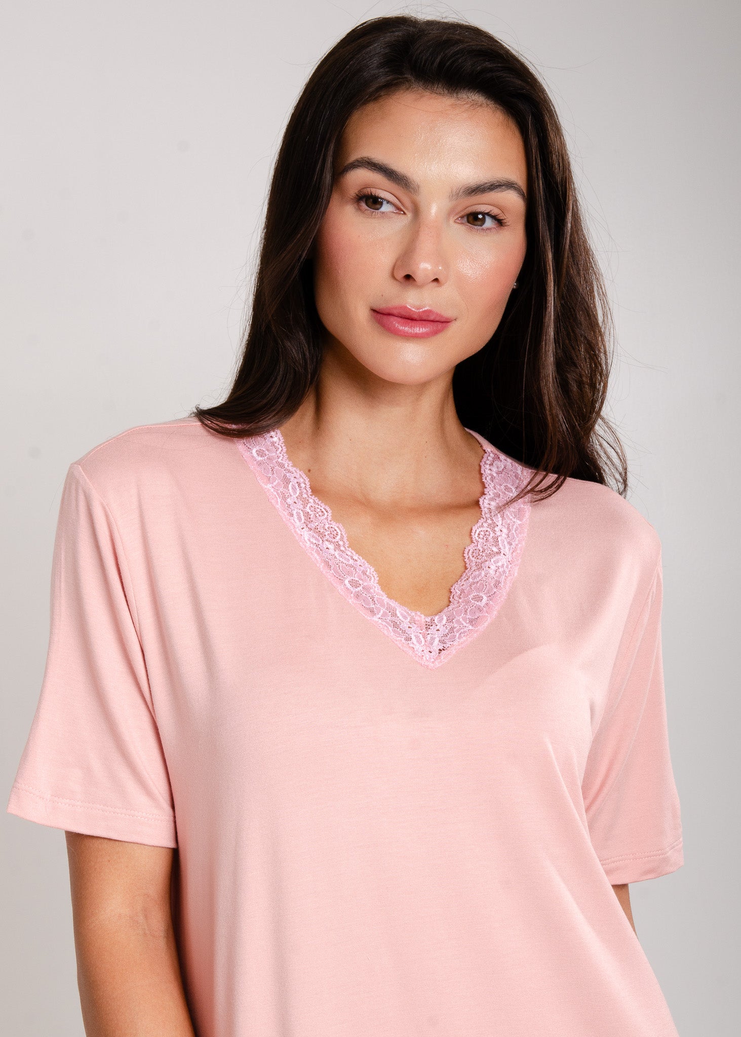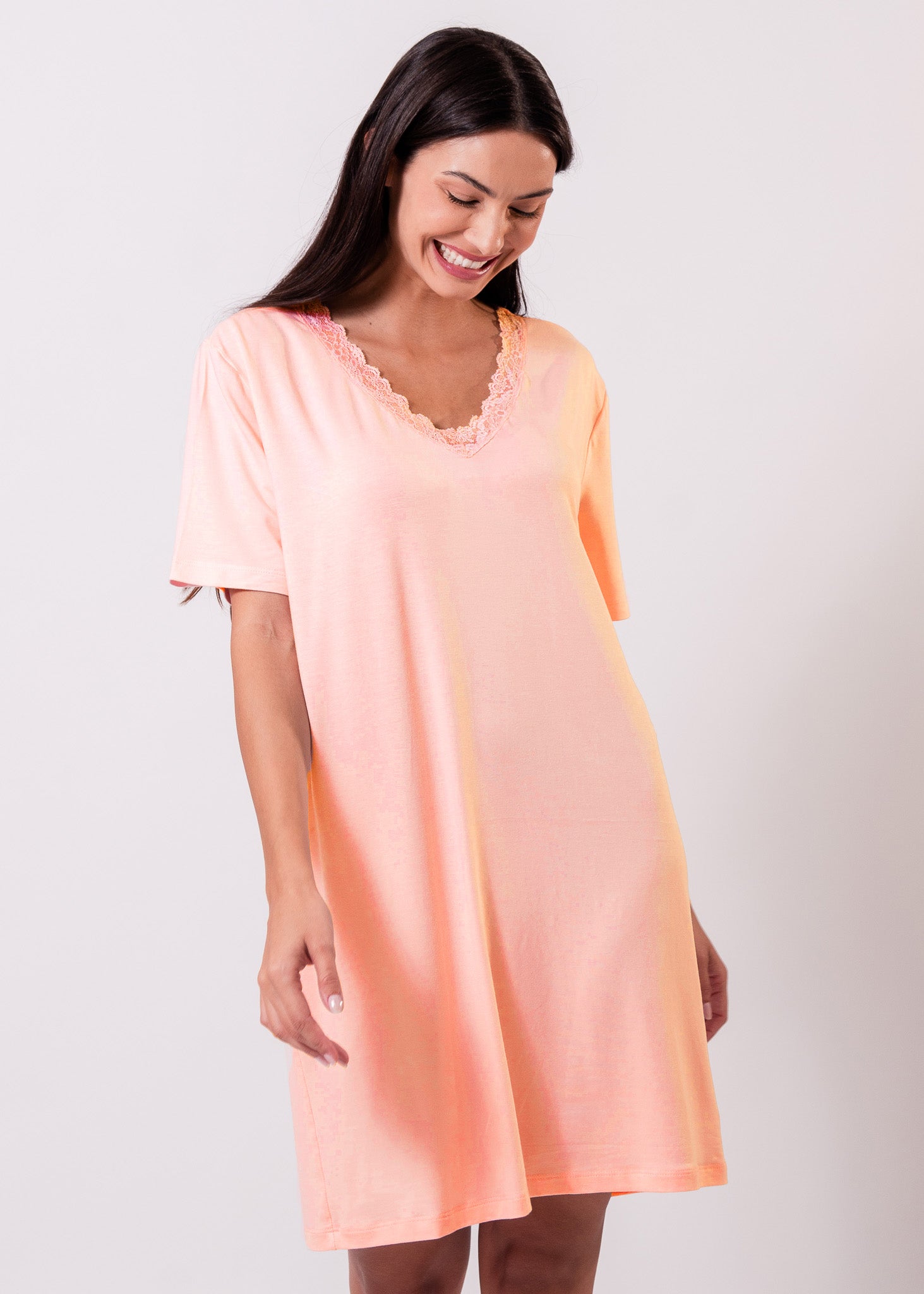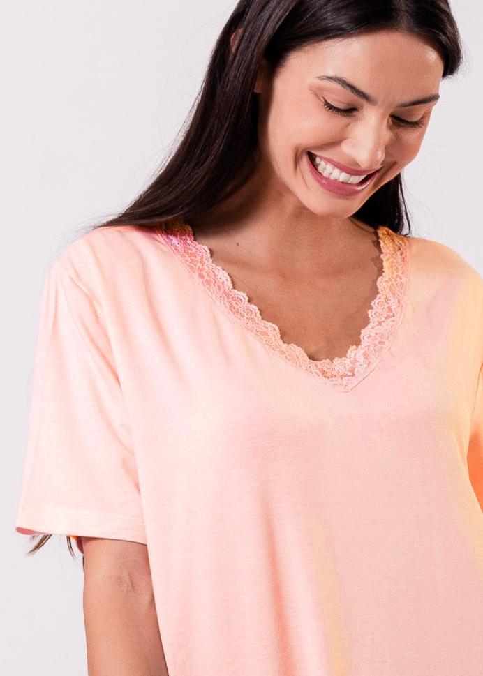 Camisola feminina, modelagem ampla e soltinha, com mangas, decote com detalhe em renda. A malha visco é confortável e leve, com toque muito macio, fresquinha para o verão. Comprimento no joelho.