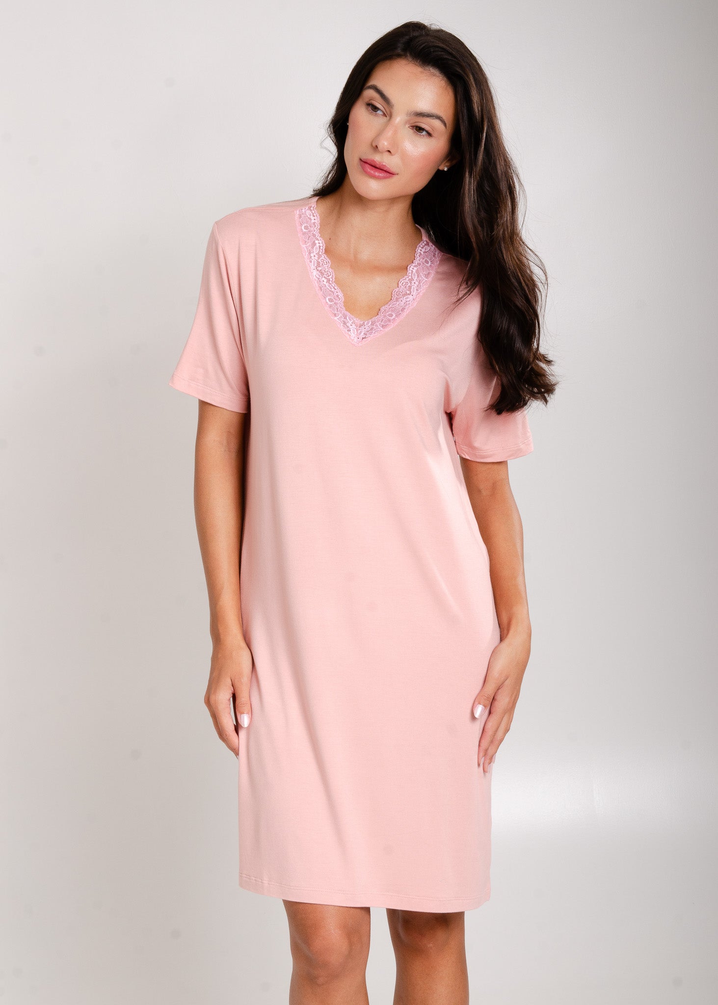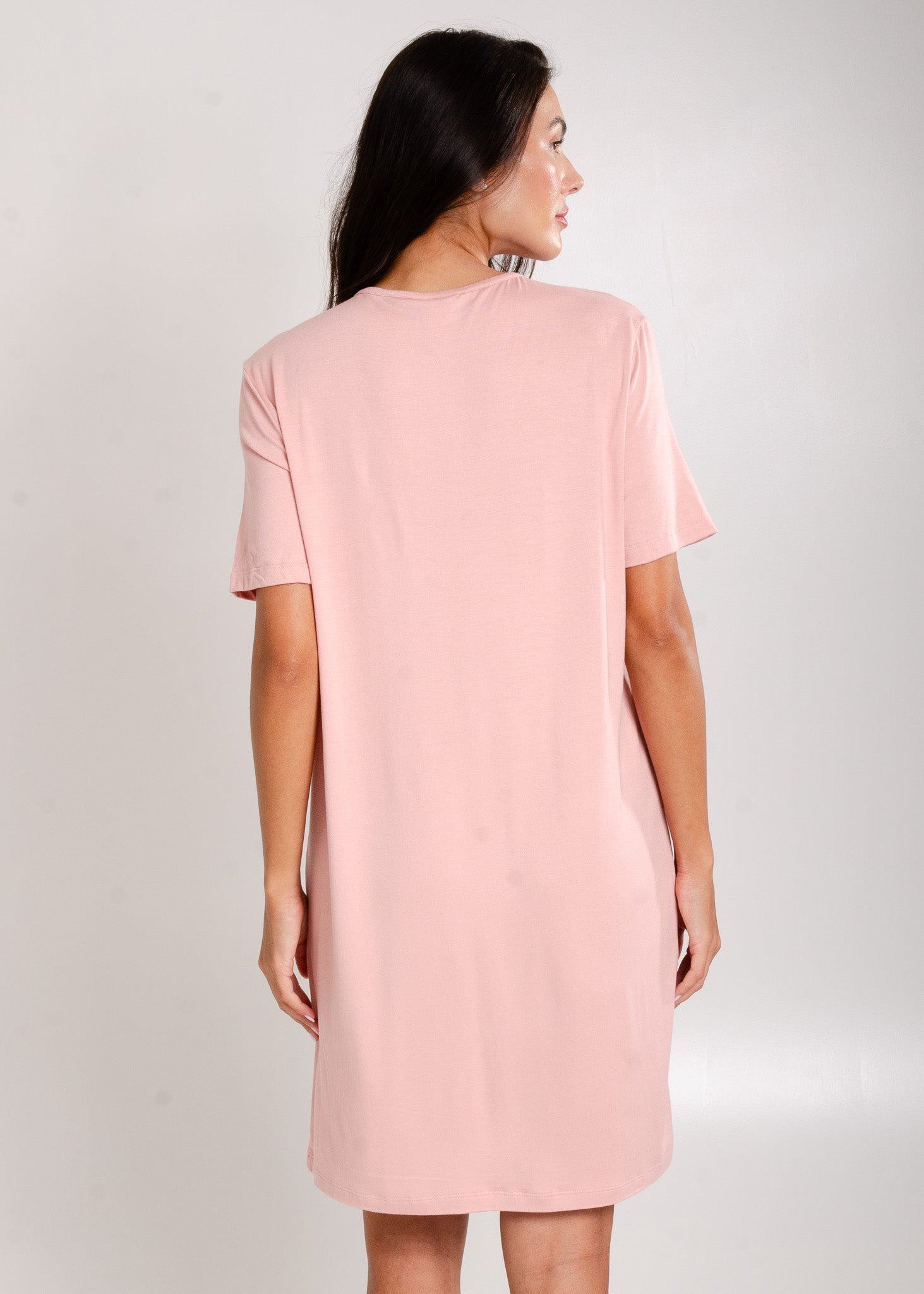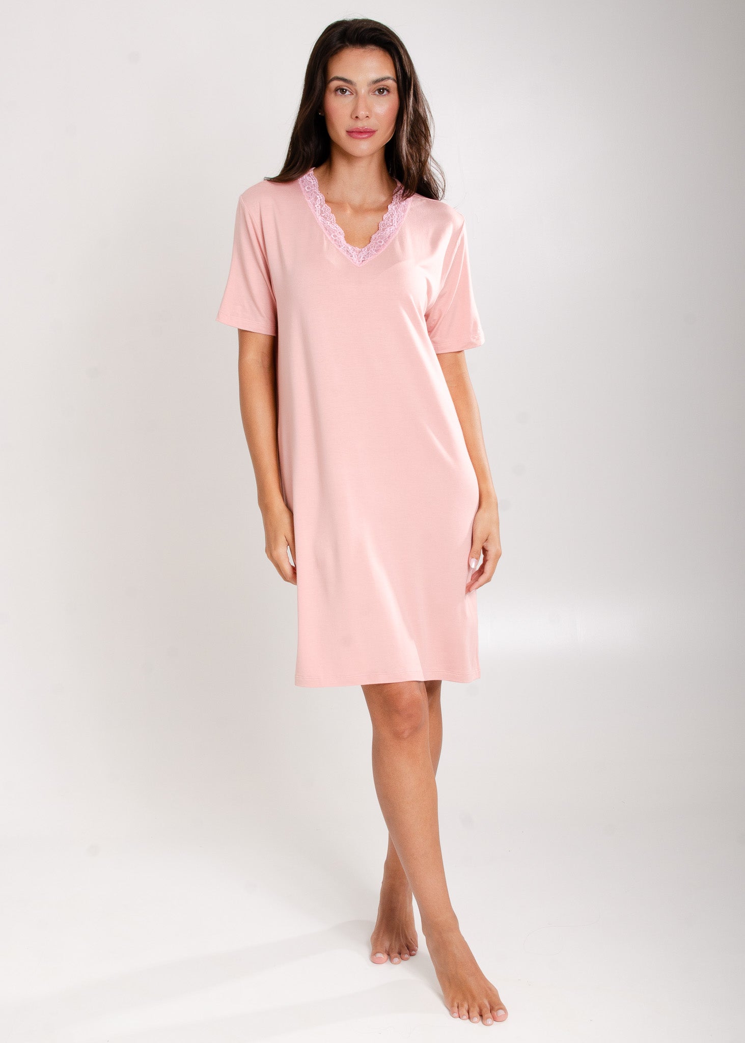Camisola feminina, modelagem ampla e soltinha, com mangas, decote com detalhe em renda. A malha visco é confortável e leve, com toque muito macio, fresquinha para o verão. Comprimento no joelho.