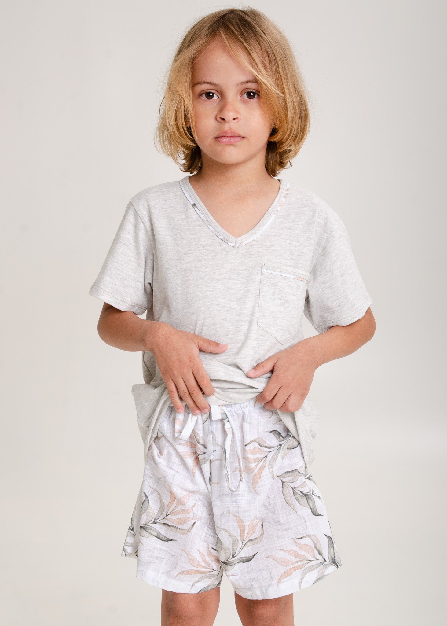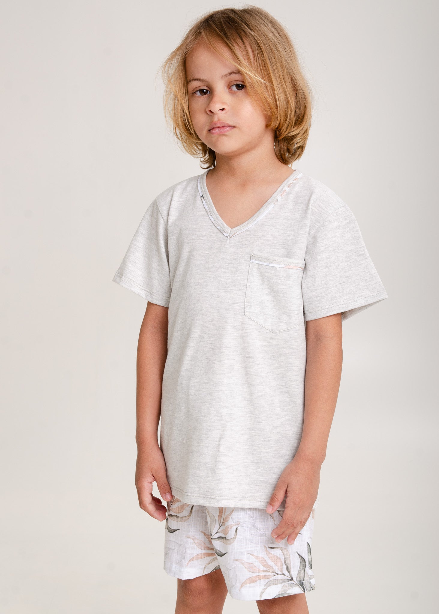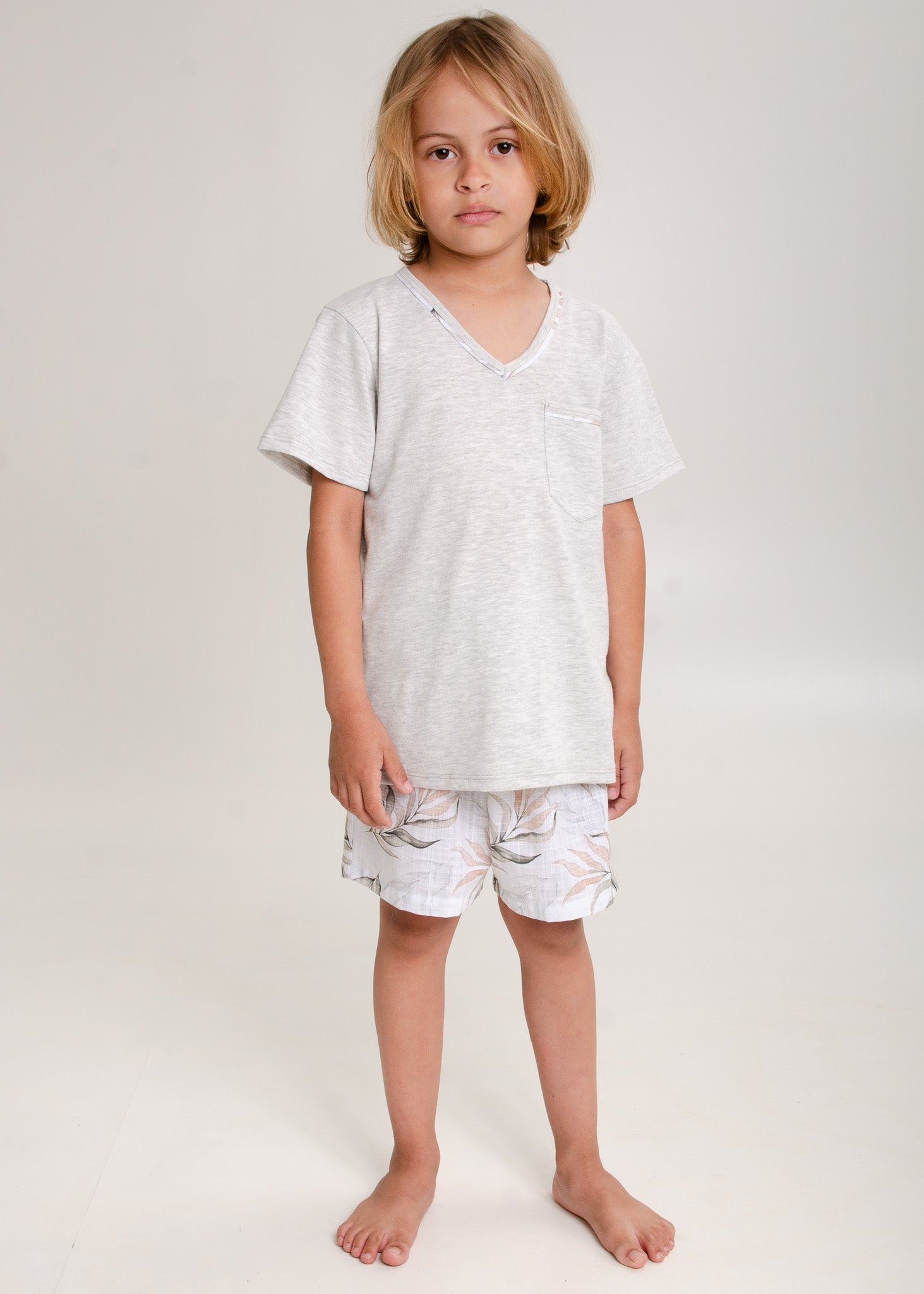 Pijama masculino infantil bermuda em tecido 100% algodão com estampa exclusiva da Coleção Folhagem com elástico na cintura. Blusa em malha mescla com gola v e detalhe na gola e bolsinho.