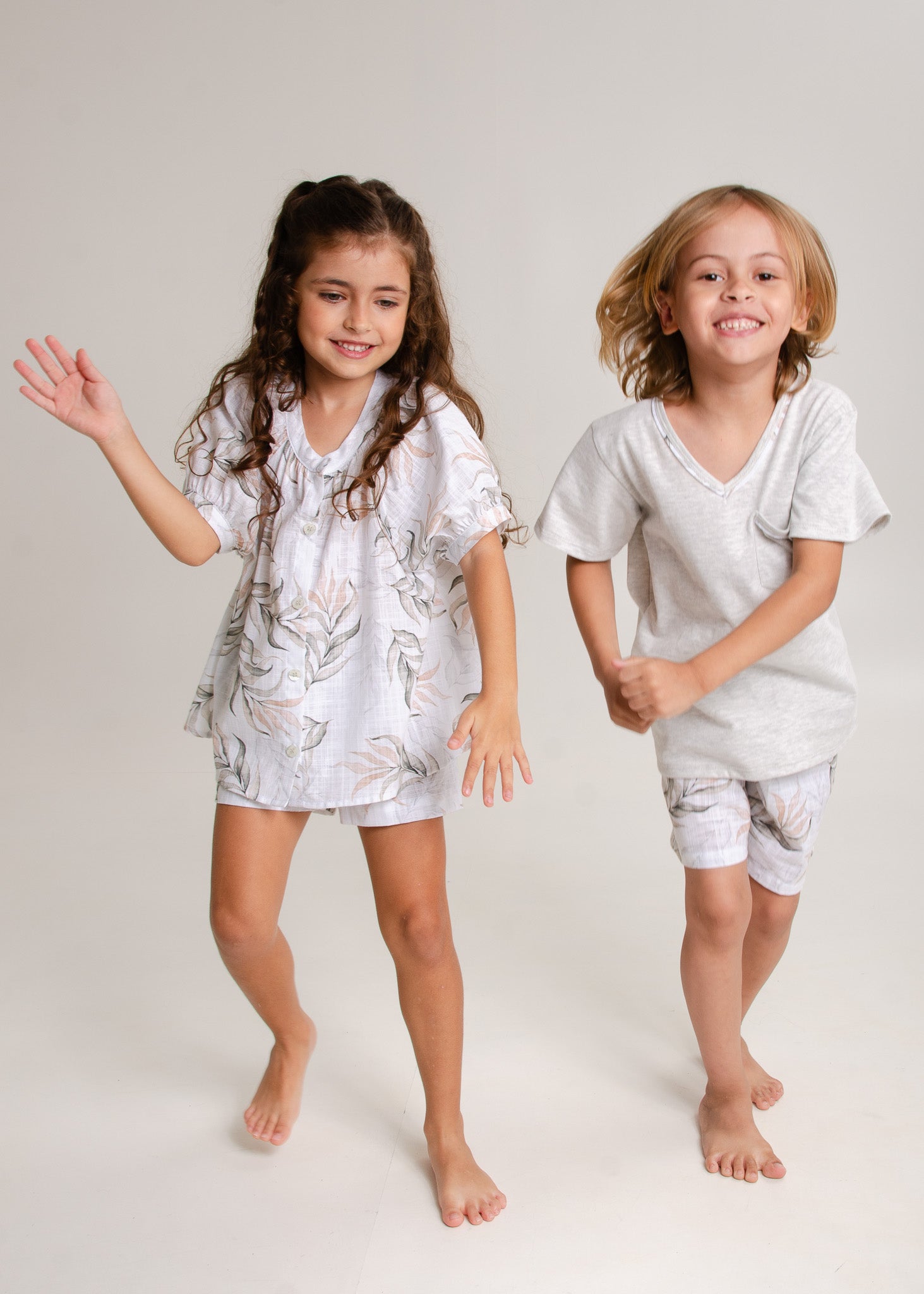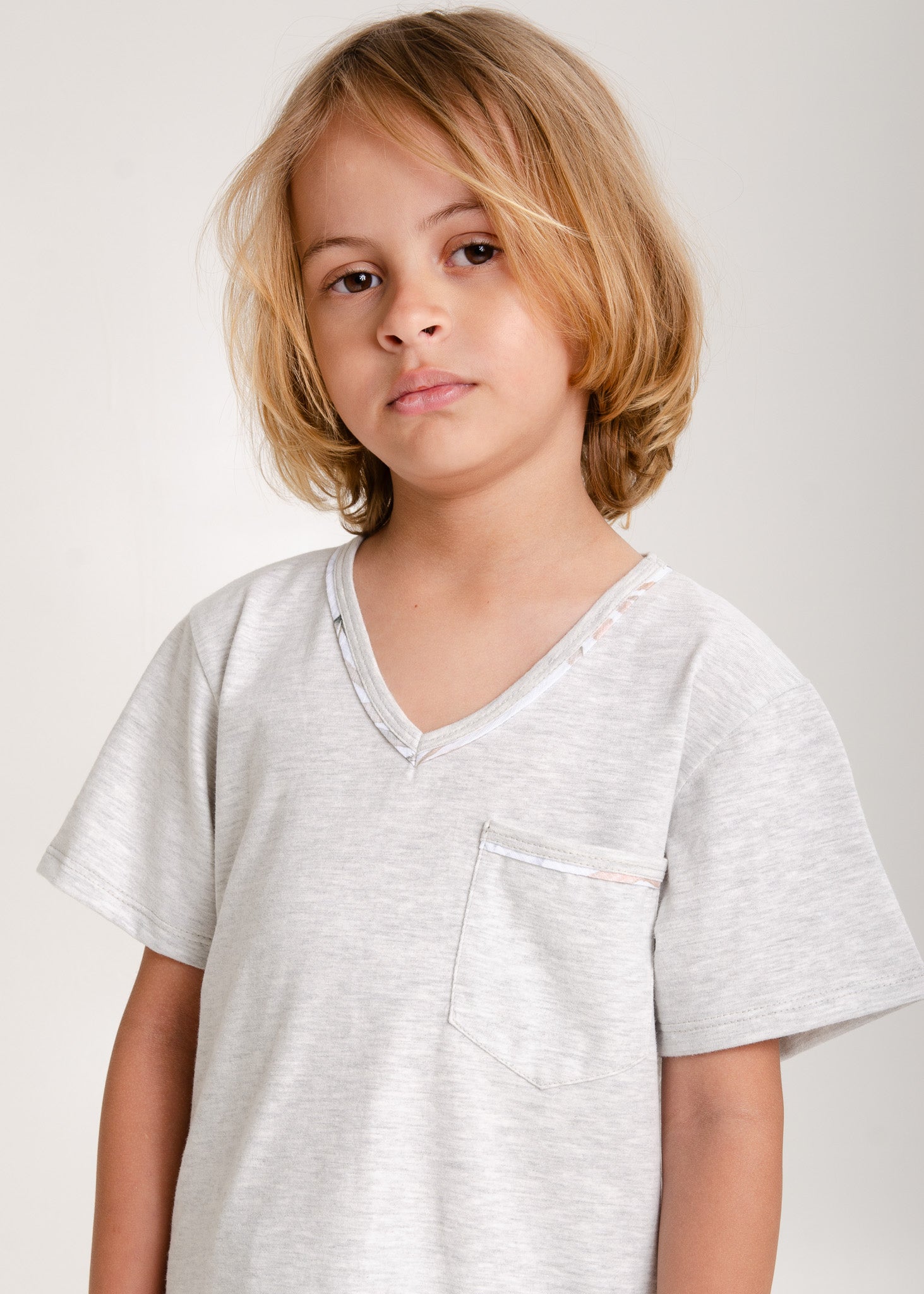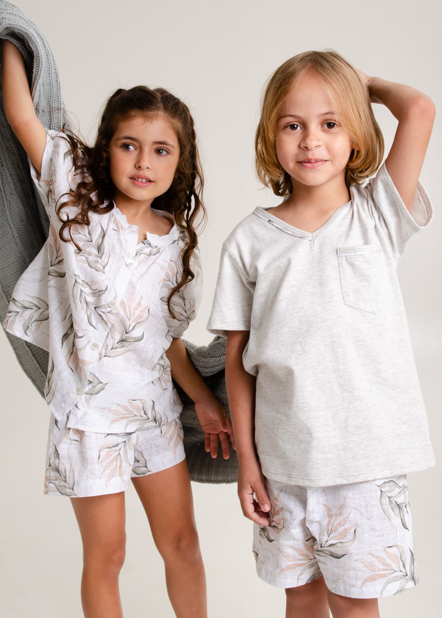 Pijama masculino infantil bermuda em tecido 100% algodão com estampa exclusiva da Coleção Folhagem com elástico na cintura. Blusa em malha mescla com gola v e detalhe na gola e bolsinho.