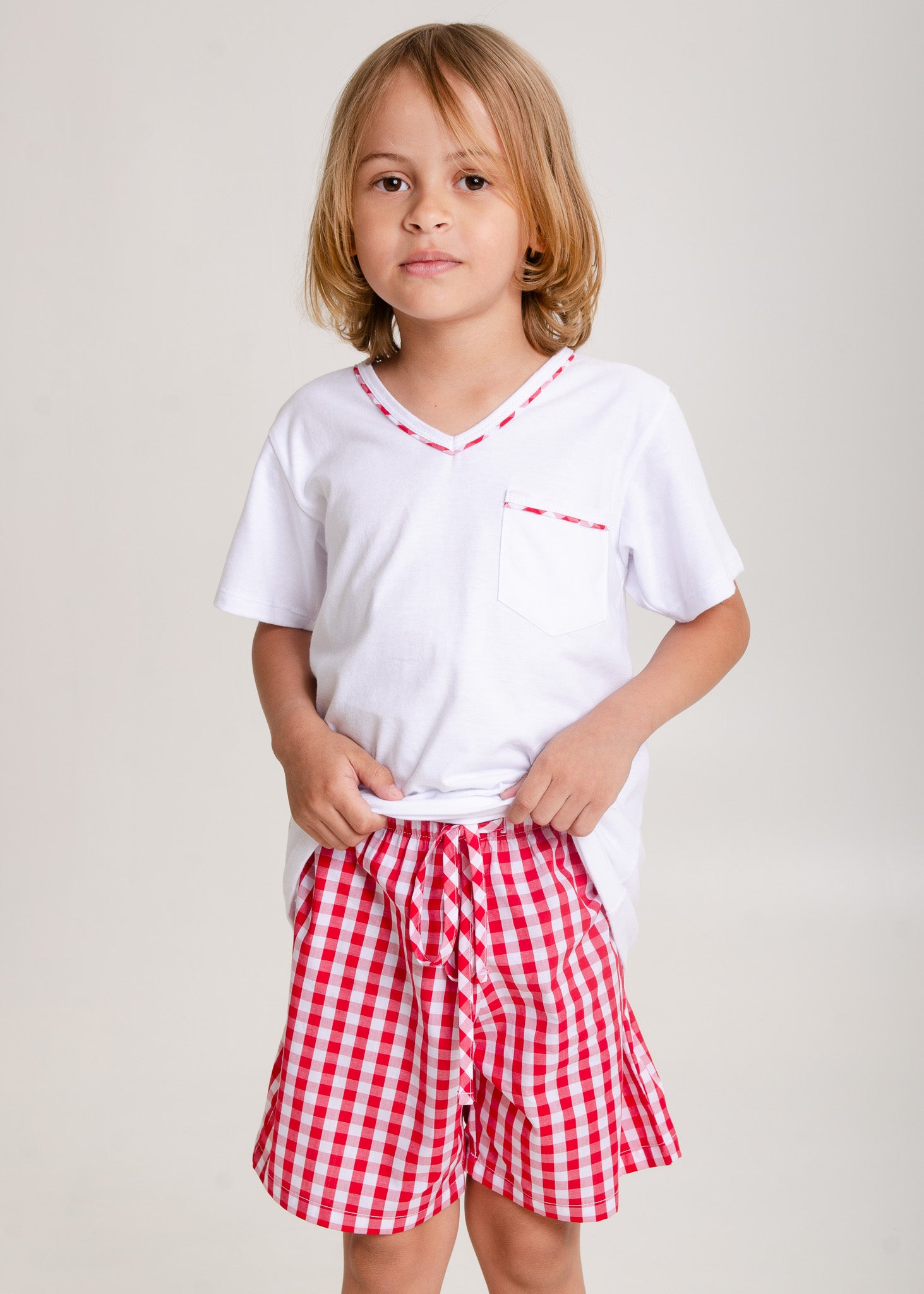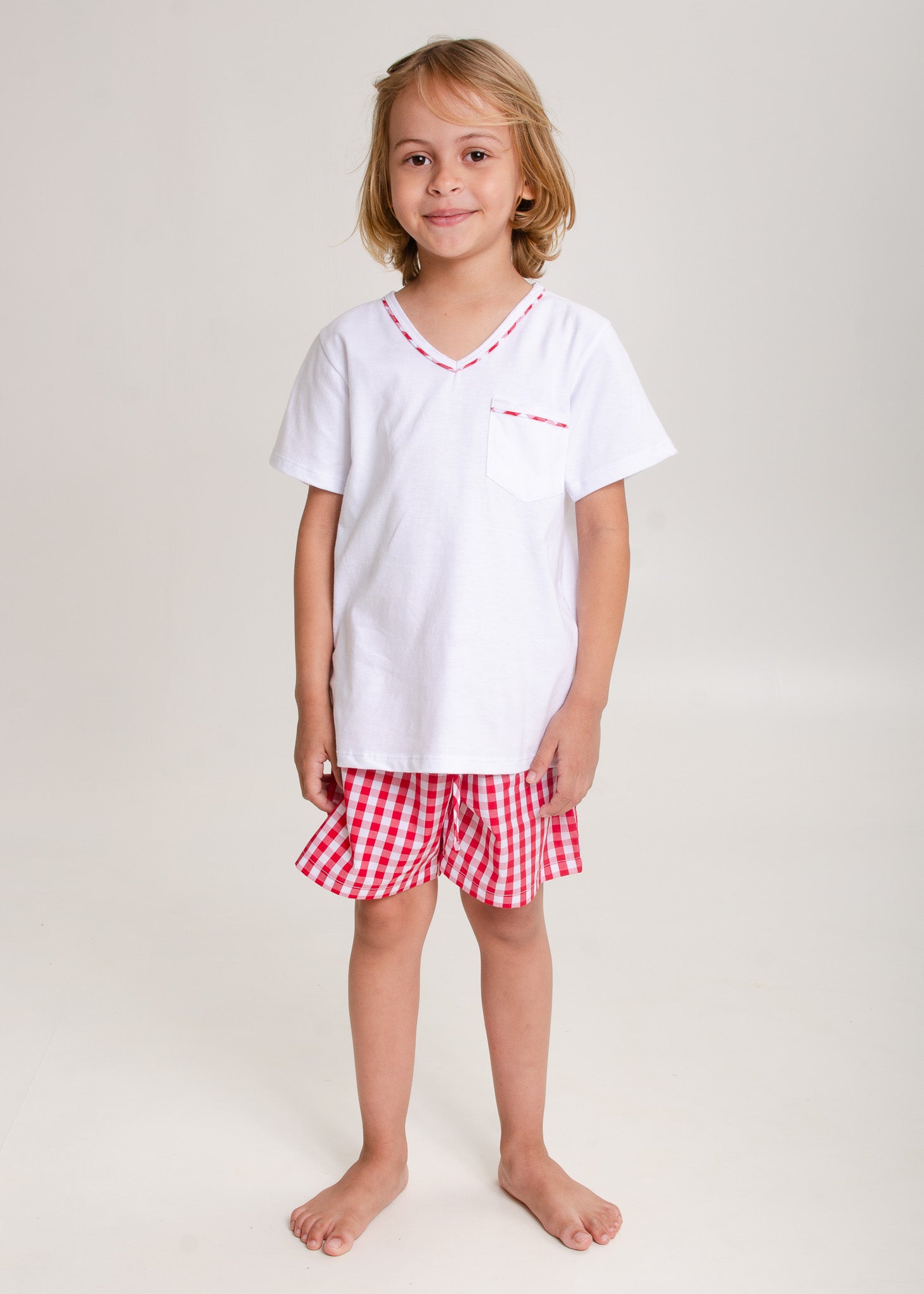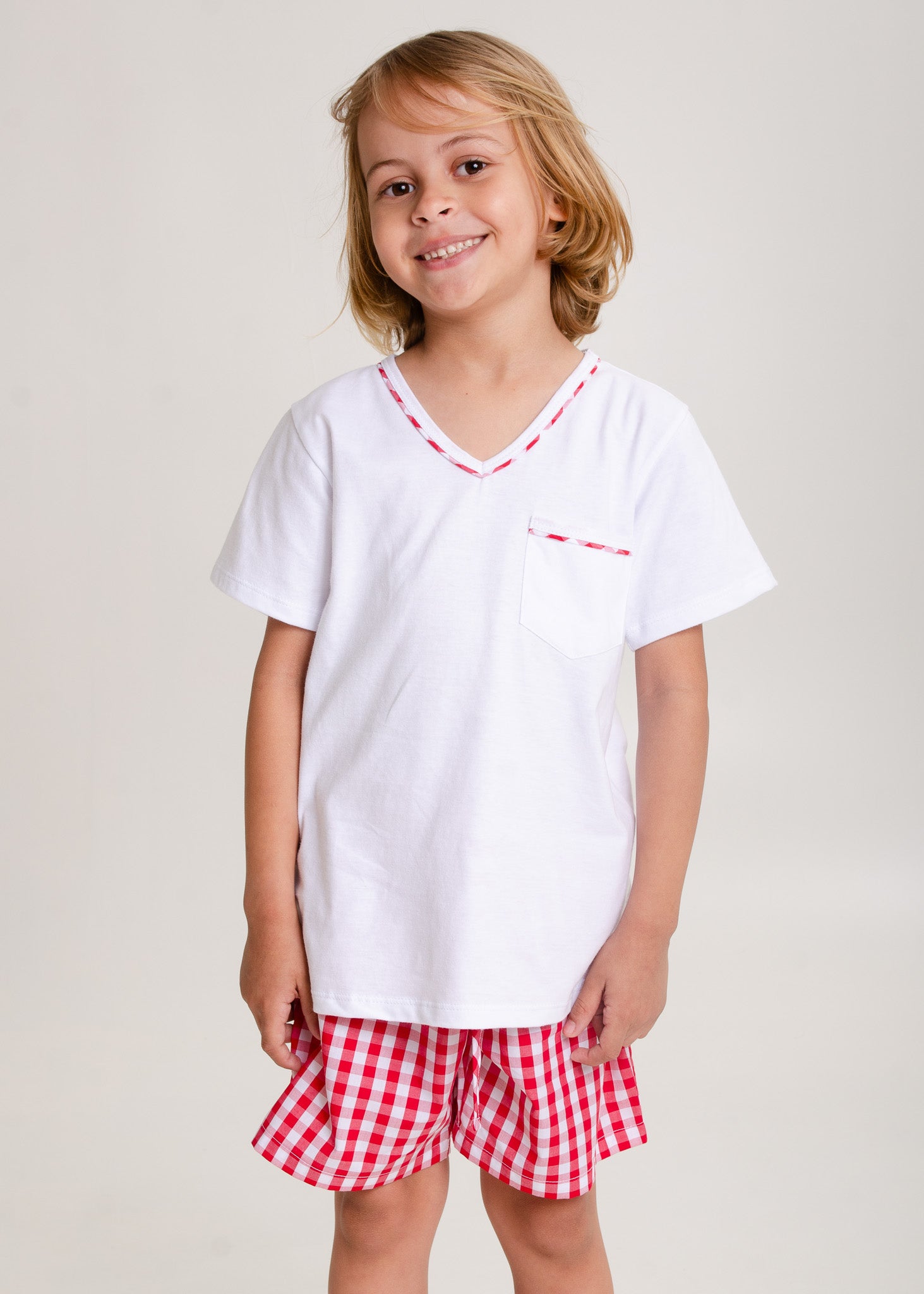 Pijama infantil para os meninos, modelo bermuda em tecido xadrez vichy 100% algodão e blusa em malha 100% algodão, mangas curtas, decote v com detalhe xadrez no decote e no bolsinho.