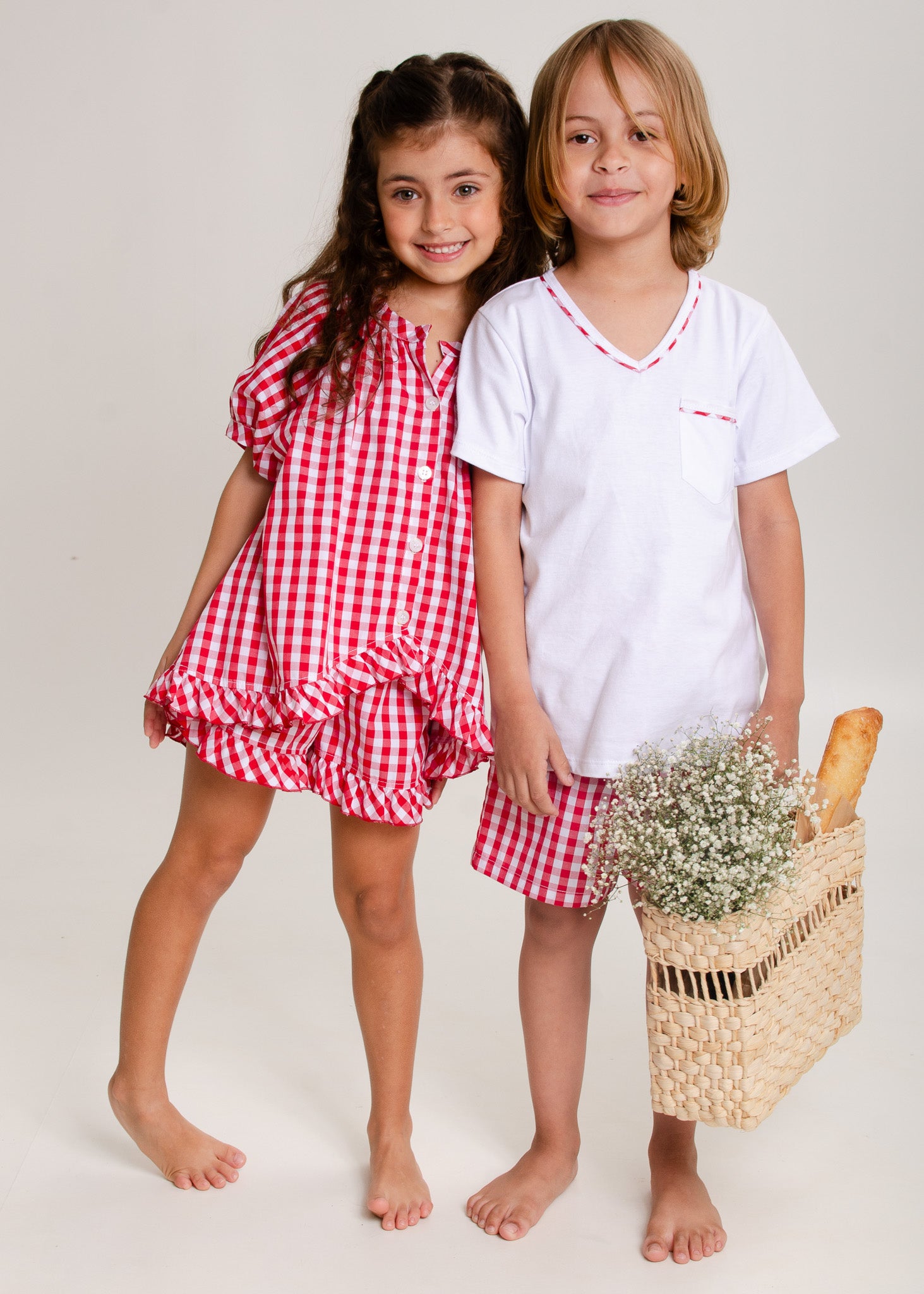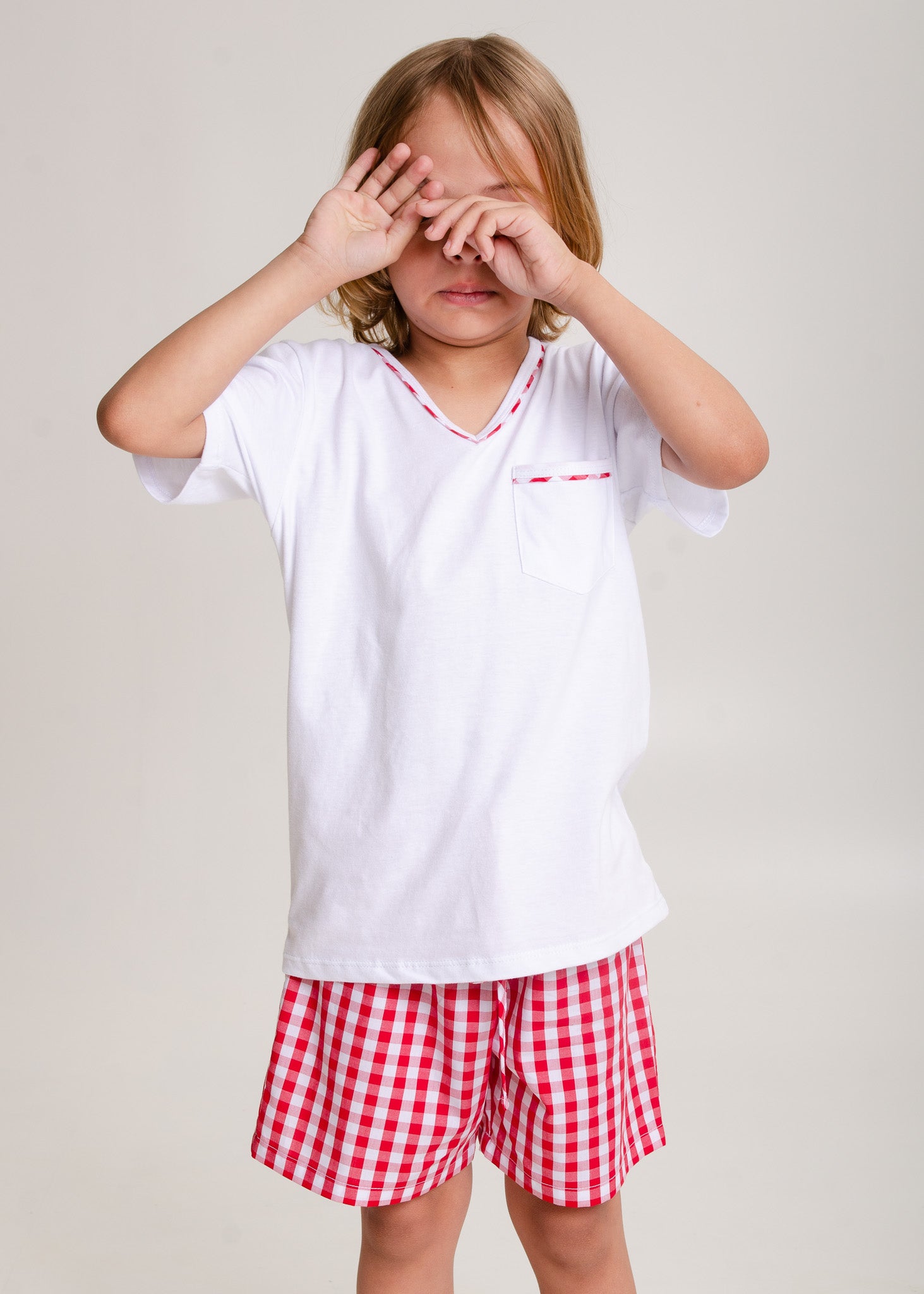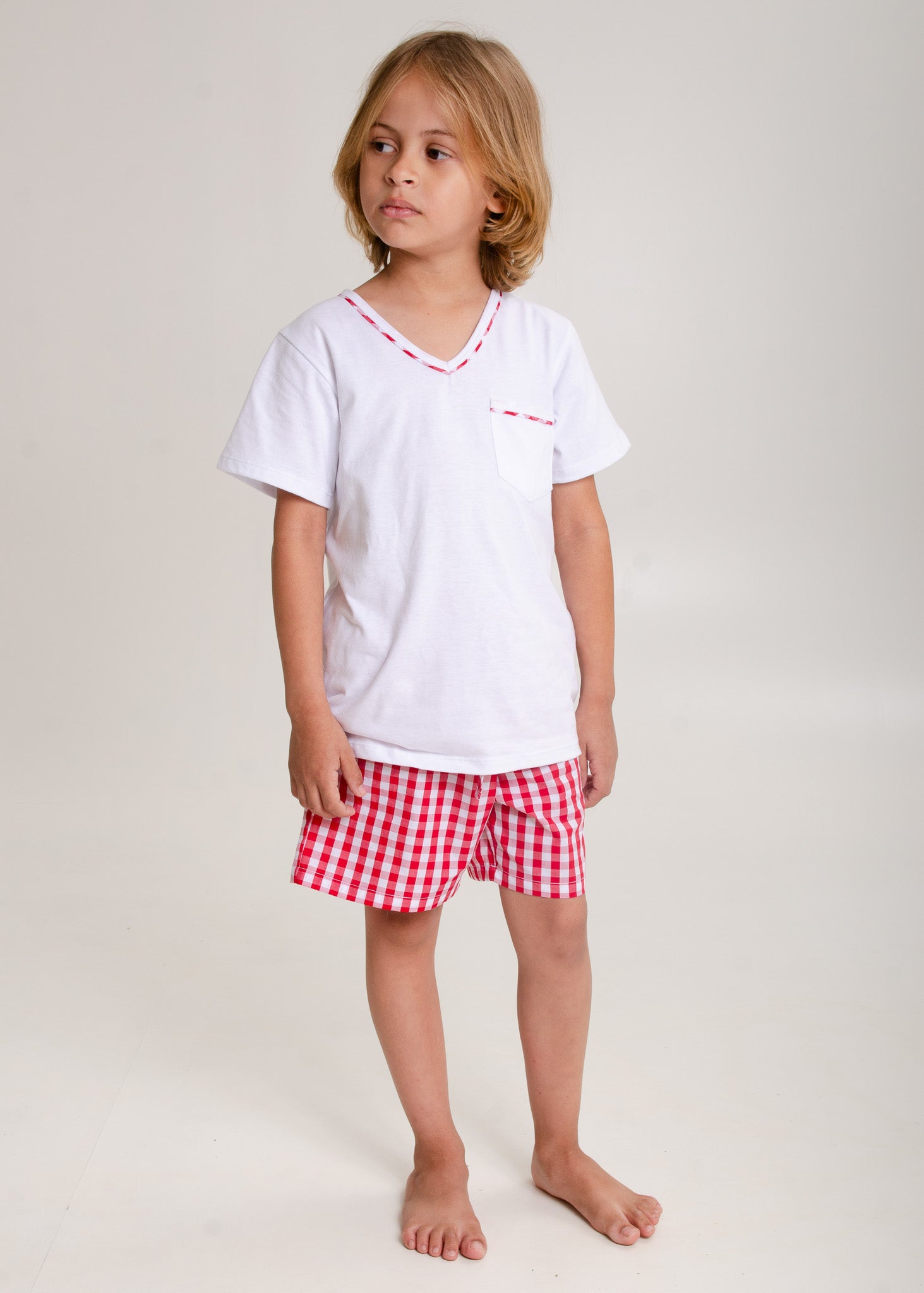 Pijama infantil para os meninos, modelo bermuda em tecido xadrez vichy 100% algodão e blusa em malha 100% algodão, mangas curtas, decote v com detalhe xadrez no decote e no bolsinho.