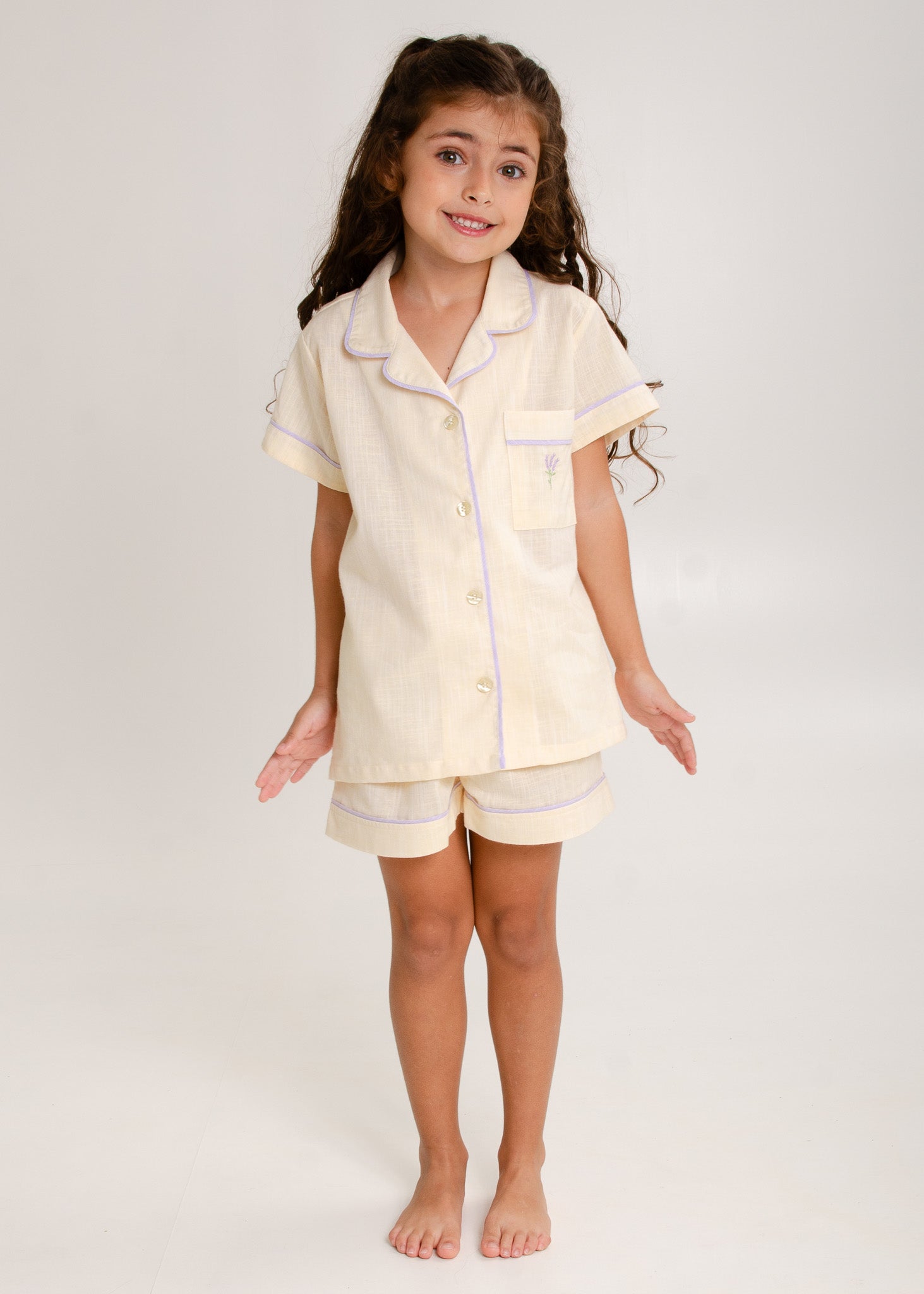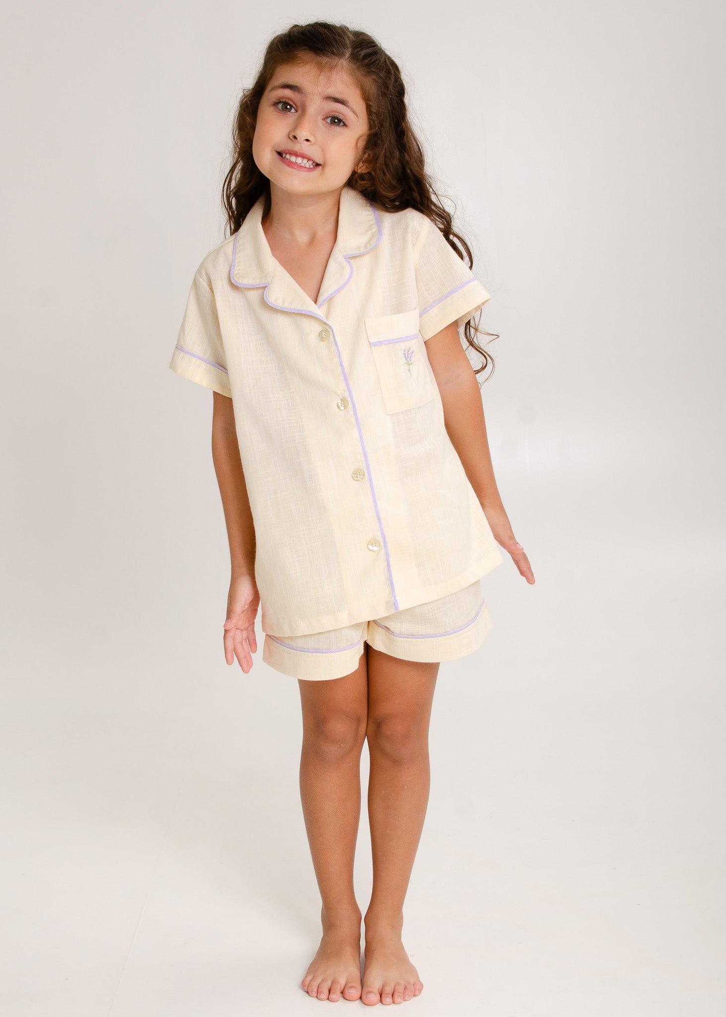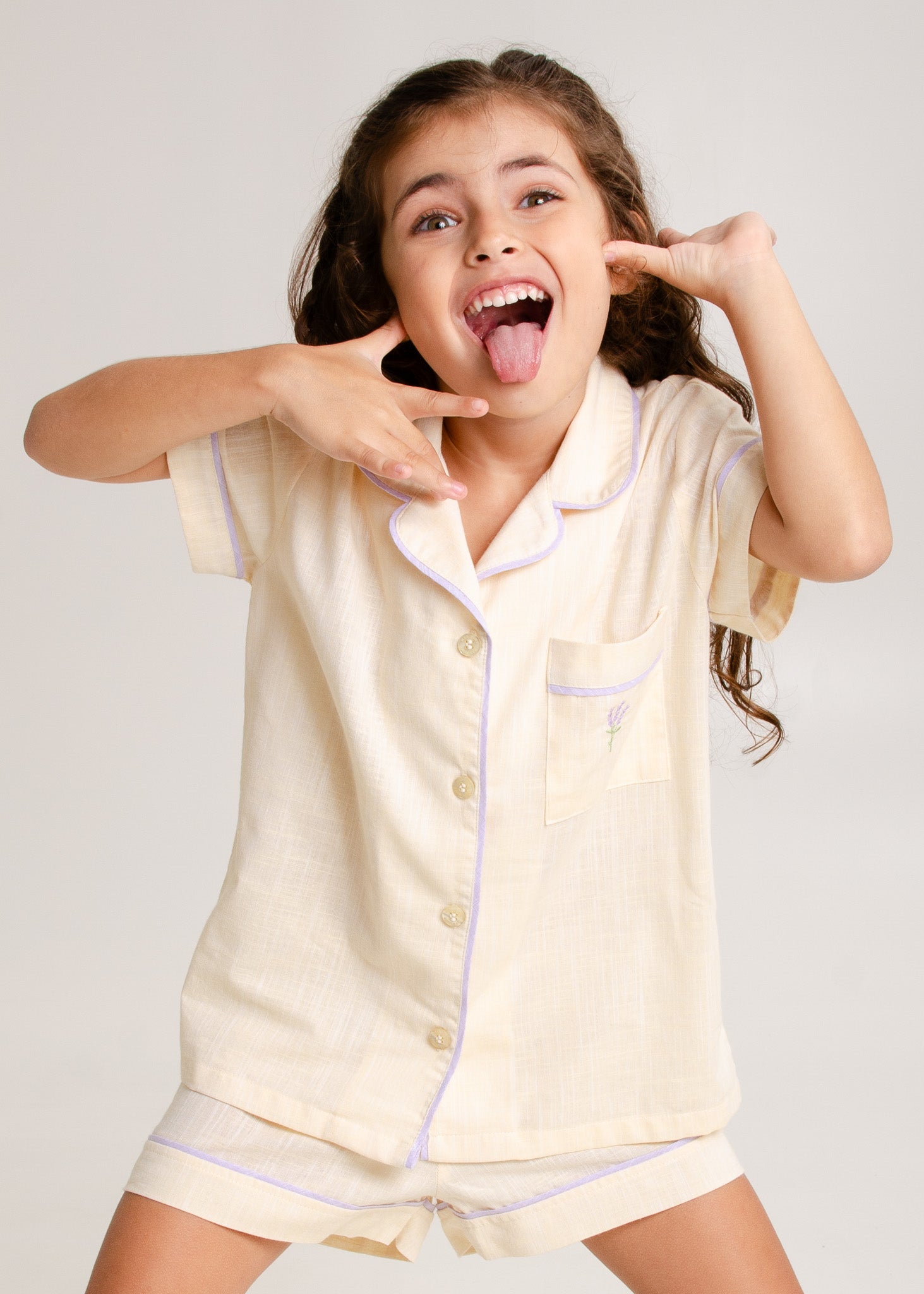 Pijama infantil feminino, em tecido 100% algodão, botões personalizados, e a delicadeza do mini bordado de lavanda no bolsinho. Blusa abotoada, com gola e mangas curtas. Short com elástico na cintura.