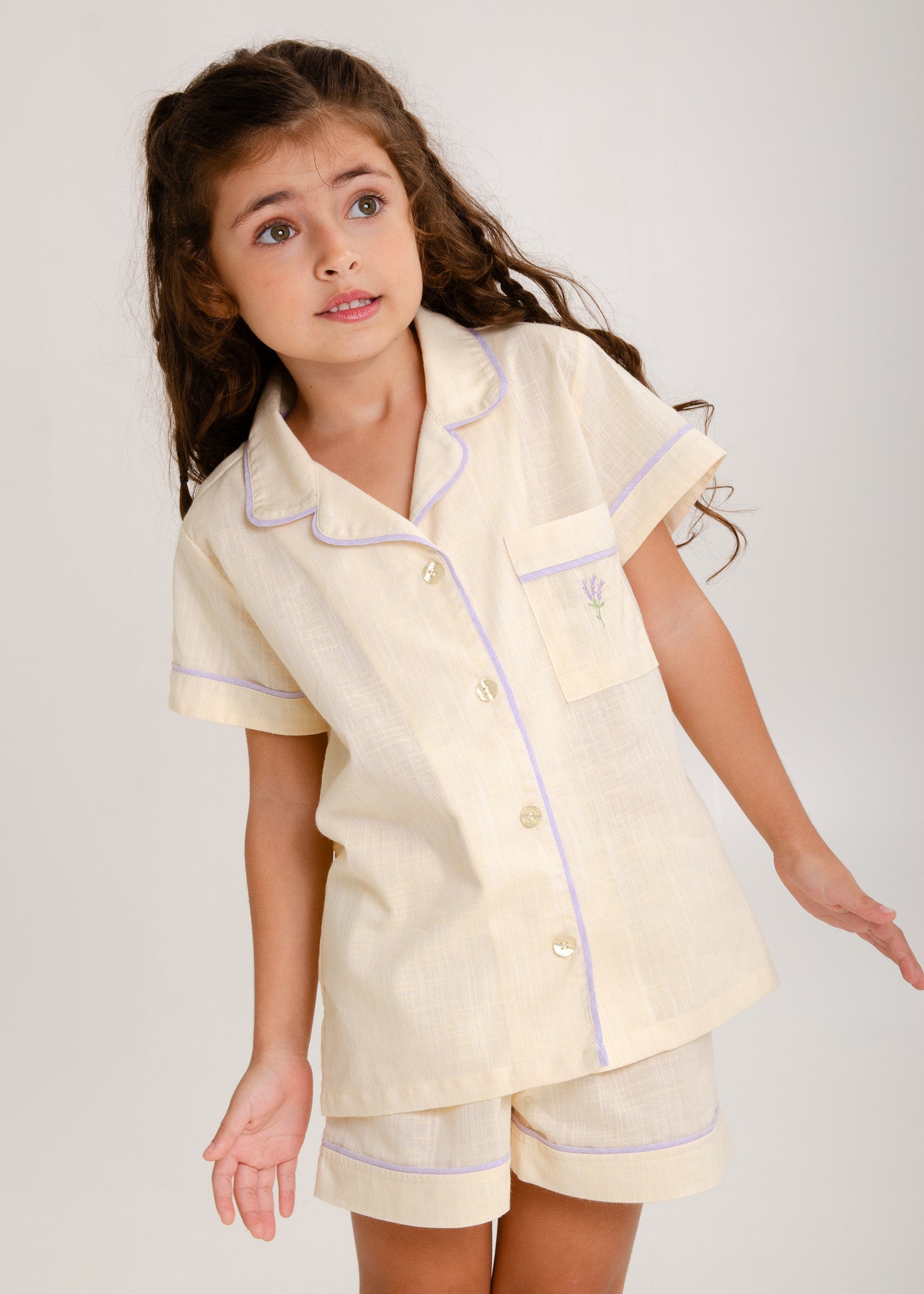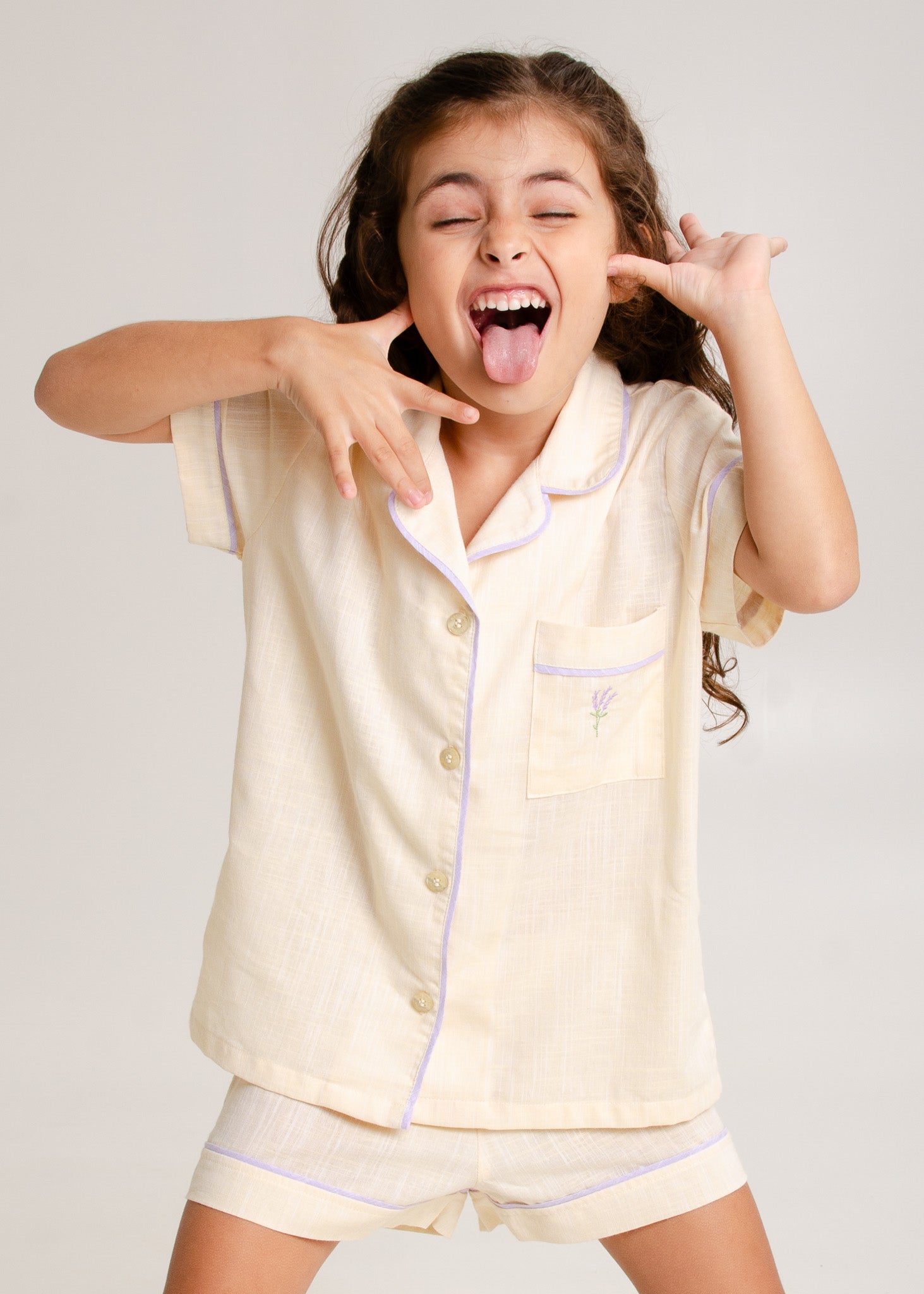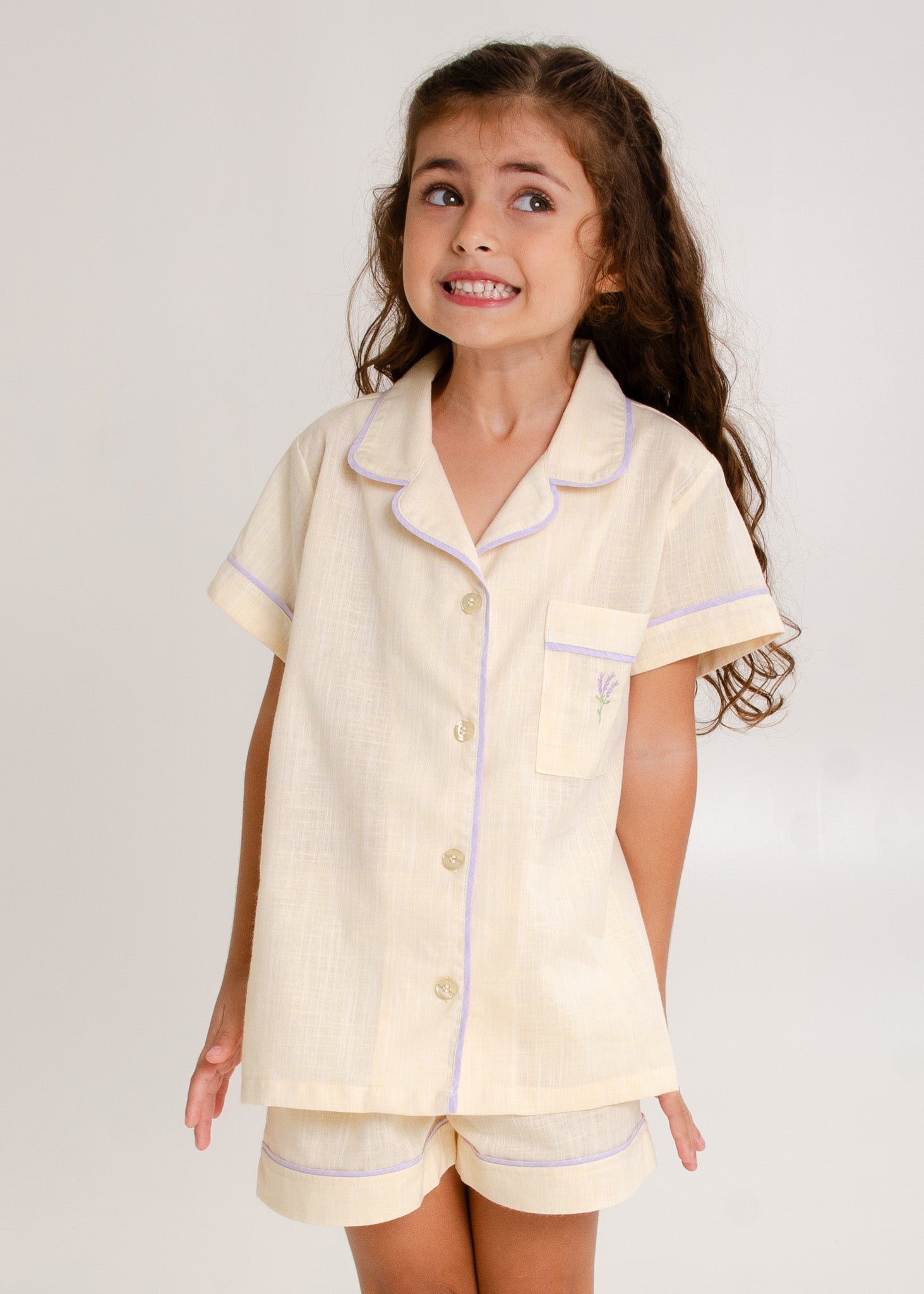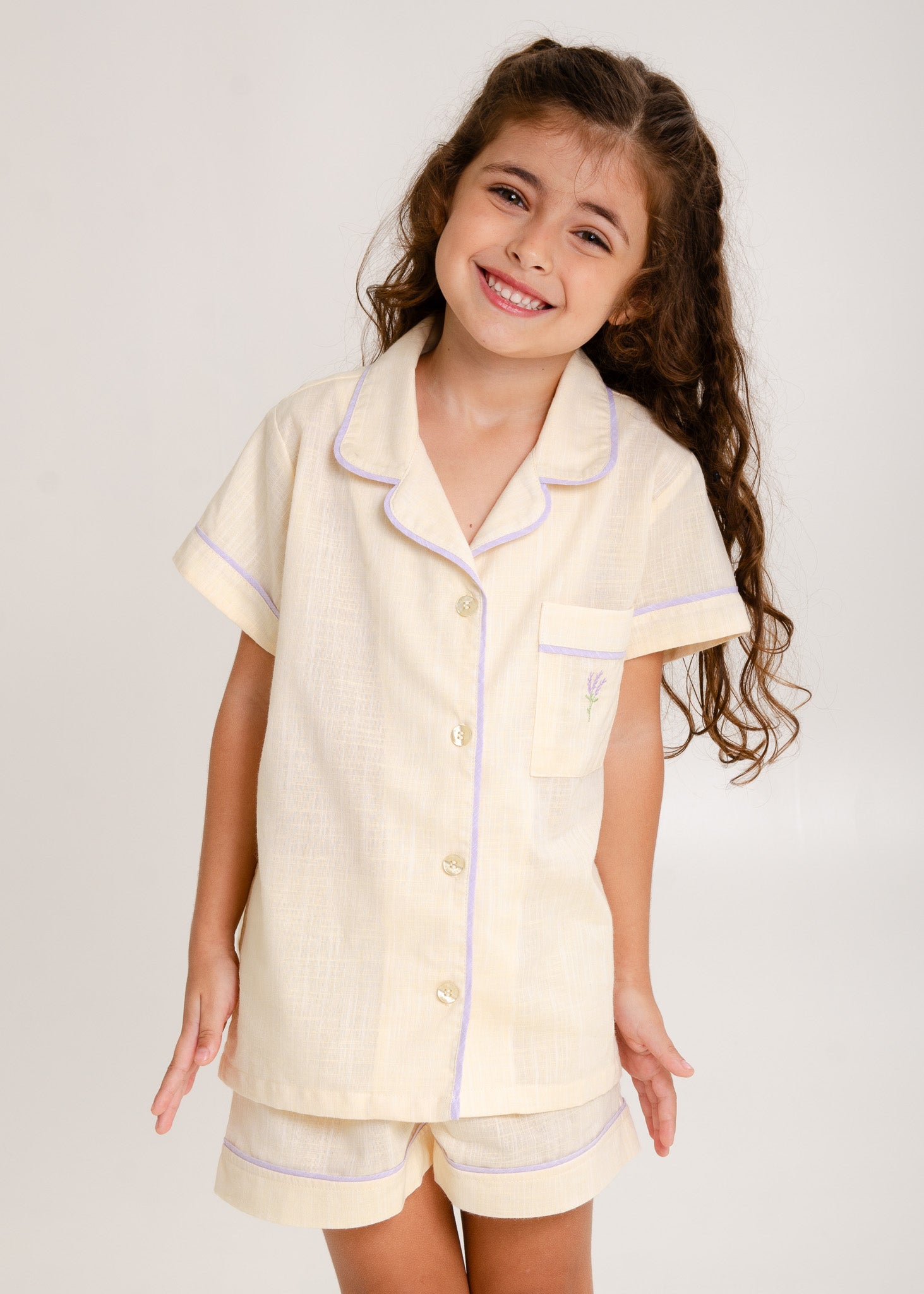 Pijama infantil feminino, em tecido 100% algodão, botões personalizados, e a delicadeza do mini bordado de lavanda no bolsinho. Blusa abotoada, com gola e mangas curtas. Short com elástico na cintura.