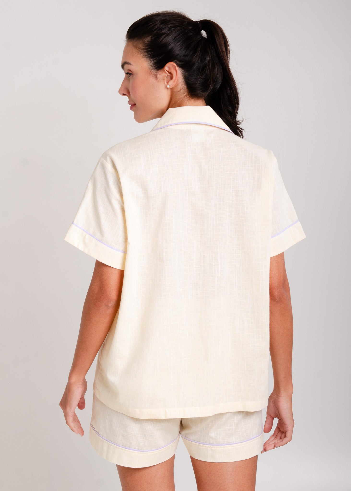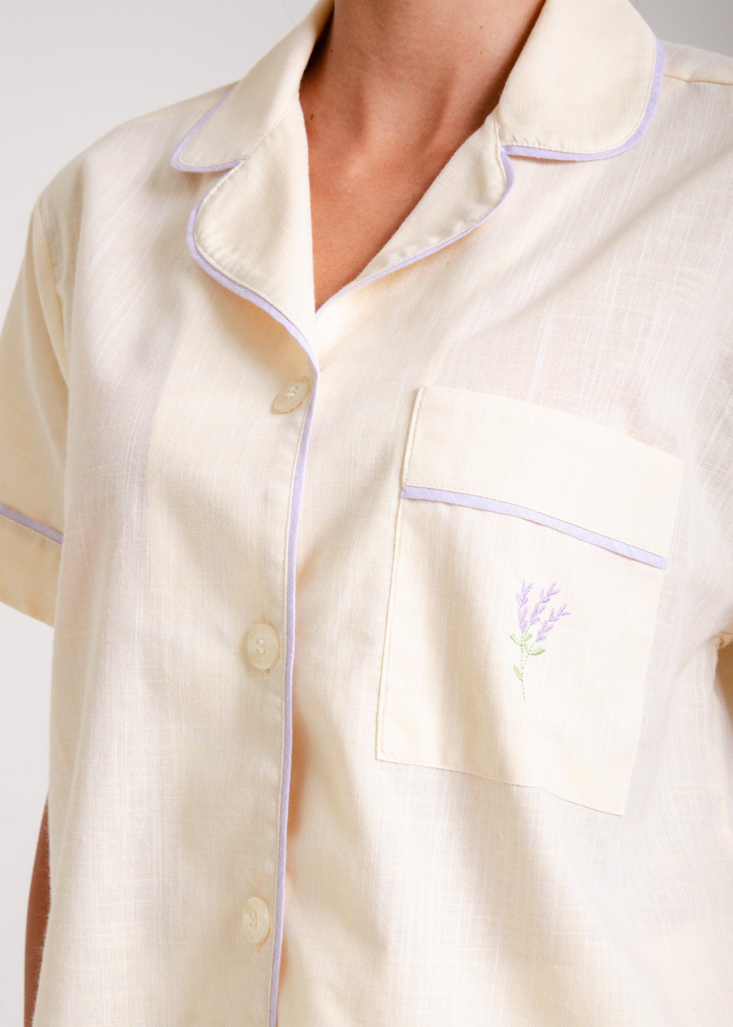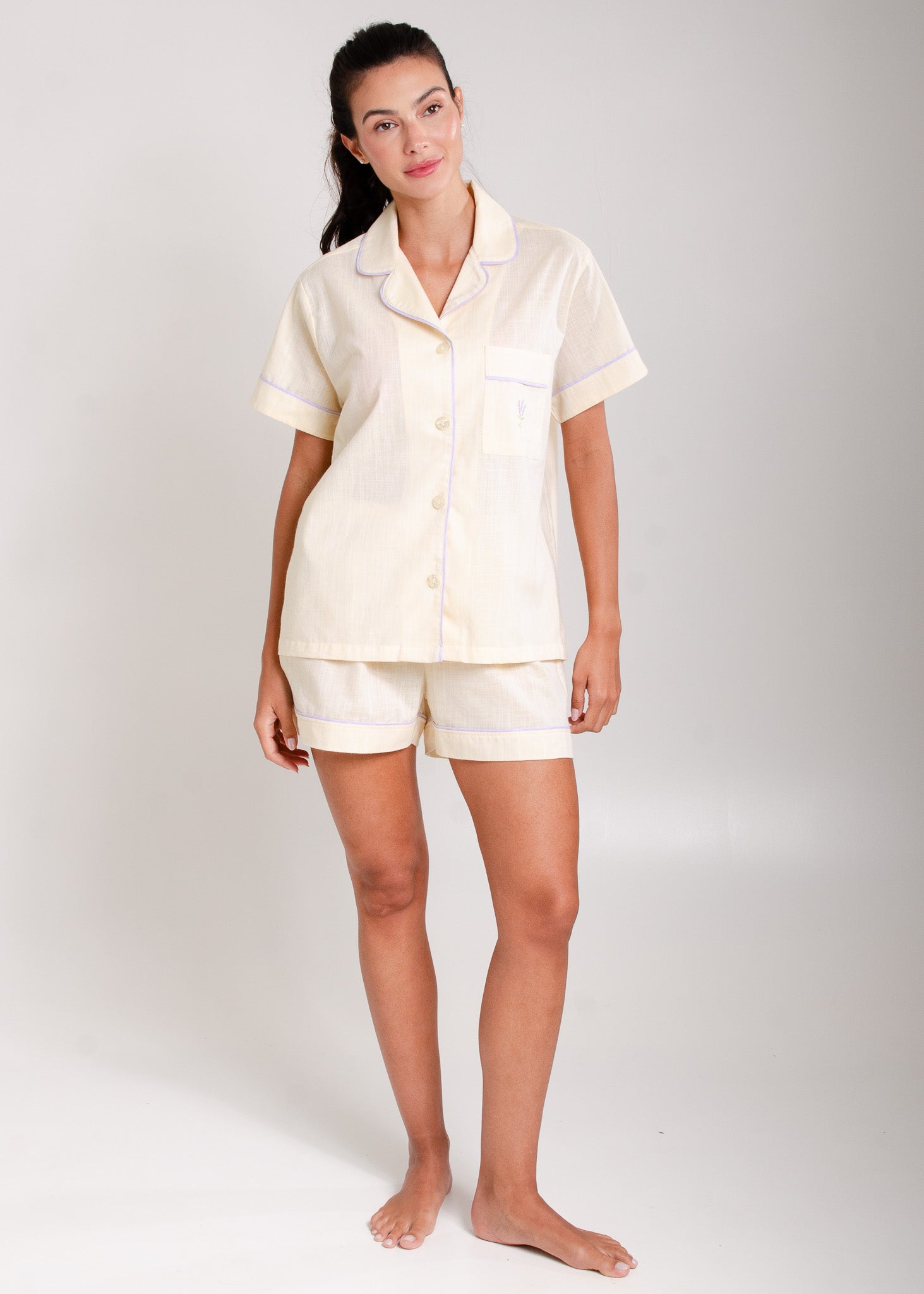 Pijama curto feminino, modelo americano. Blusa mangas curtas com botões, gola e detalhes em vivos contrastantes. Bolsinho lateral com um mini bordado de lavanda. Short com elástico na cintura e bolsos laterais.