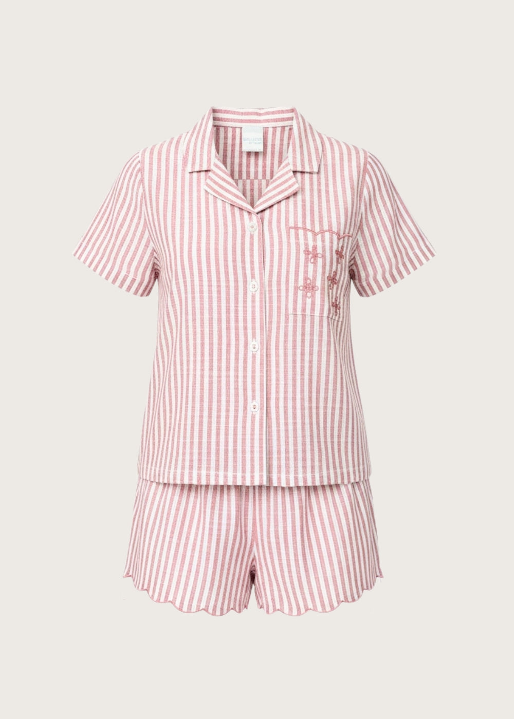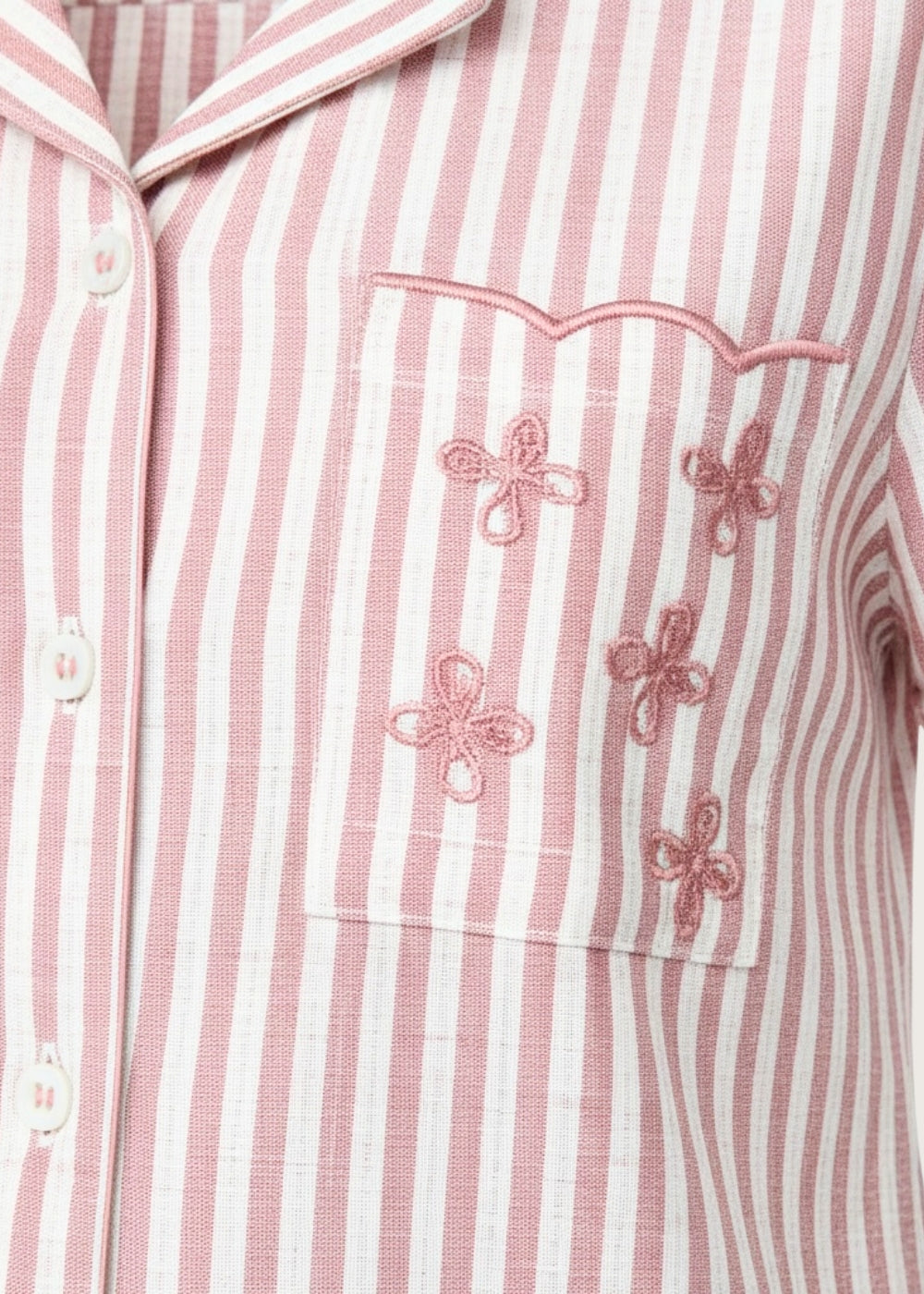 Pijama infantil feminino, em tecido 100% algodão listrado em tons de rosa. Blusa com botões, gola, bolsinho com um lindo bordado exclusivo para a Mrs. Home. Short com elástico na cintura. Combine o pijama infatil com a camisola ou o pijama da mamãe da mesma coleção.