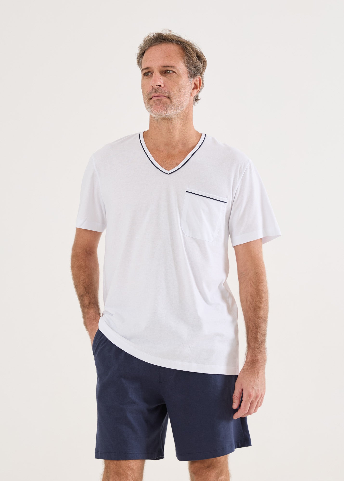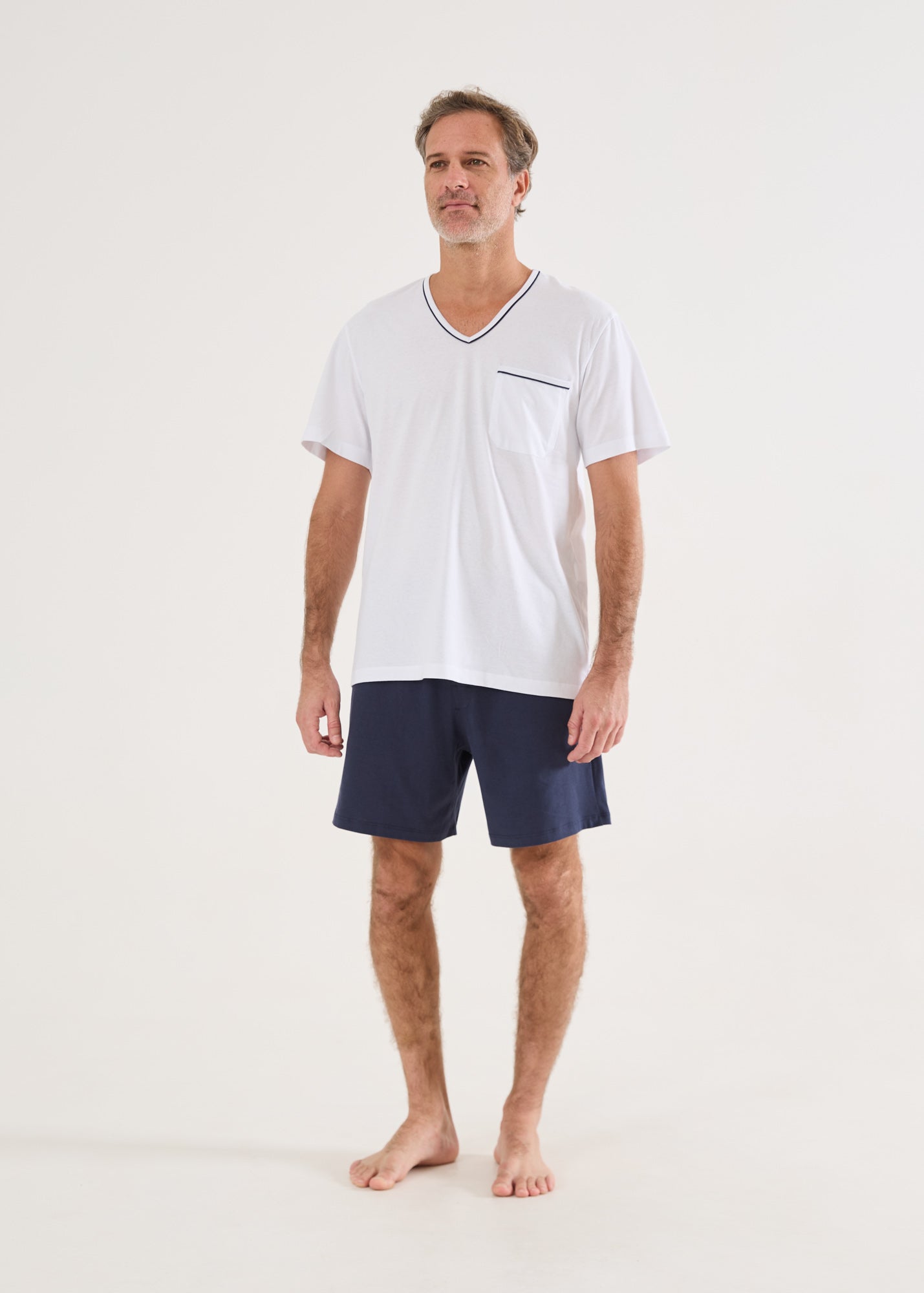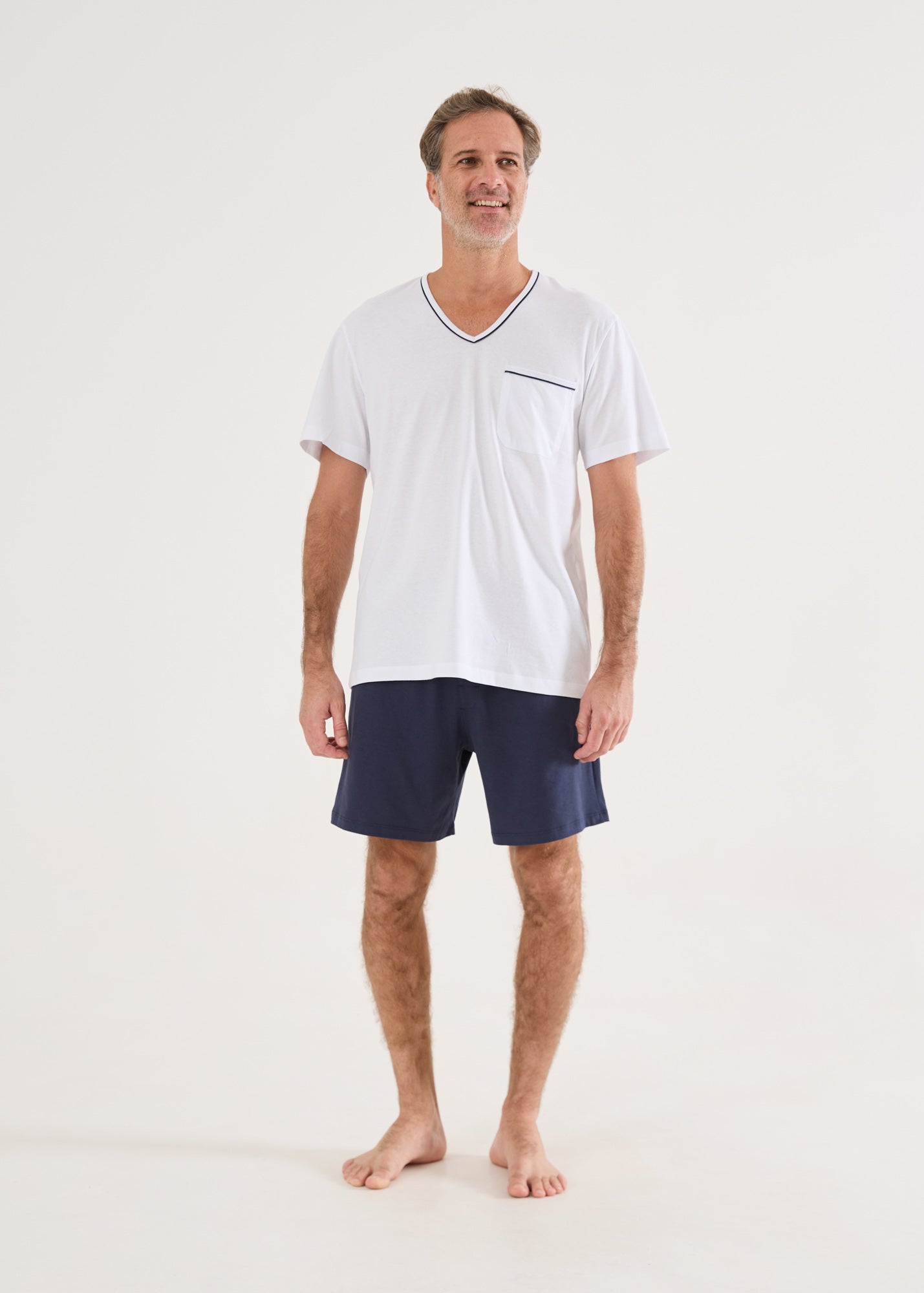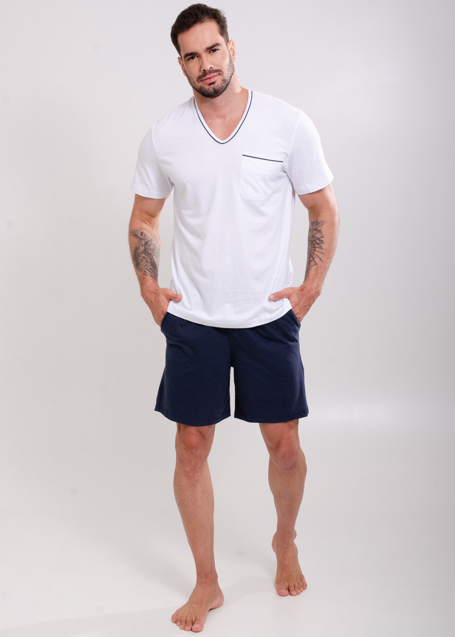 Camiseta branca com decote em V e detalhe na gola e no bolso lateral combinando com a bermuda. Bermuda marinho, com bolsos laterais e elástico na cintura.