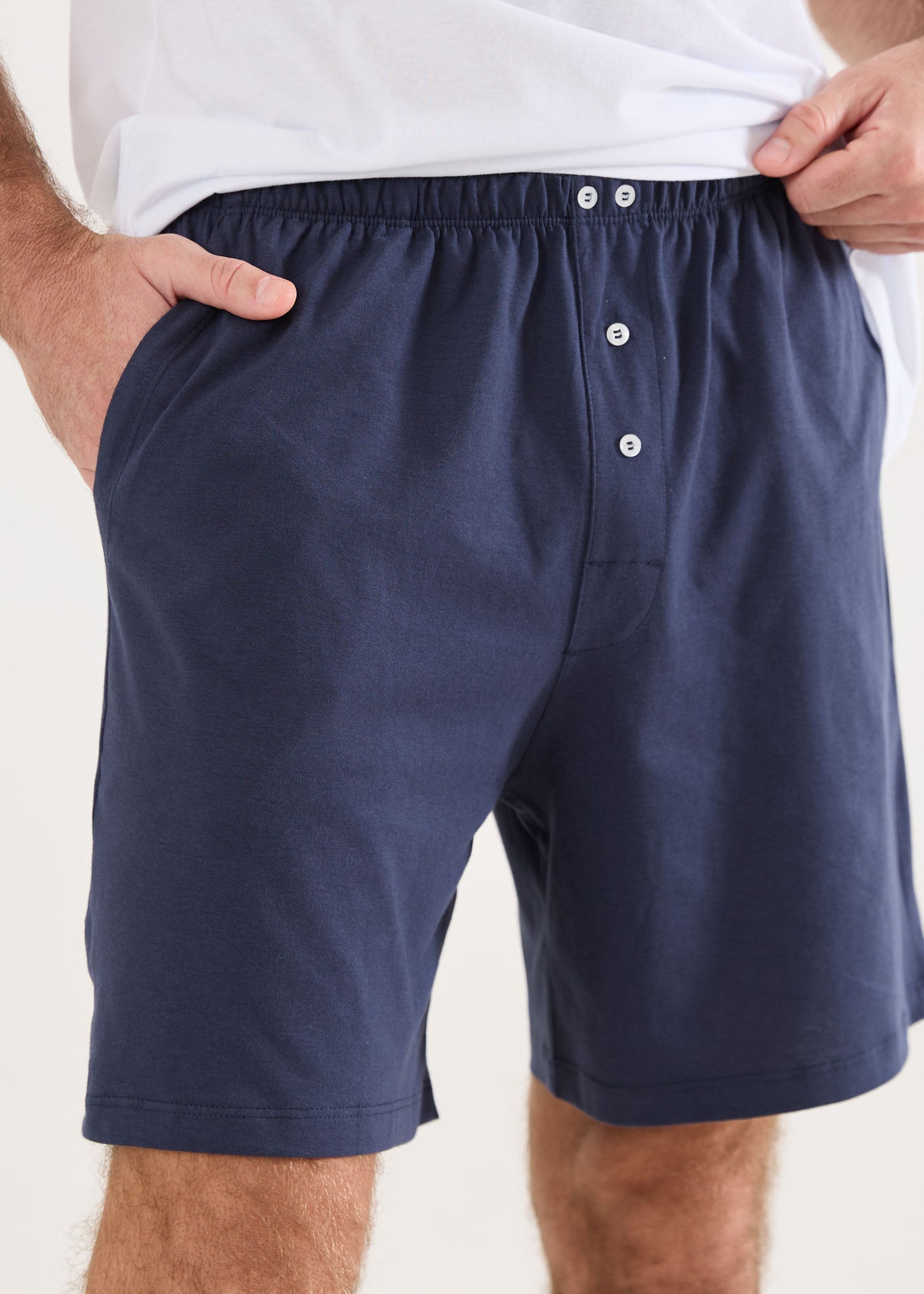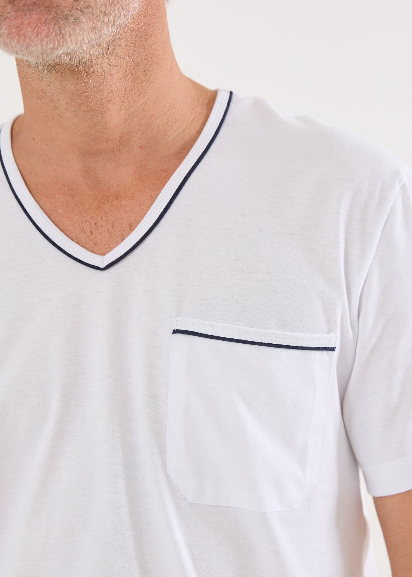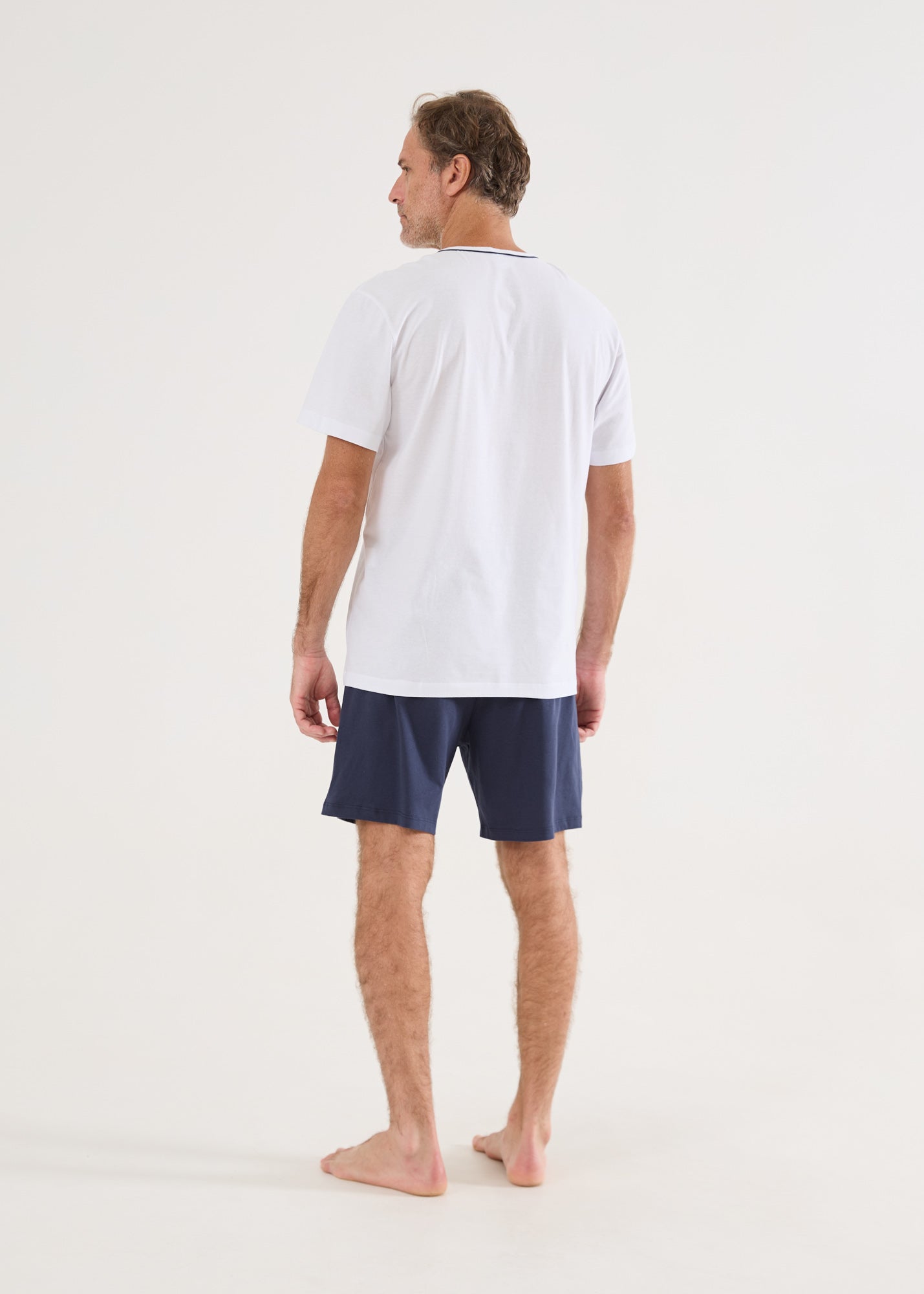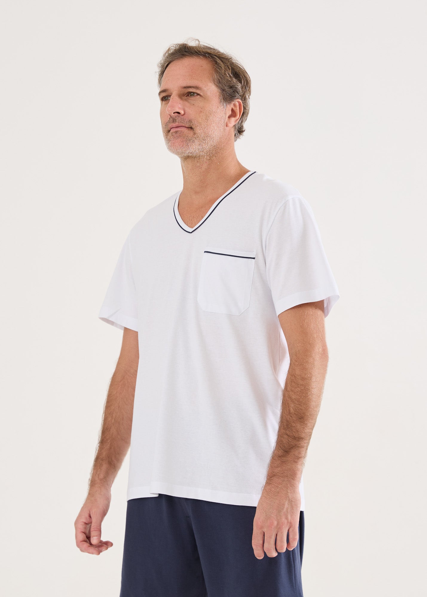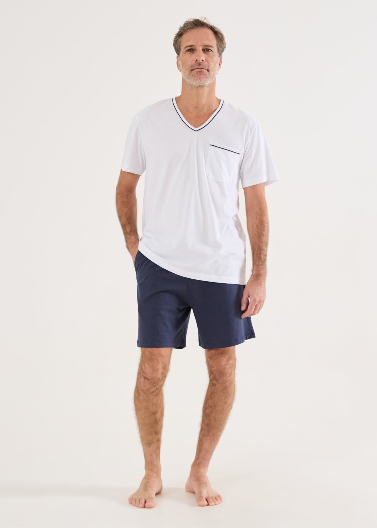 Camiseta branca com decote em V e detalhe na gola e no bolso lateral combinando com a bermuda. Bermuda marinho, com bolsos laterais e elástico na cintura.