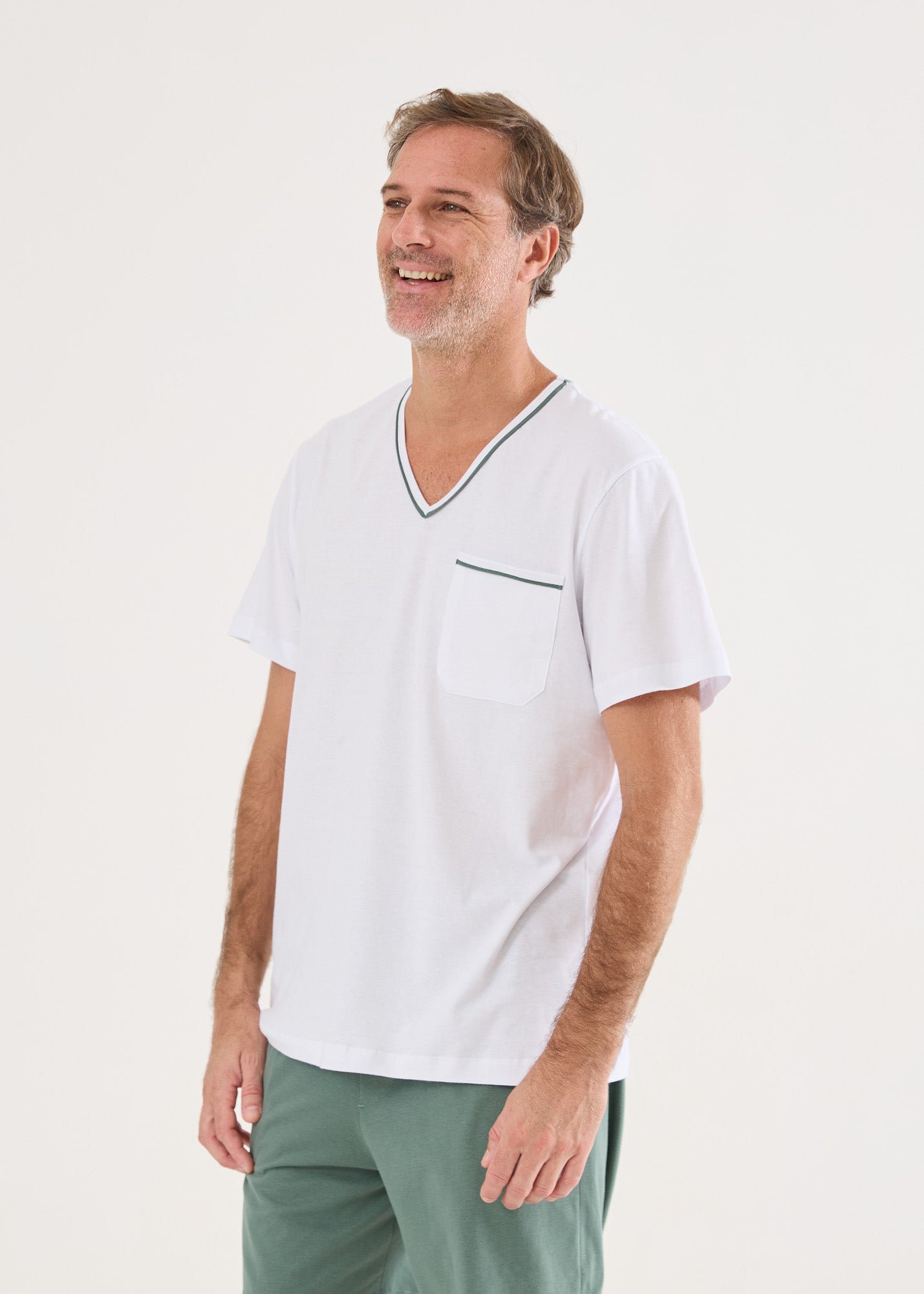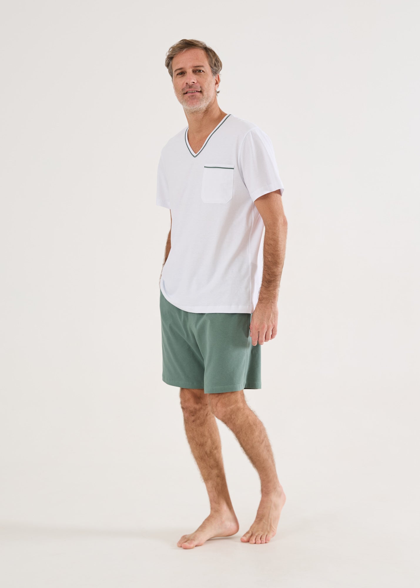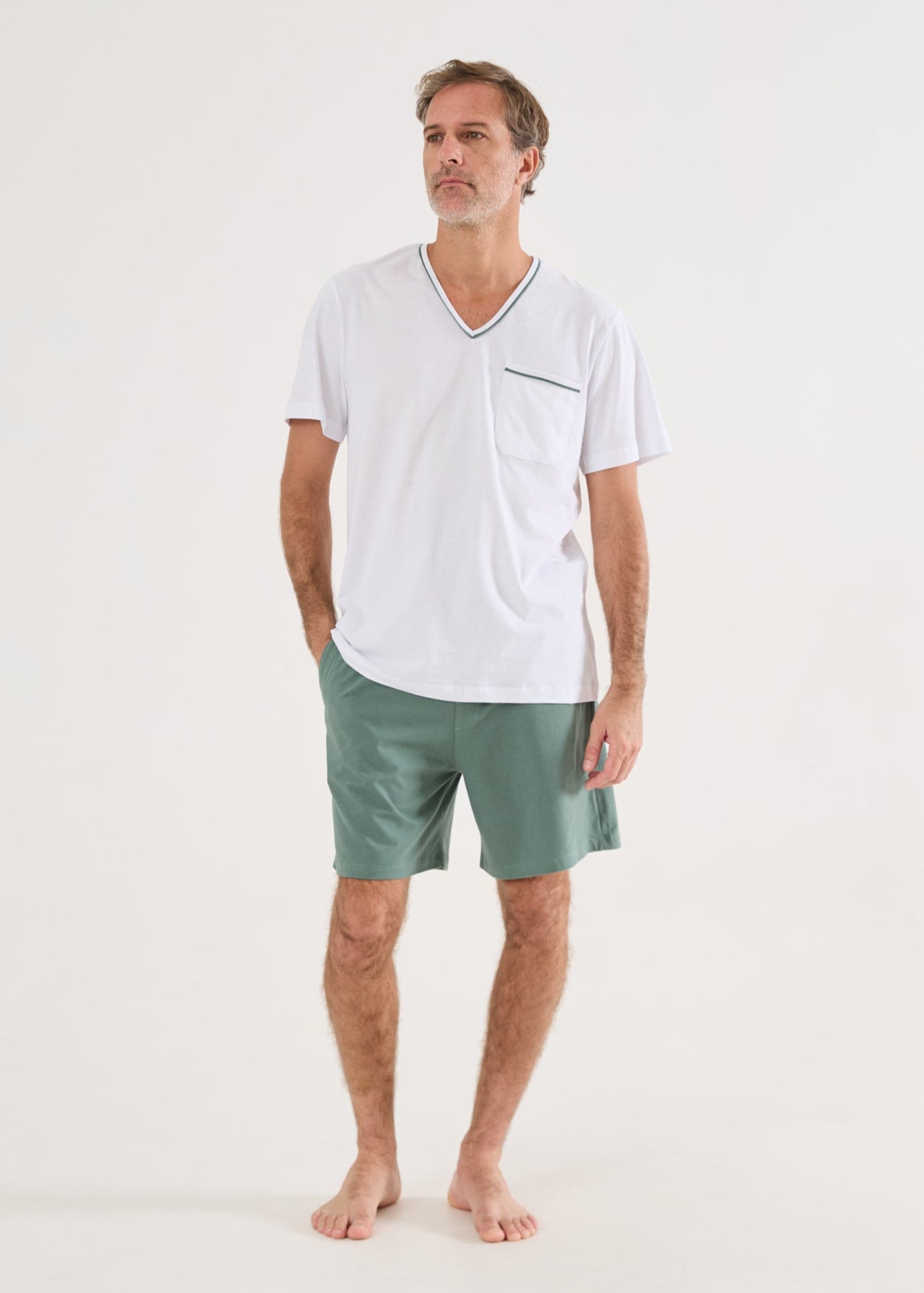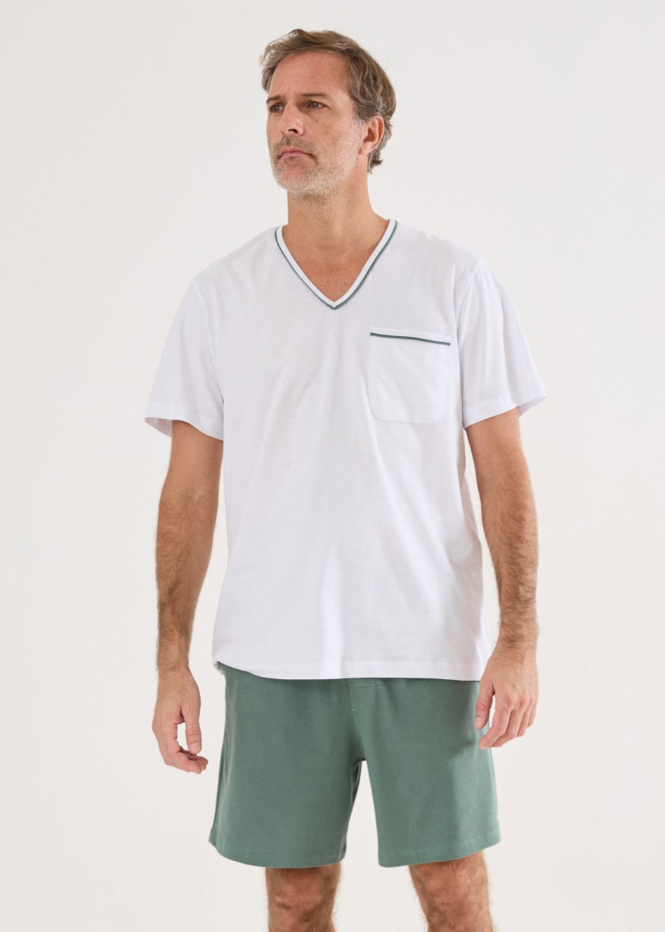 Camiseta branca com decote em V e detalhe na gola e no bolso lateral combinando com a bermuda. Bermuda em malha verde seco, com bolsos laterais e elástico na cintura.