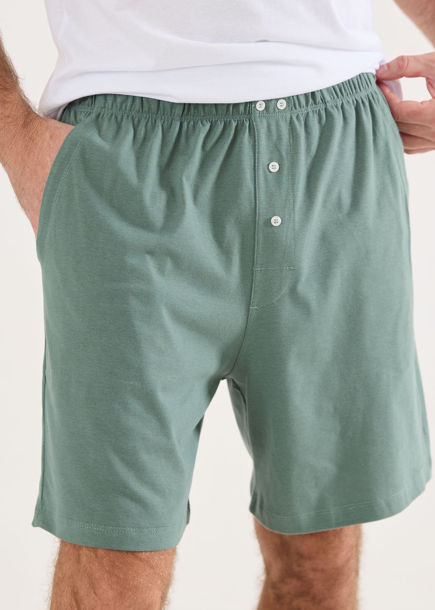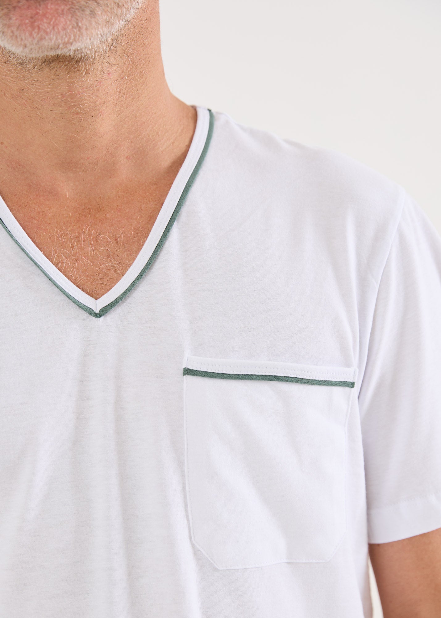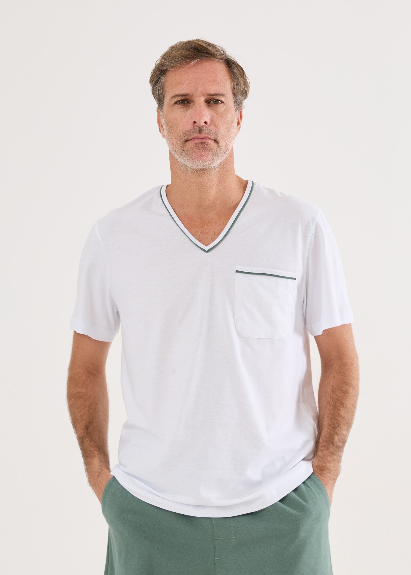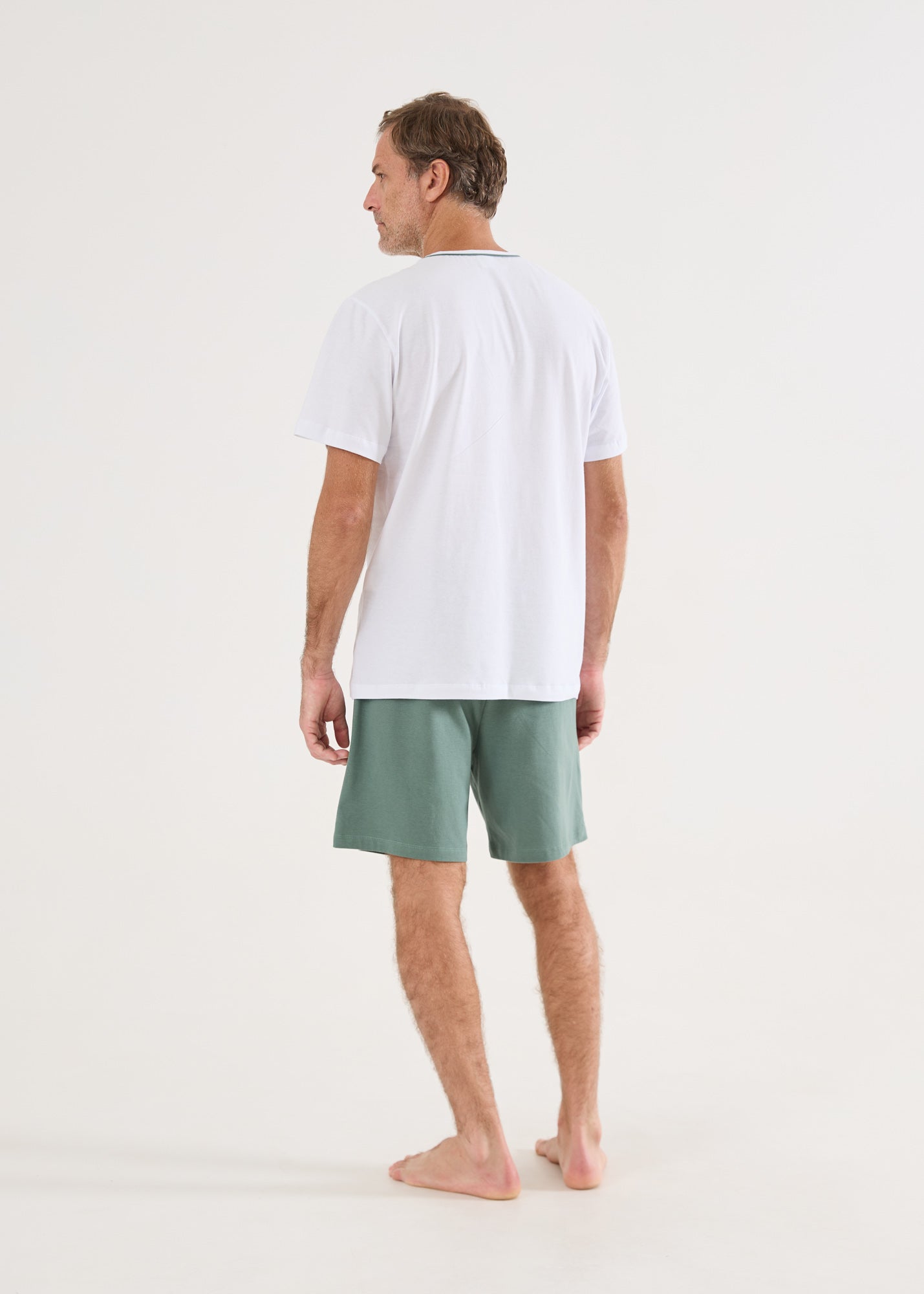 Camiseta branca com decote em V e detalhe na gola e no bolso lateral combinando com a bermuda. Bermuda em malha verde seco, com bolsos laterais e elástico na cintura.