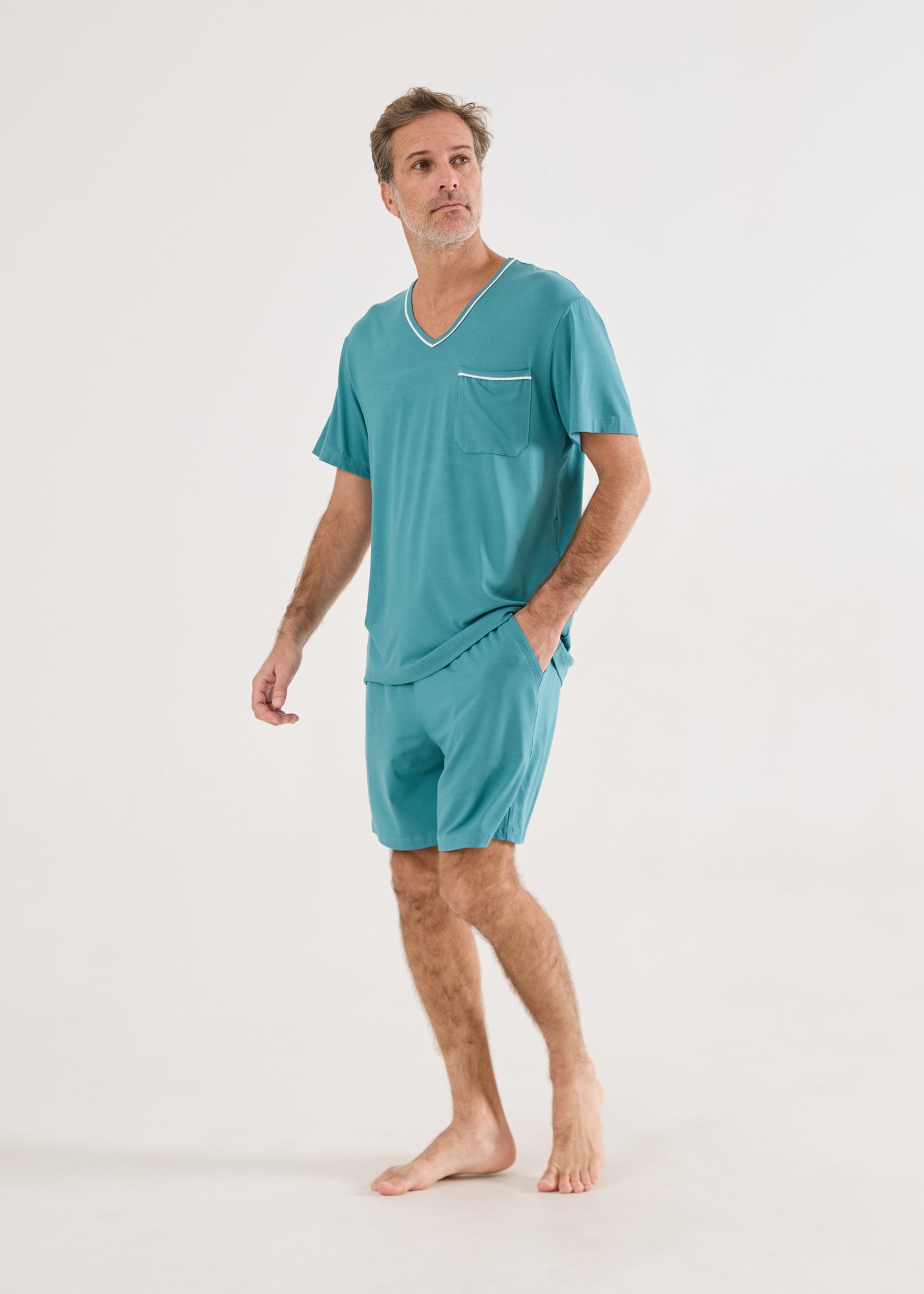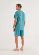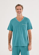 Pijama curto masculino, bermuda com elástico na cintura, bolsos e blusa mangas curtas e decote V. Detalhe em vivo off-white na gola e bolso. Num tom azul esverdeado, essa é a cor do ano de 2026! O pijama Léo traz o conforto da malha visco com seu toque inigualável, macio e sedoso em contato com a pele. Experimente e você vai querer um de cada cor!