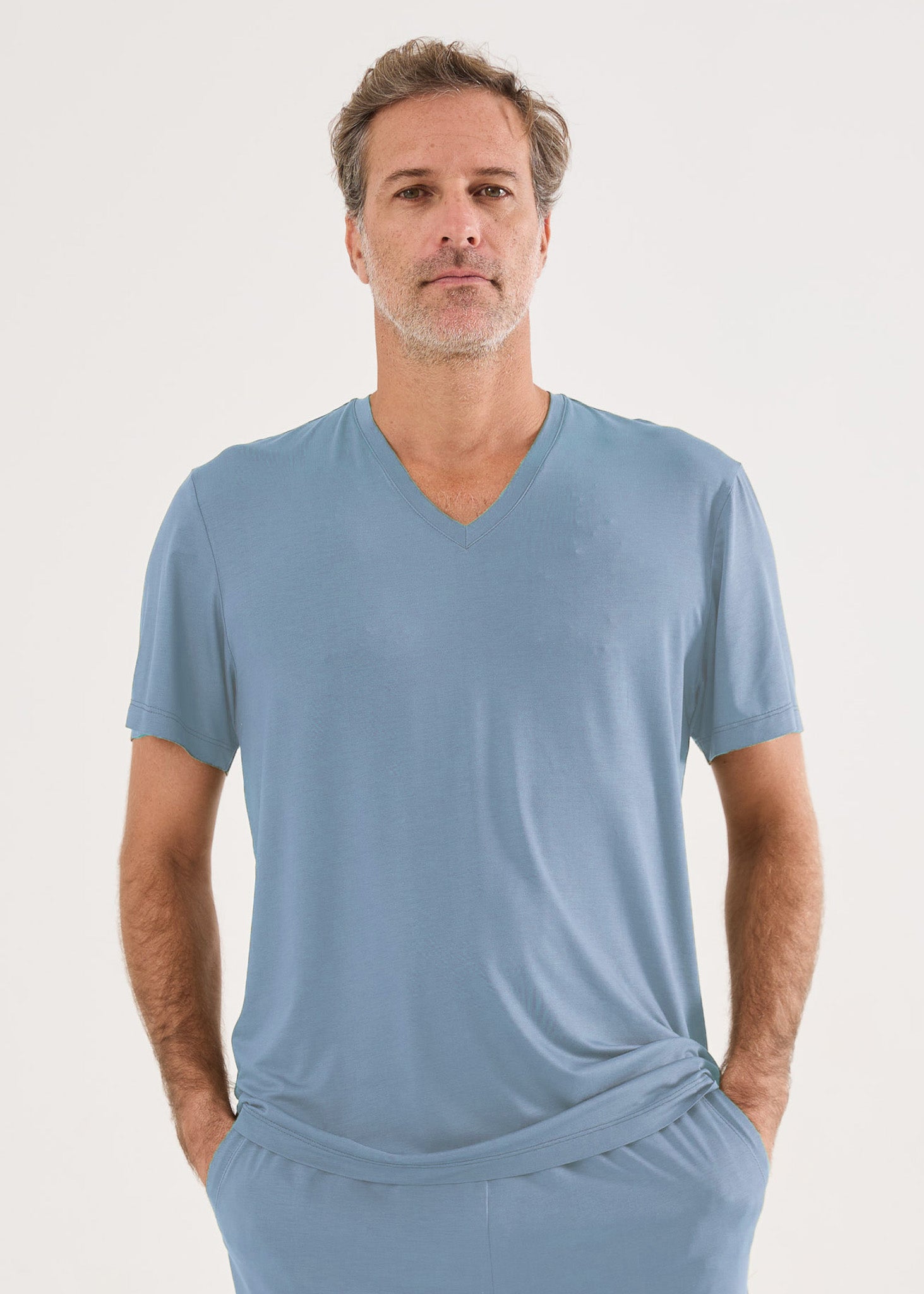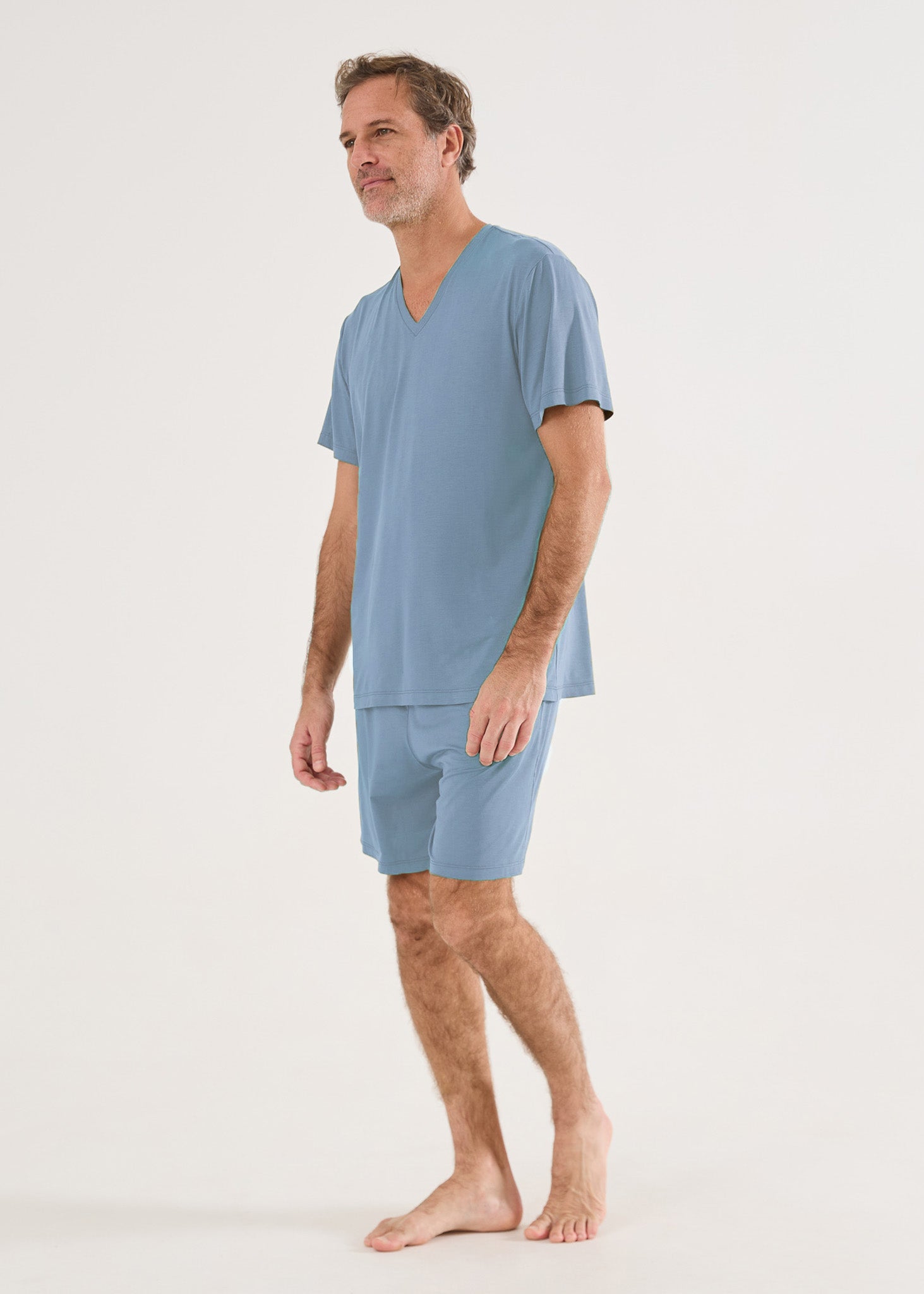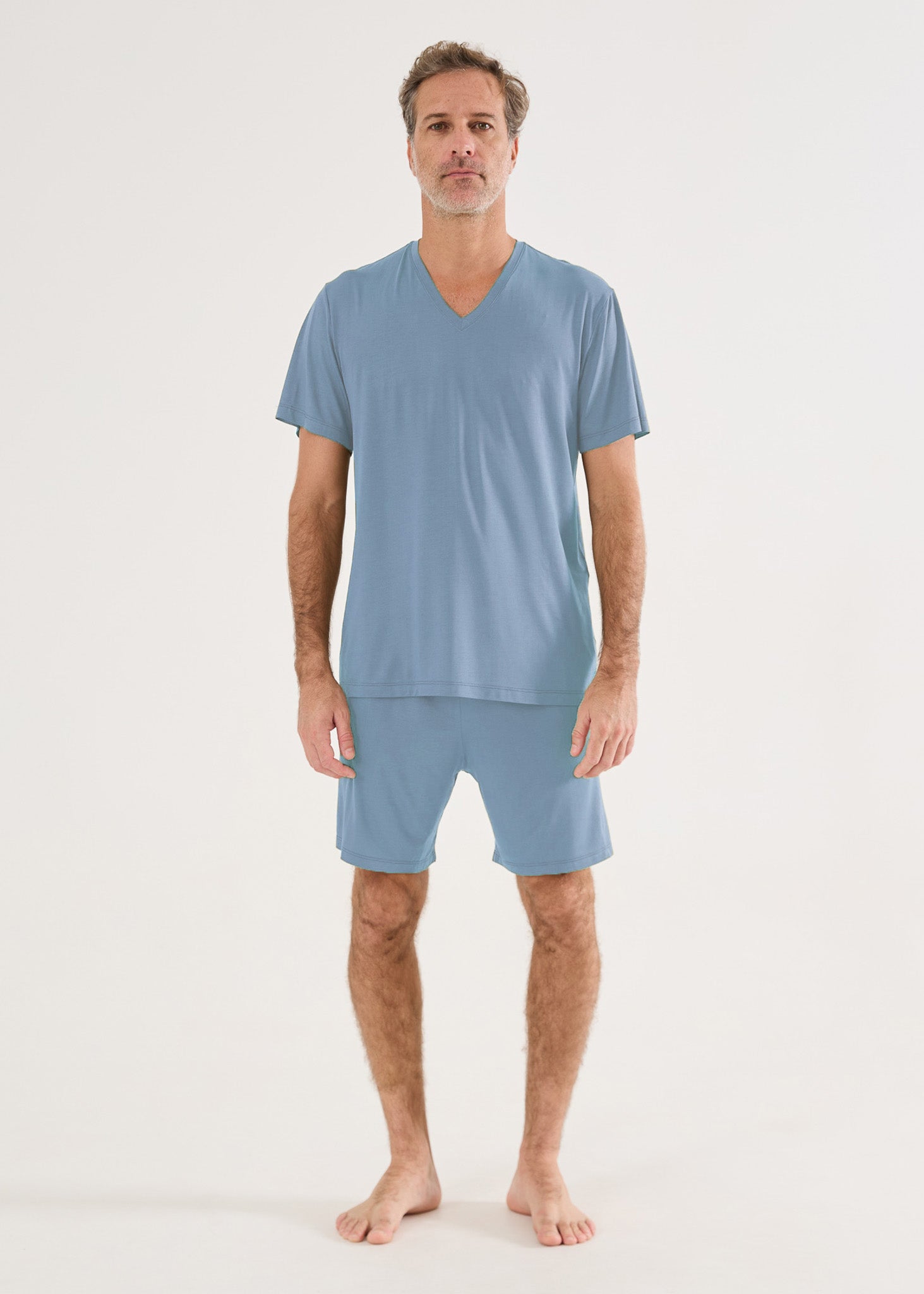 Pijama masculino modelo curto, em malha modal. Bermuda com bolsos laterais e elástico na cintura. Blusa com gola V e mangas curtas. Desfrute do toque inigualável da malha modal!