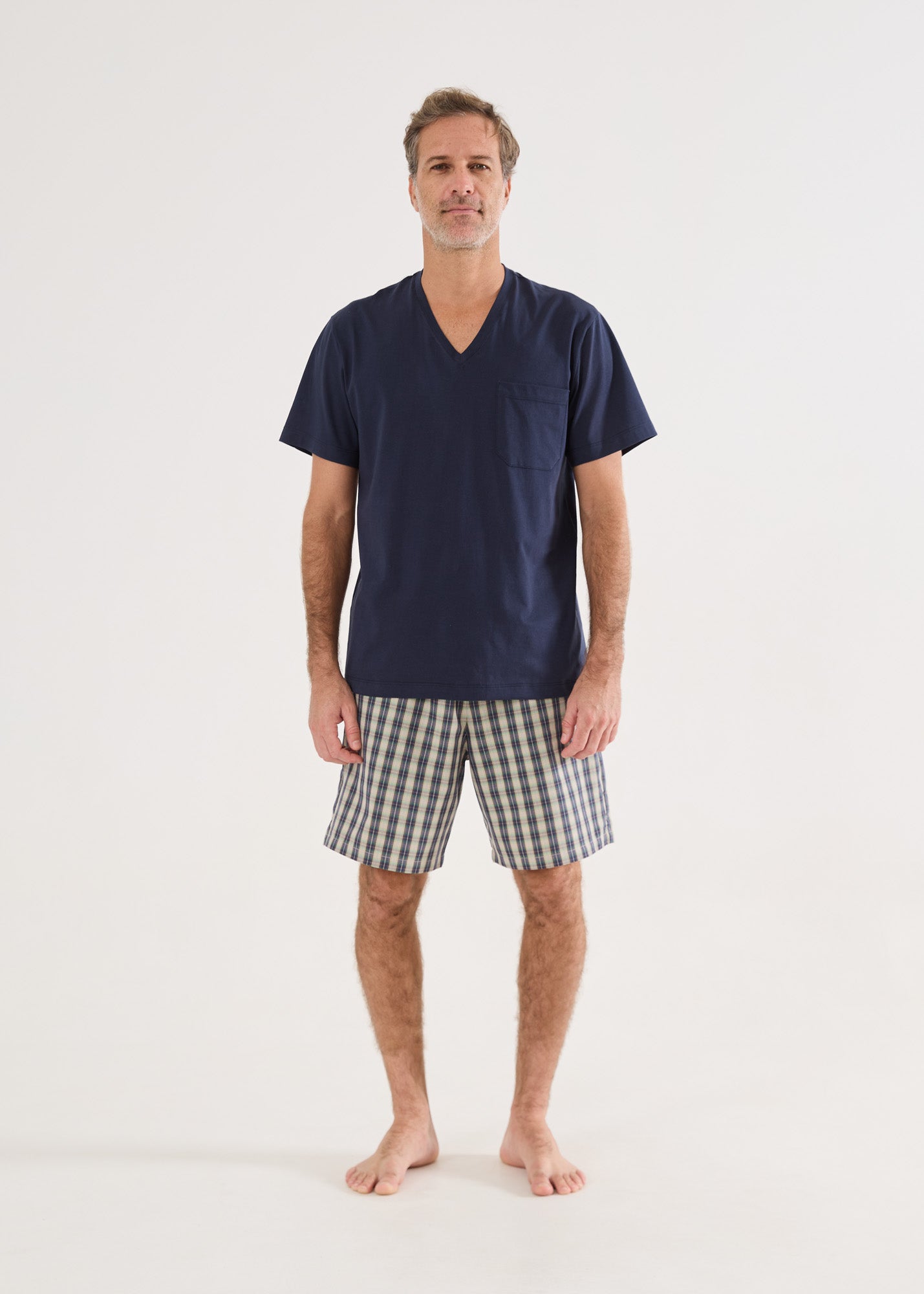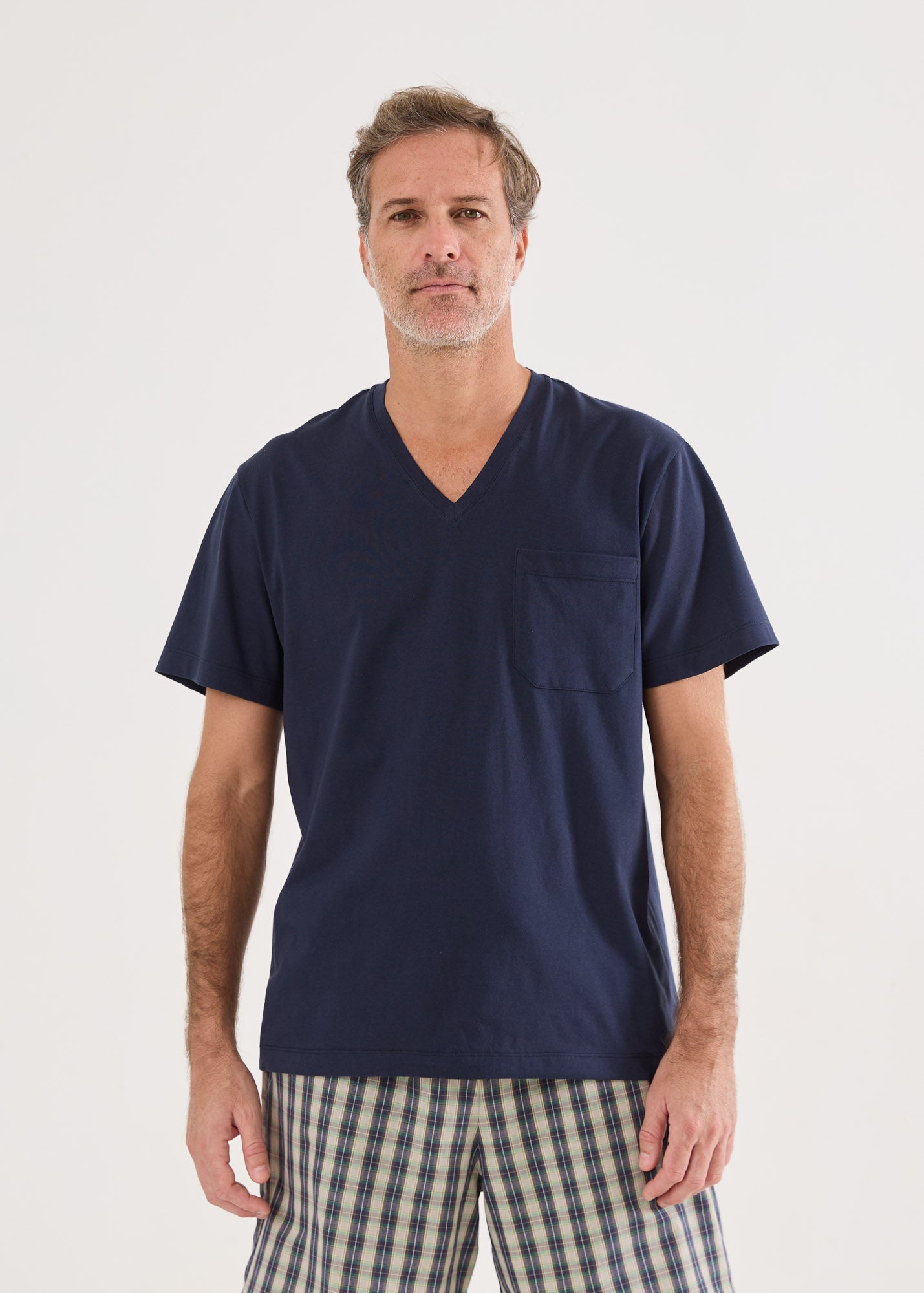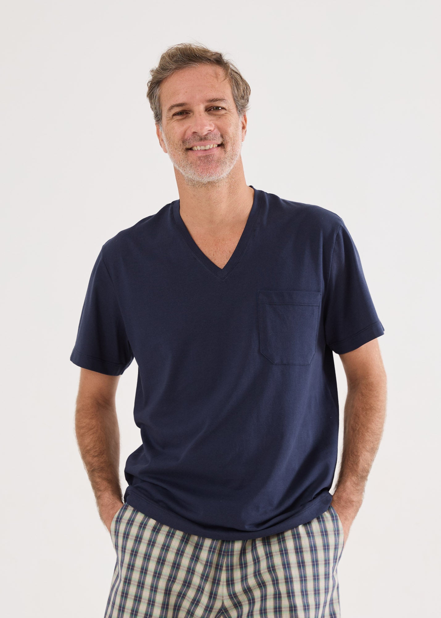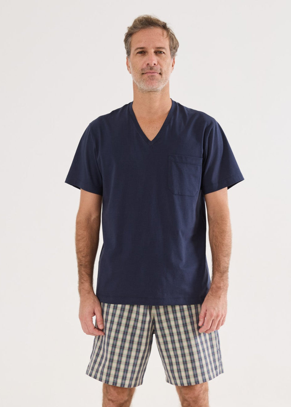 Pijama masculino adulto, bermuda em tecido xadrez 100% algodão, elástico na cintura, cadarço para ajustar e bolsos laterais. Blusa em malha de algodão premium na cor azul marinho, gola V.