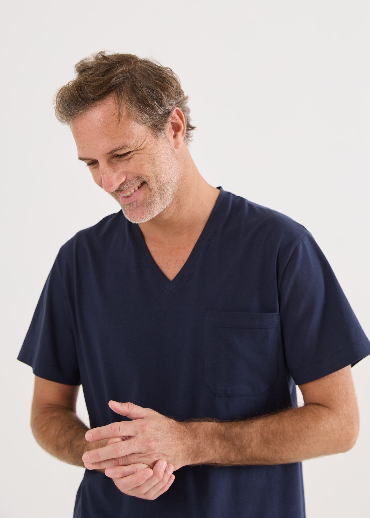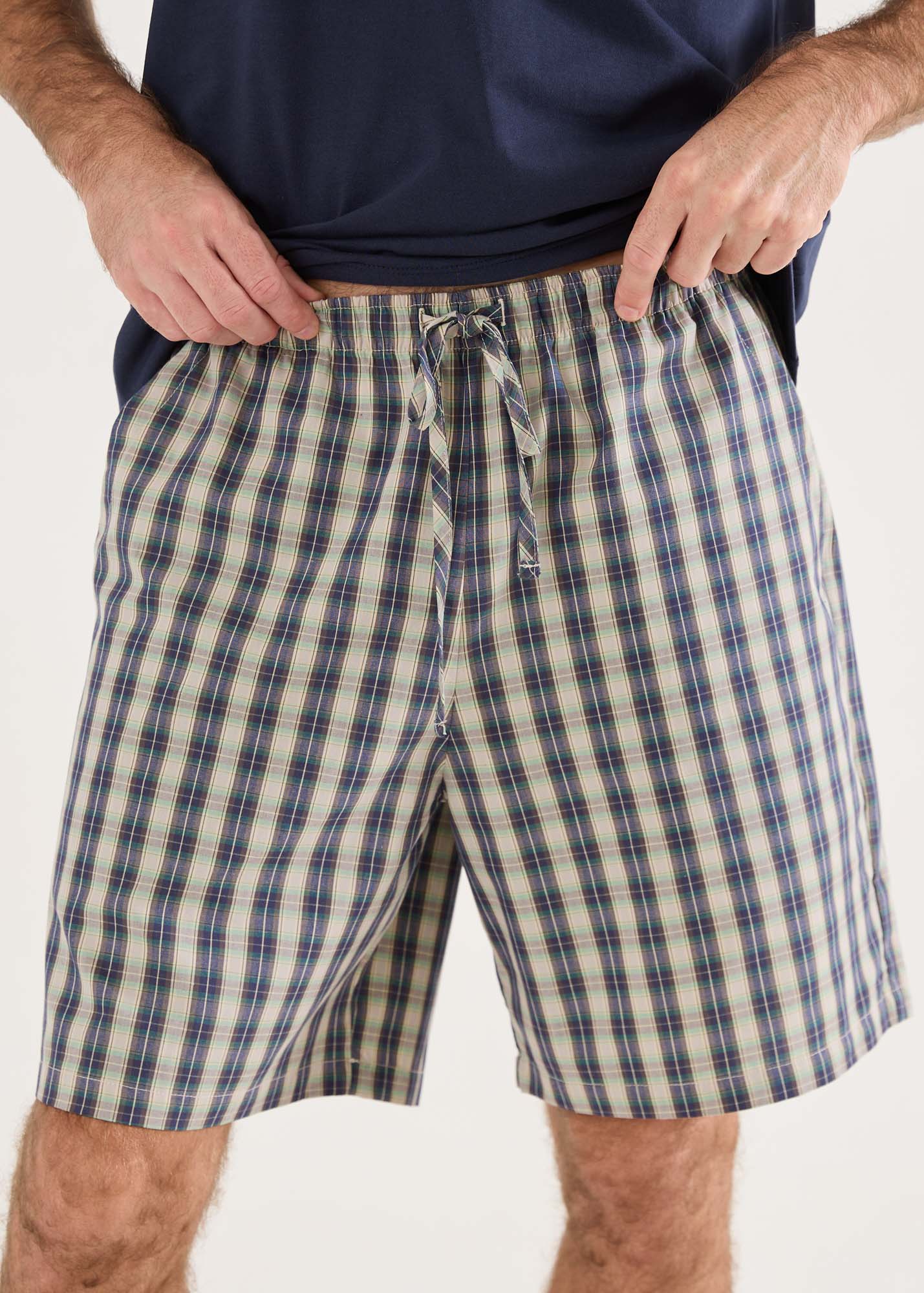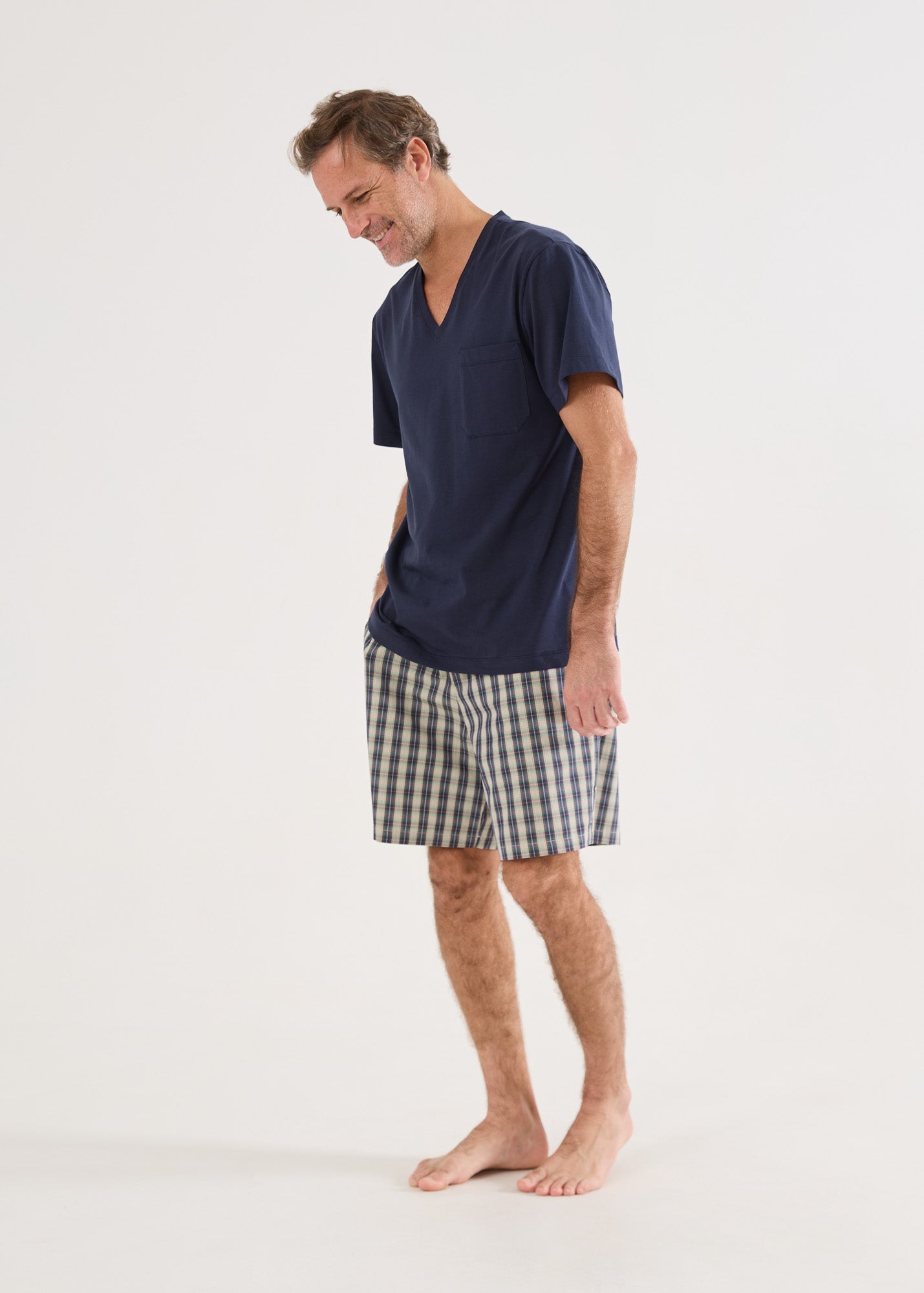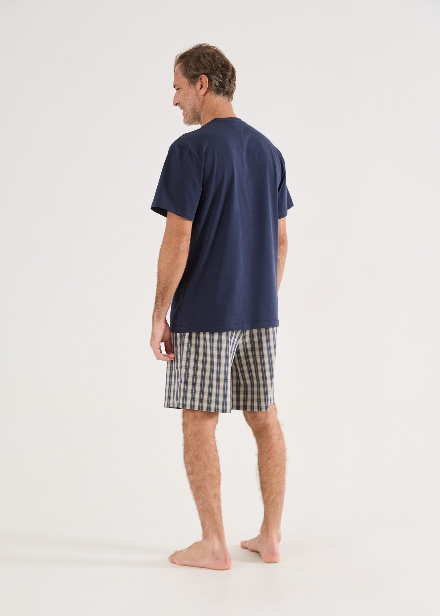 Pijama masculino adulto, bermuda em tecido xadrez 100% algodão, elástico na cintura, cadarço para ajustar e bolsos laterais. Blusa em malha de algodão premium na cor azul marinho, gola V.