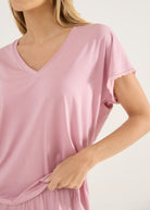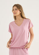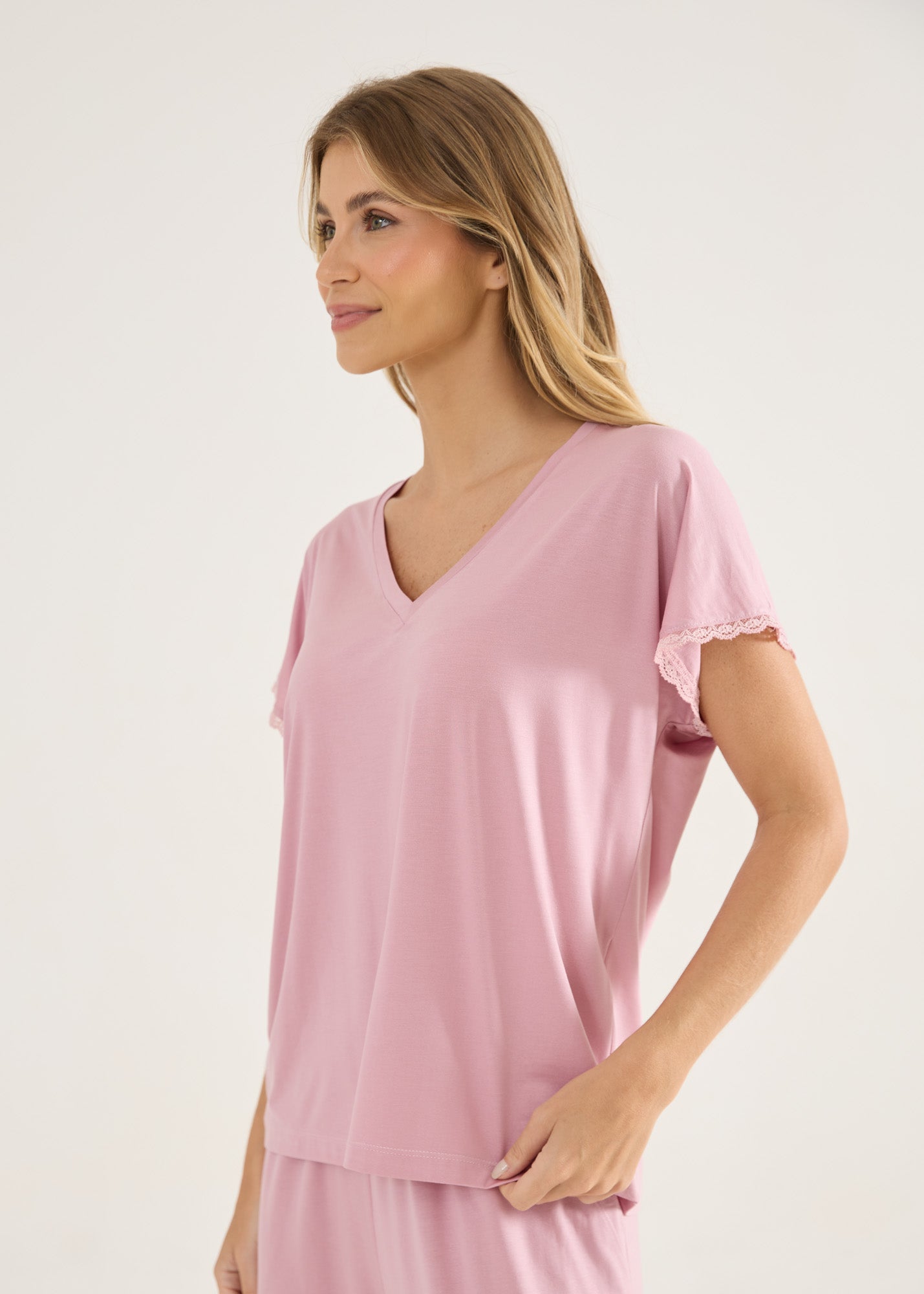 Pijama feminino modelo calça e blusa de mangas curtas, modelagem soltinha e confortável com o toque inigualável da malha modal e detalhes em renda nas mangas e barra da calça. Calça com bolsos laterais.