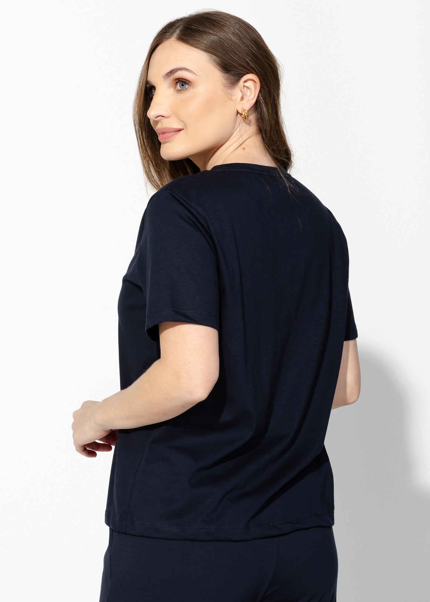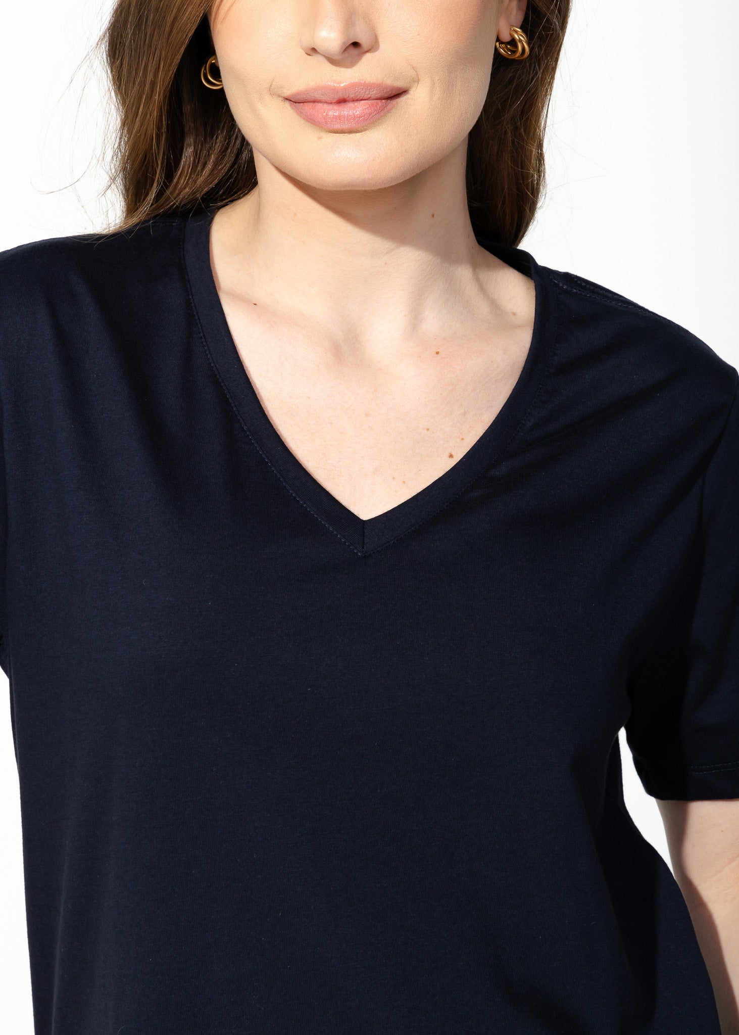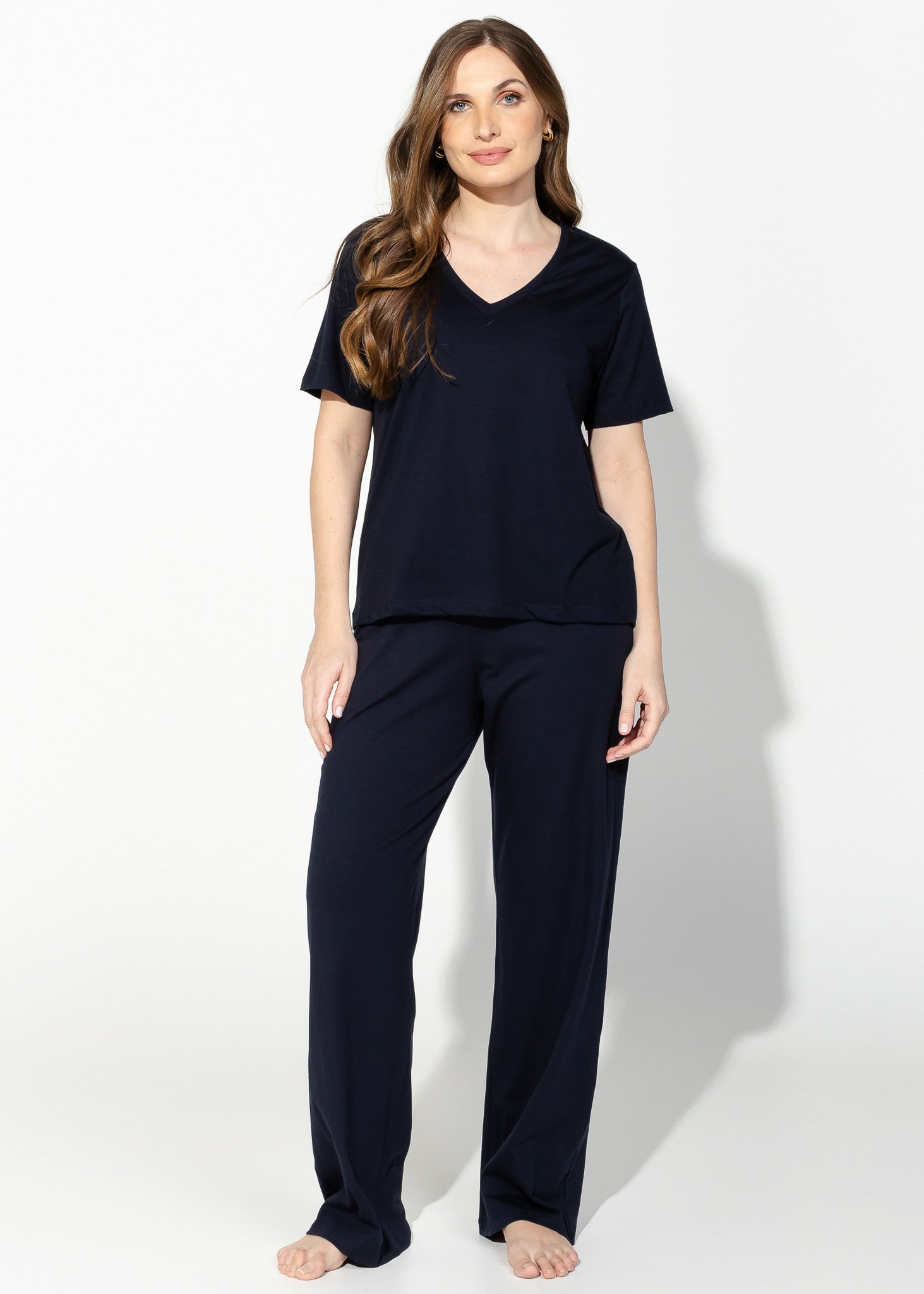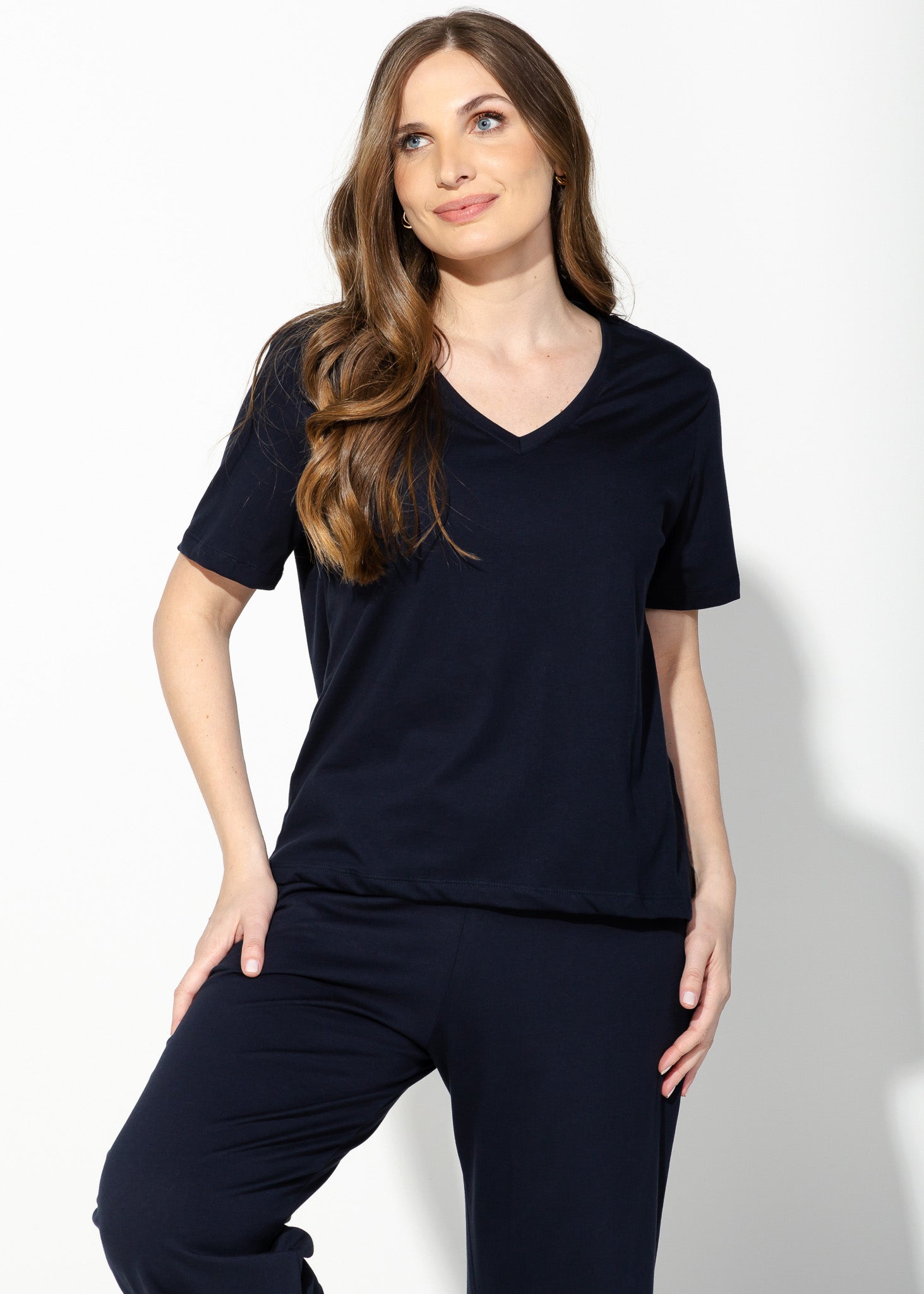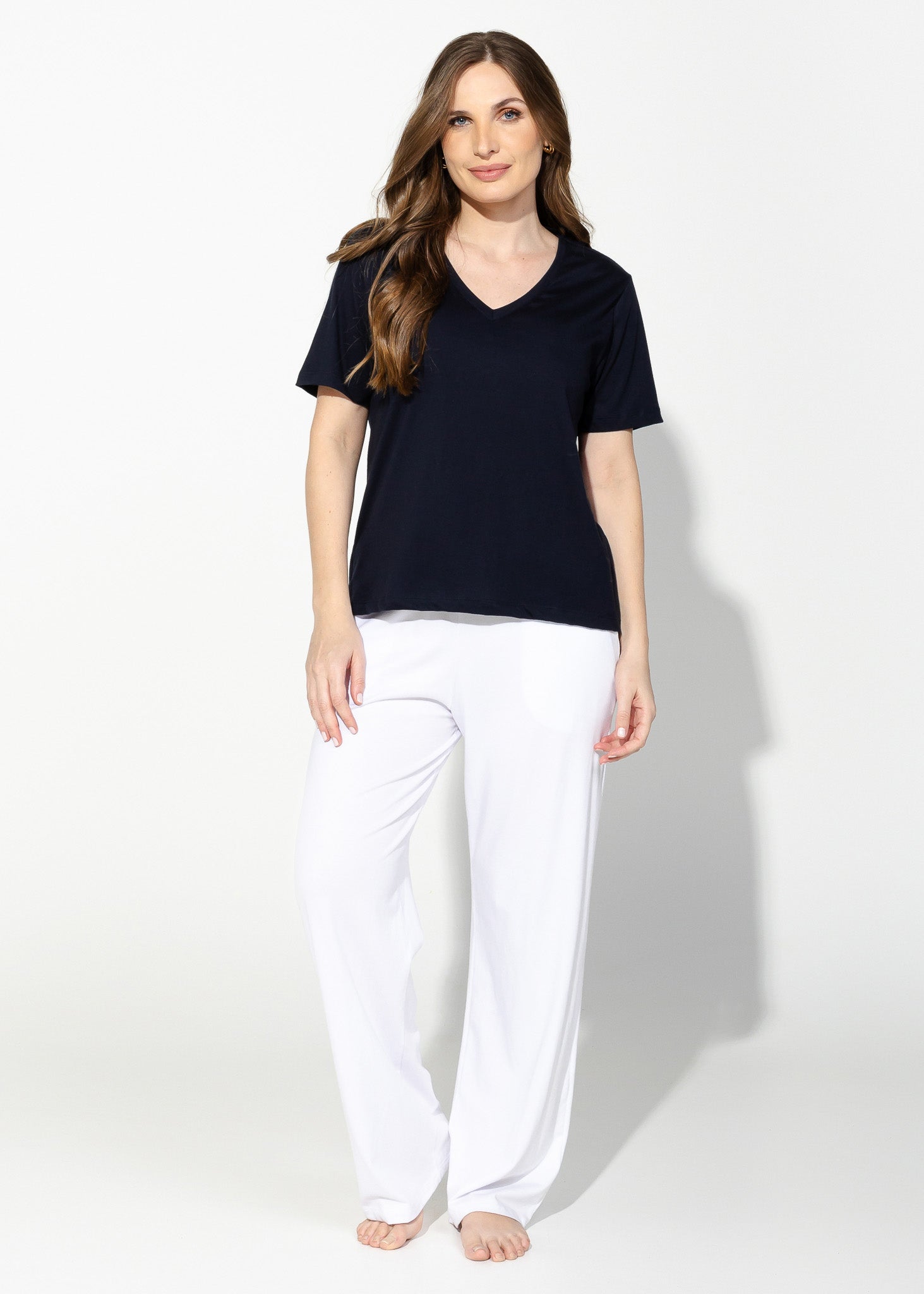 A camiseta feminina gola V é confeccionada no mais puro algodão Pima. Avulsa para te dar versatilidade para combinar com as partes de baixo da sua escolha. Sugerimos nas fotos a calça em algodão Pima. O match é um homewear perfeito na beleza e conforto. As modelagens da Linha Pima são soltinhas.