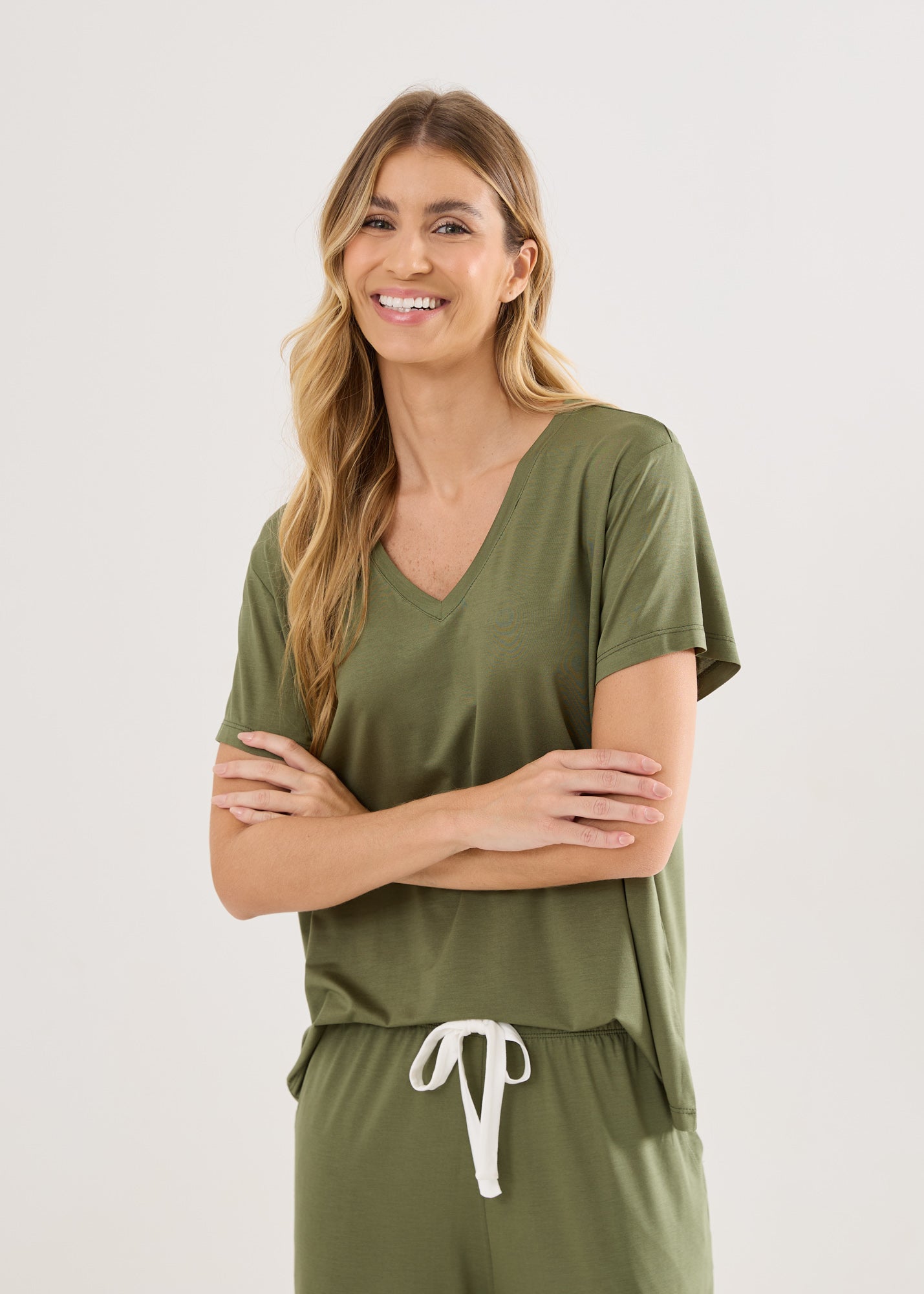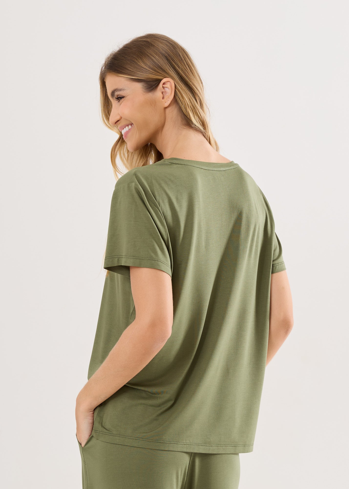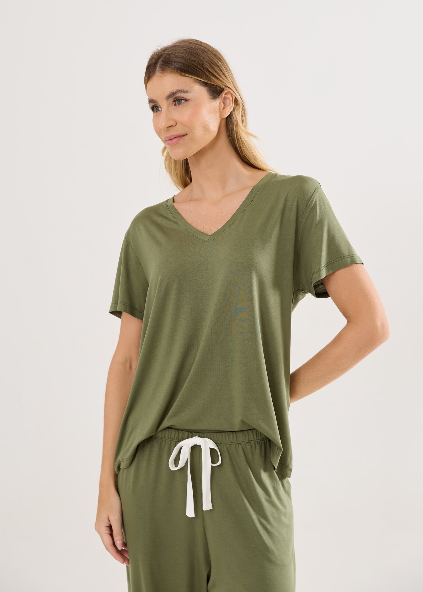 Camiseta feminina avulsa estilo homewear com o toque inigualável da malha modal. Camiseta com mangas curtas e gola v. Item essencial para você curtir o conforto em casa ou passear por aí.