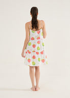 Camisola alças, modelagem evasê, bem larguinha e confortável, estampa morangos.