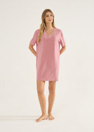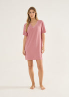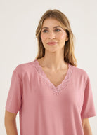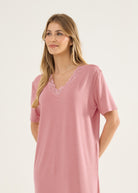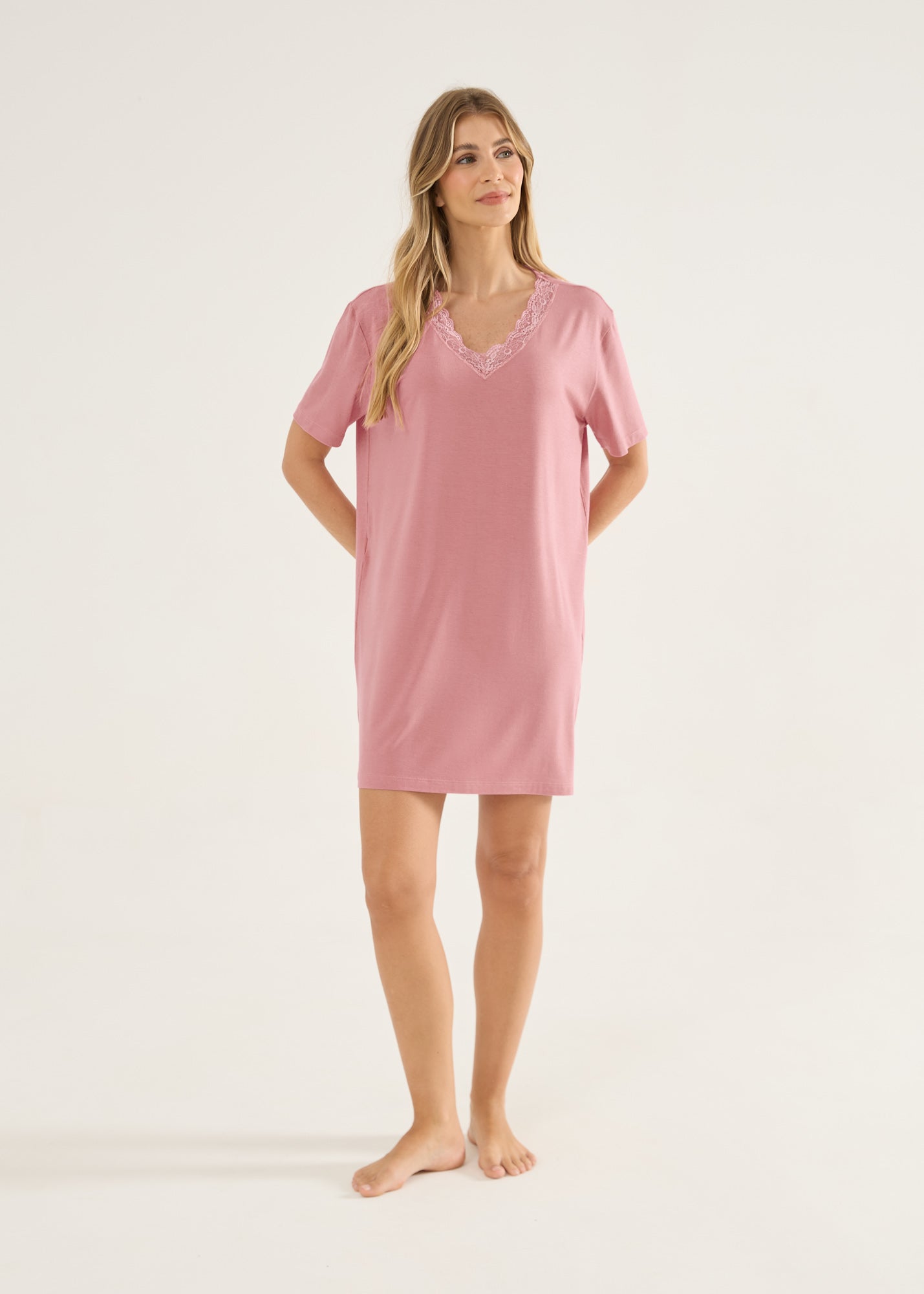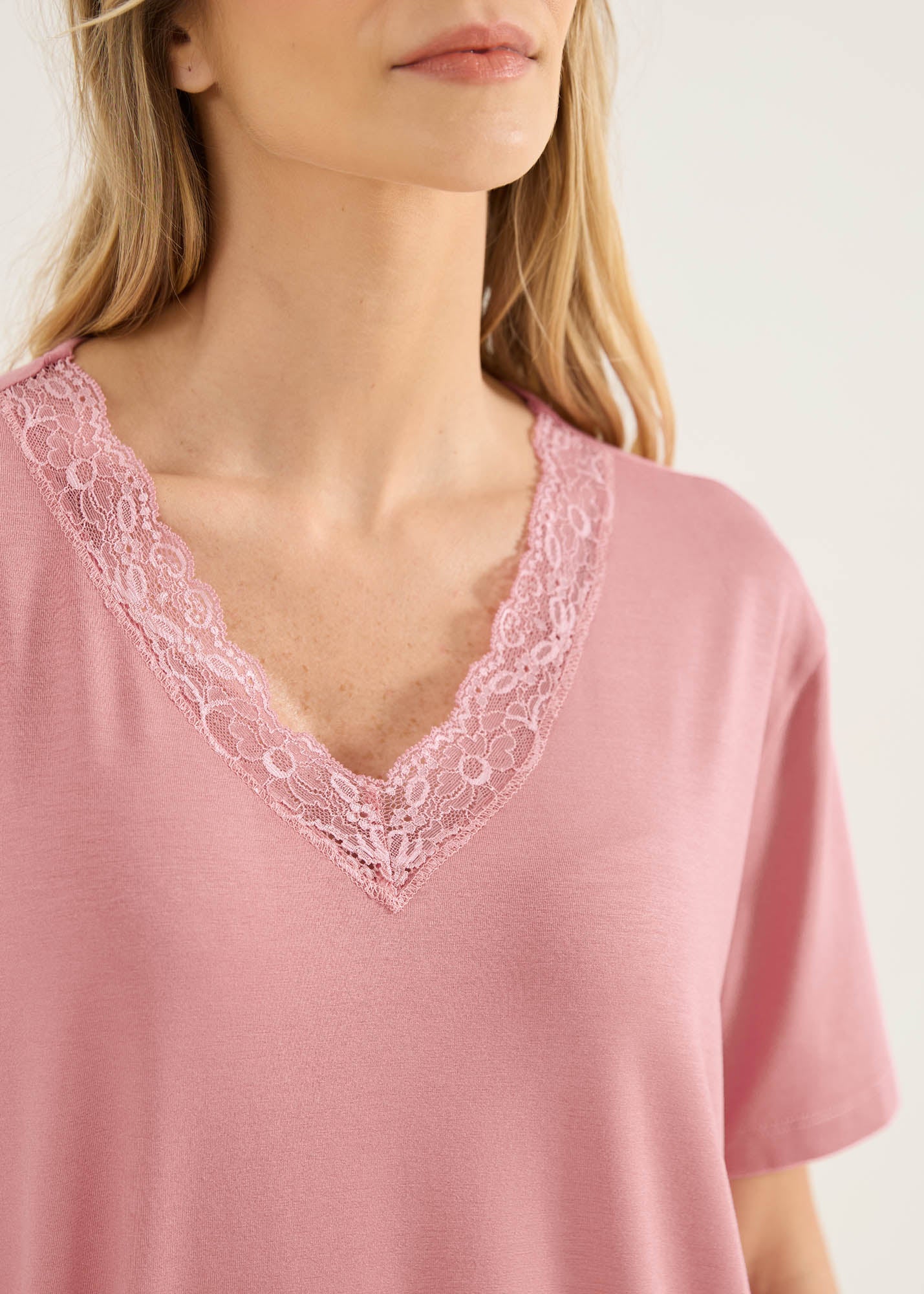 Camisola feminina, modelagem ampla e soltinha, com mangas, decote com detalhe em renda. Comprimento no joelho.