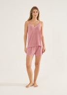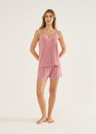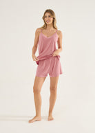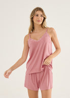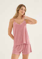 Pijama curto feminino, modelo blusa de alças com detalhe em renda no decote e bermuda soltinha com elástico na cintura. A malha visco é confortável e leve, confortável para todas as estações do ano. O toque é tão macio que vai te surpreender!