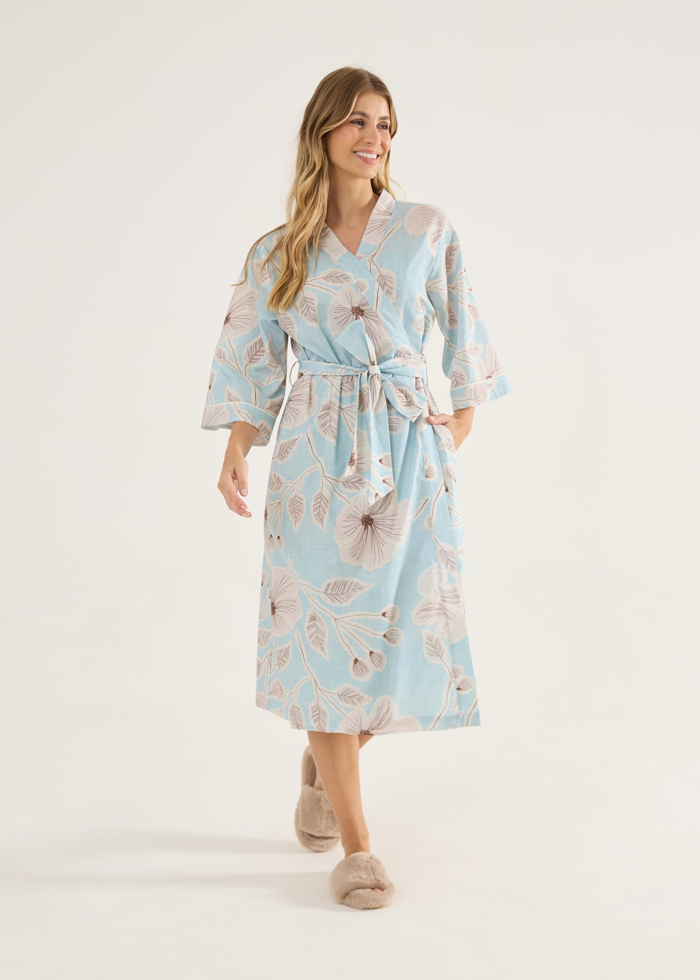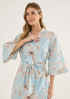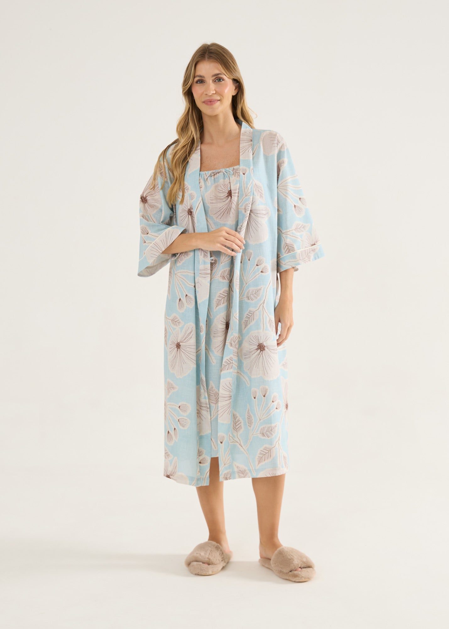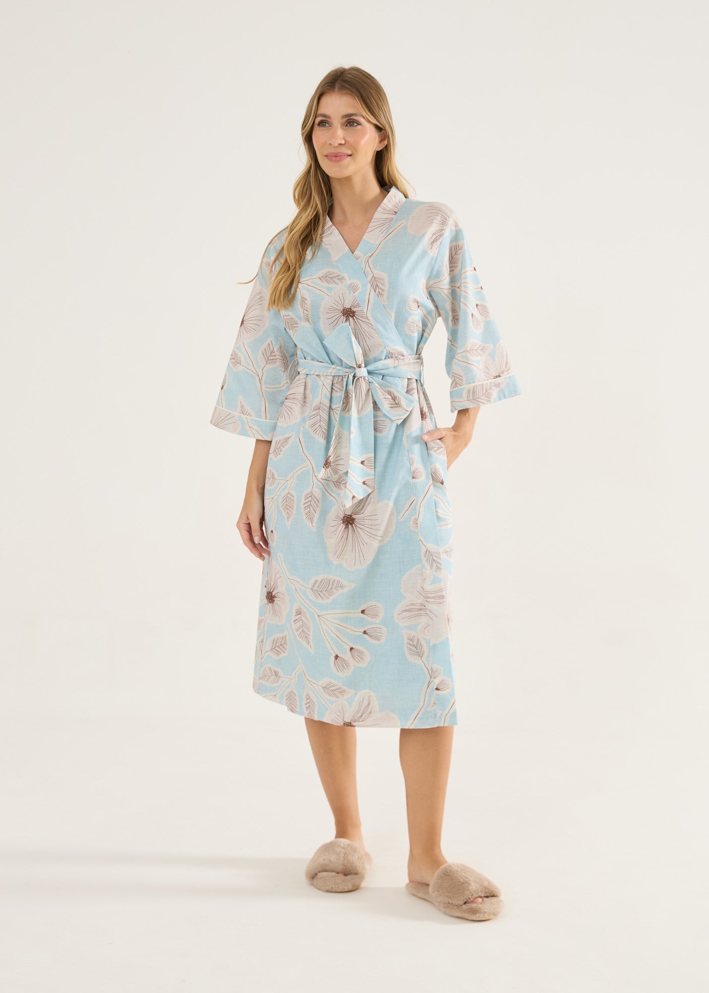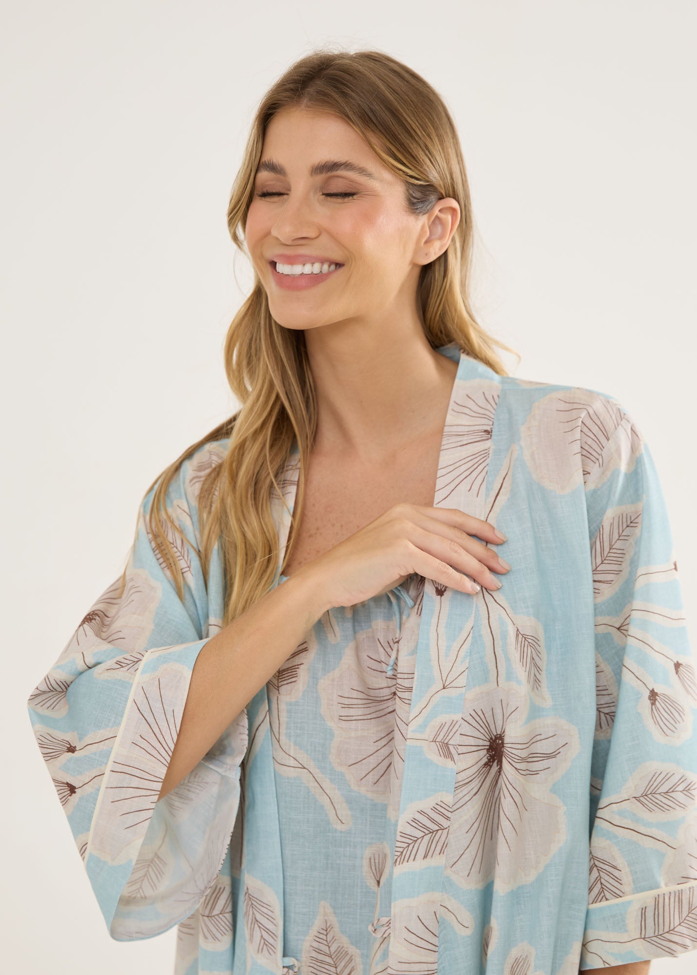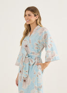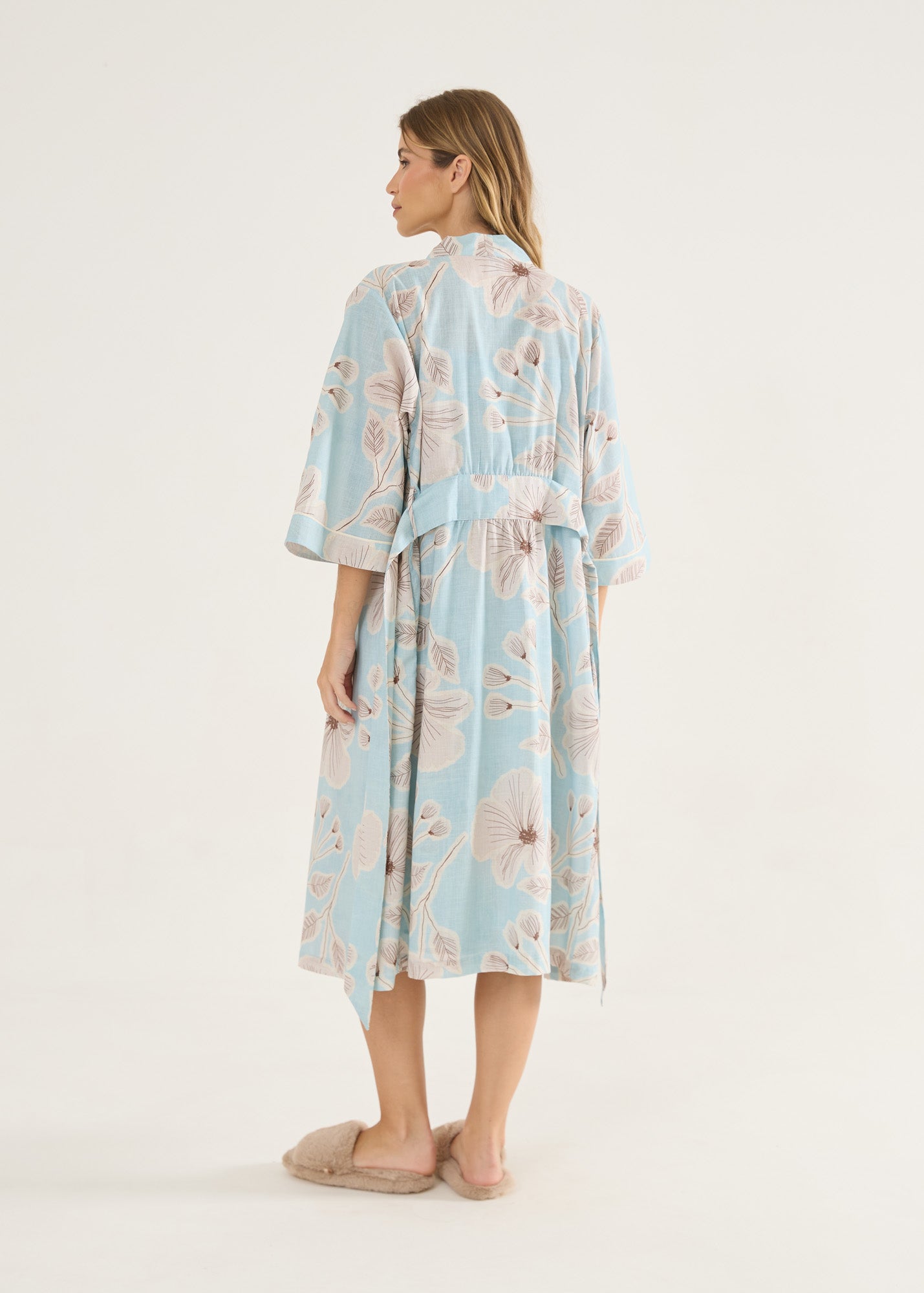 Robe feminino, com modelagem fluida, alças delicadas, comprimento midi, mangas e bolsos laterais. Estampa exclusiva em tecido 100% algodão. Combine o robe com a camisola da mesma coleção como sugerimos nas fotos.