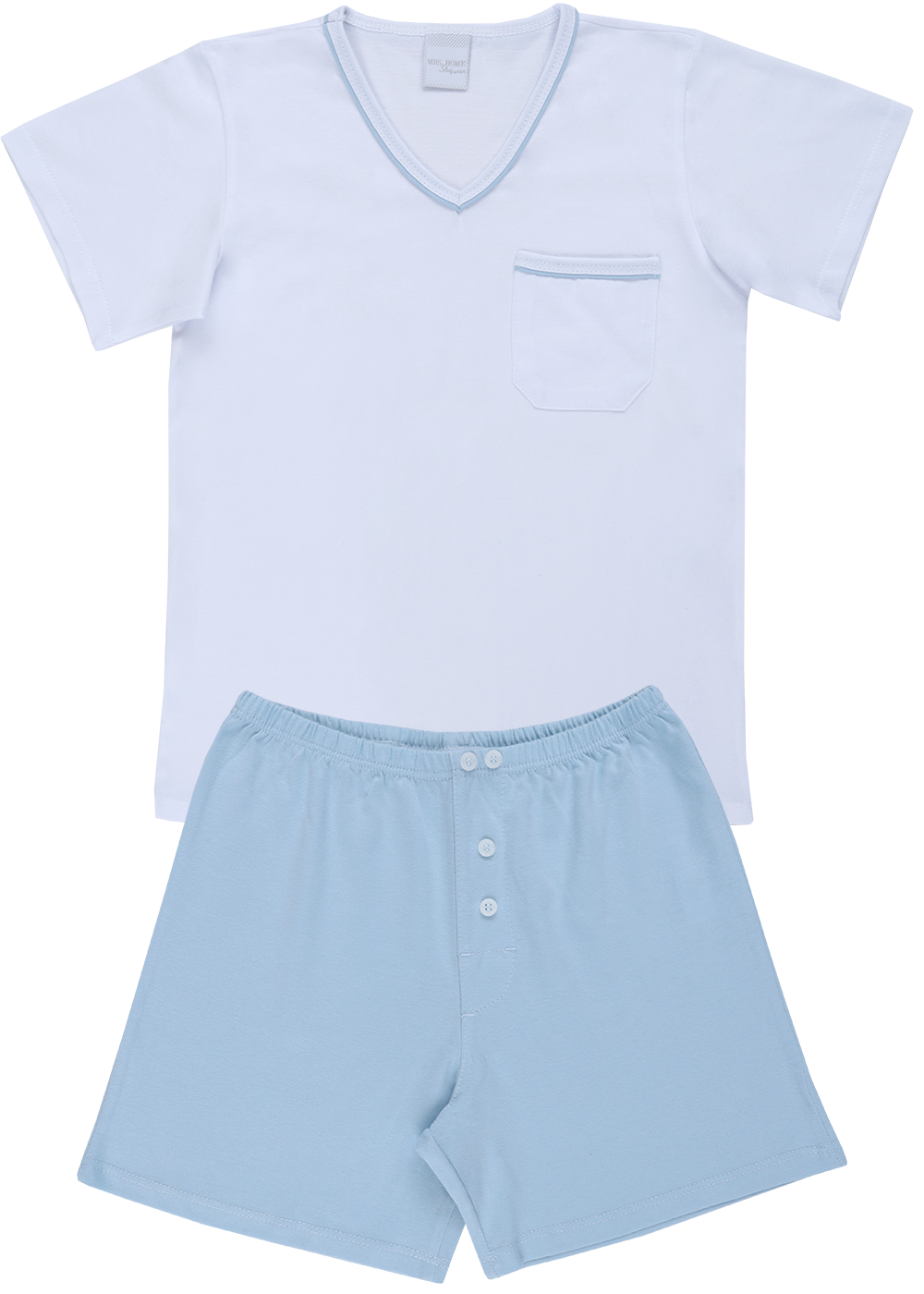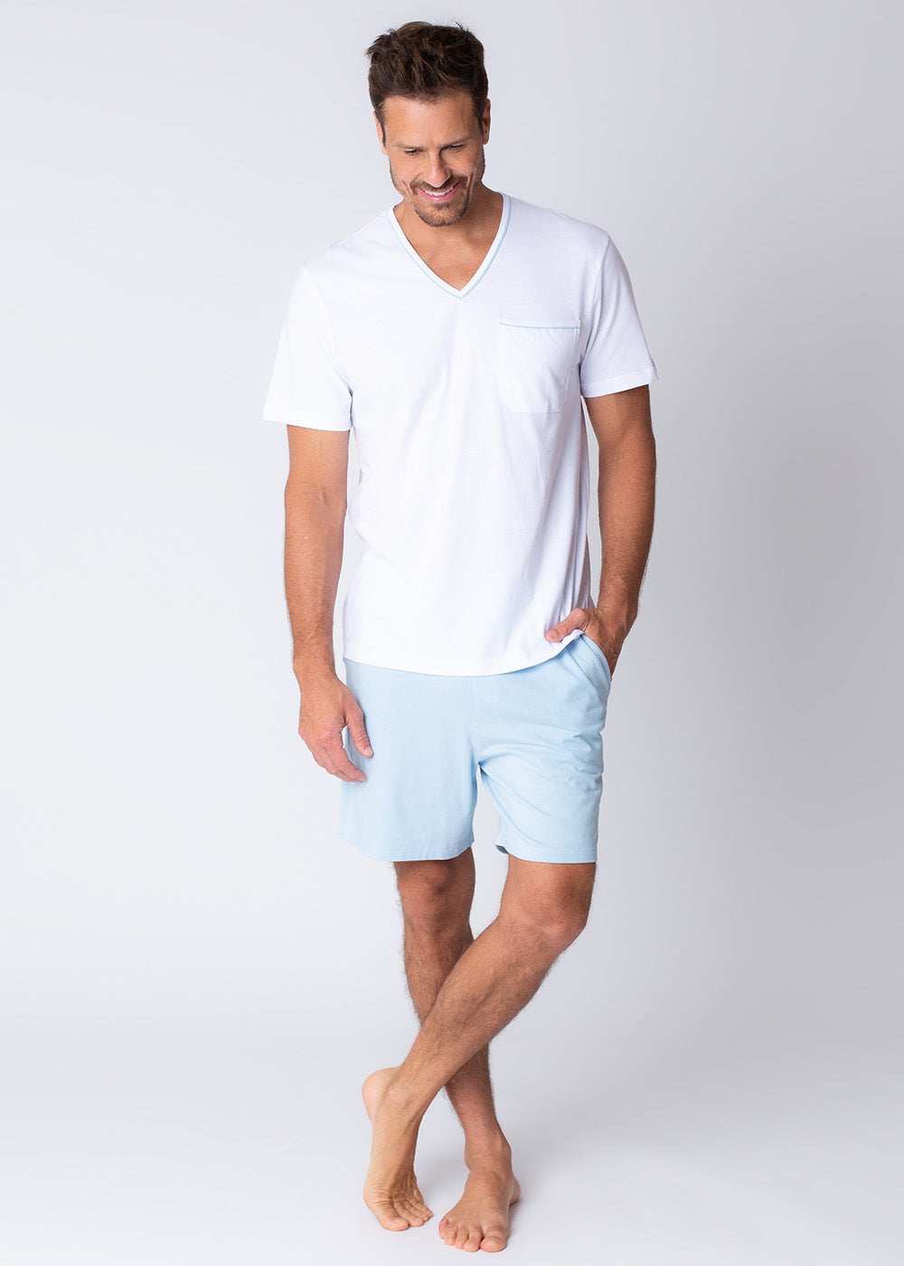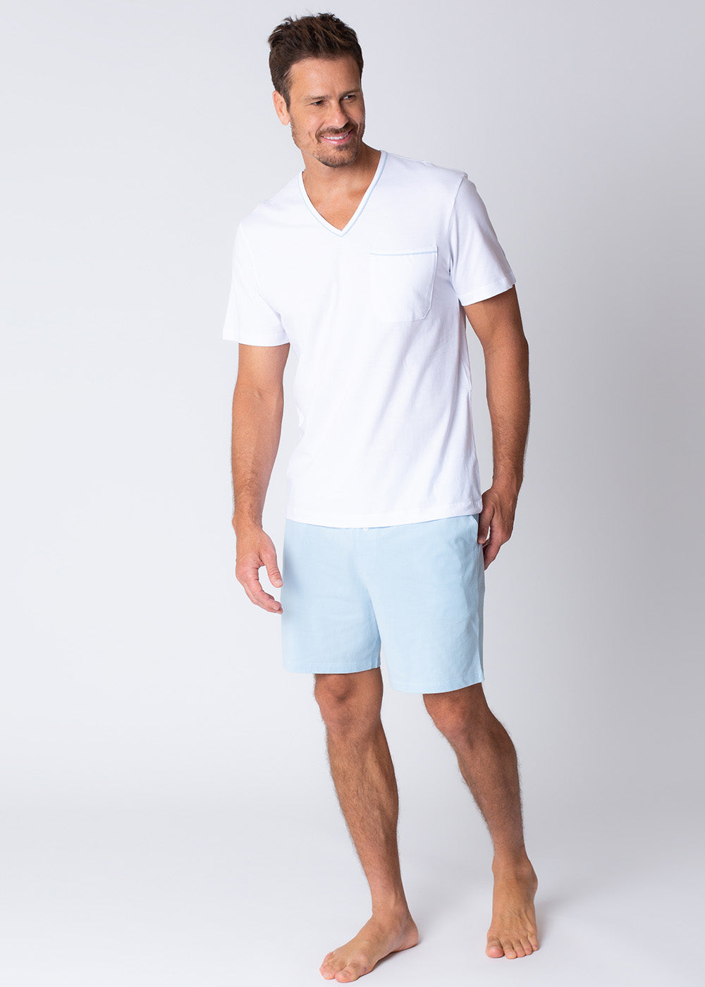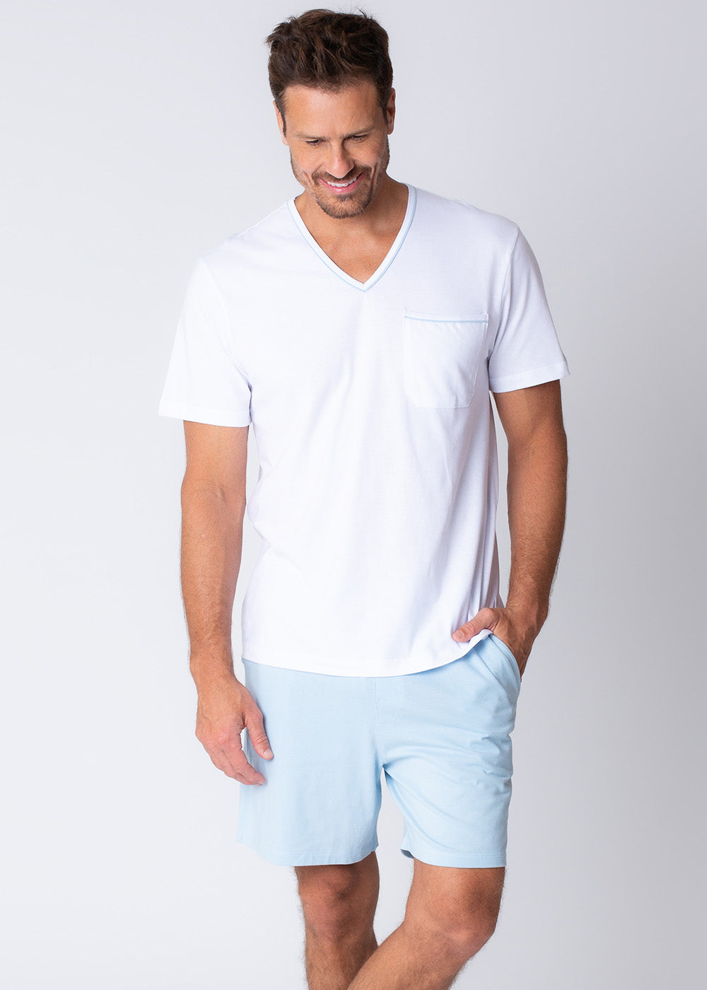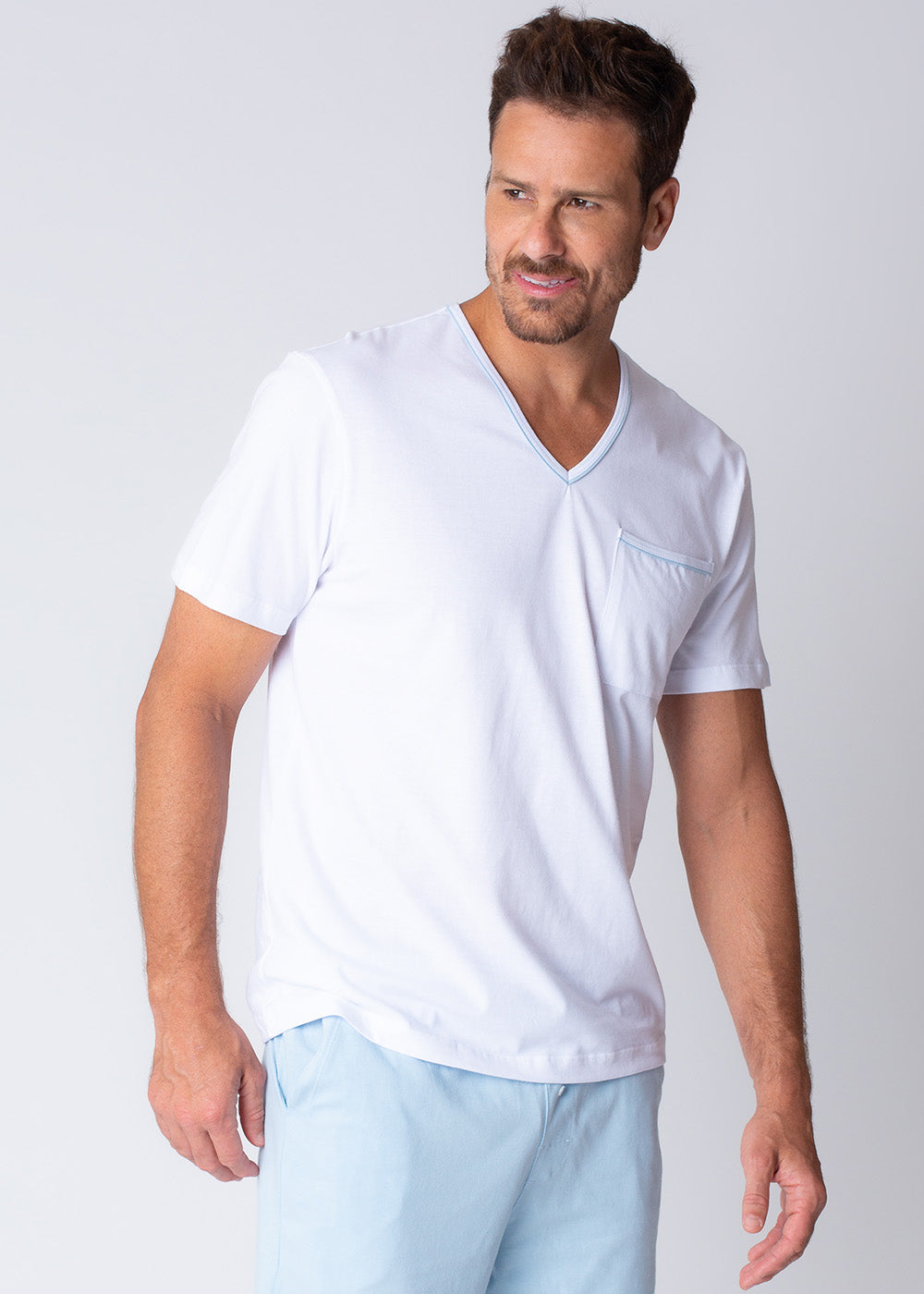 Camiseta branca com decote em V e detalhe com vivo azul claro na gola e bolso lateral. Bermuda em malha na cor azul claro, modelagem tradicional, com bolsos e elástico no cós.