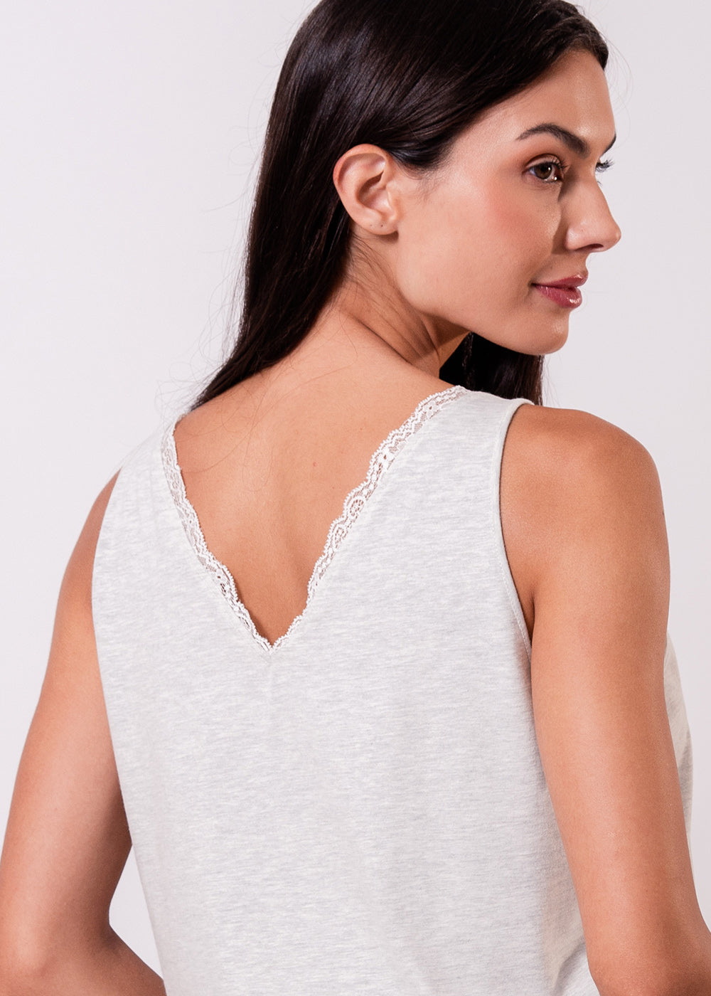 Modelo tipo regata, com gola V e detalhe em renda muito delicado. Confeccionada em malha ultrasoft. Disponível em várias cores para você ousar na criatividade e montar seu pijama do seu jeito!