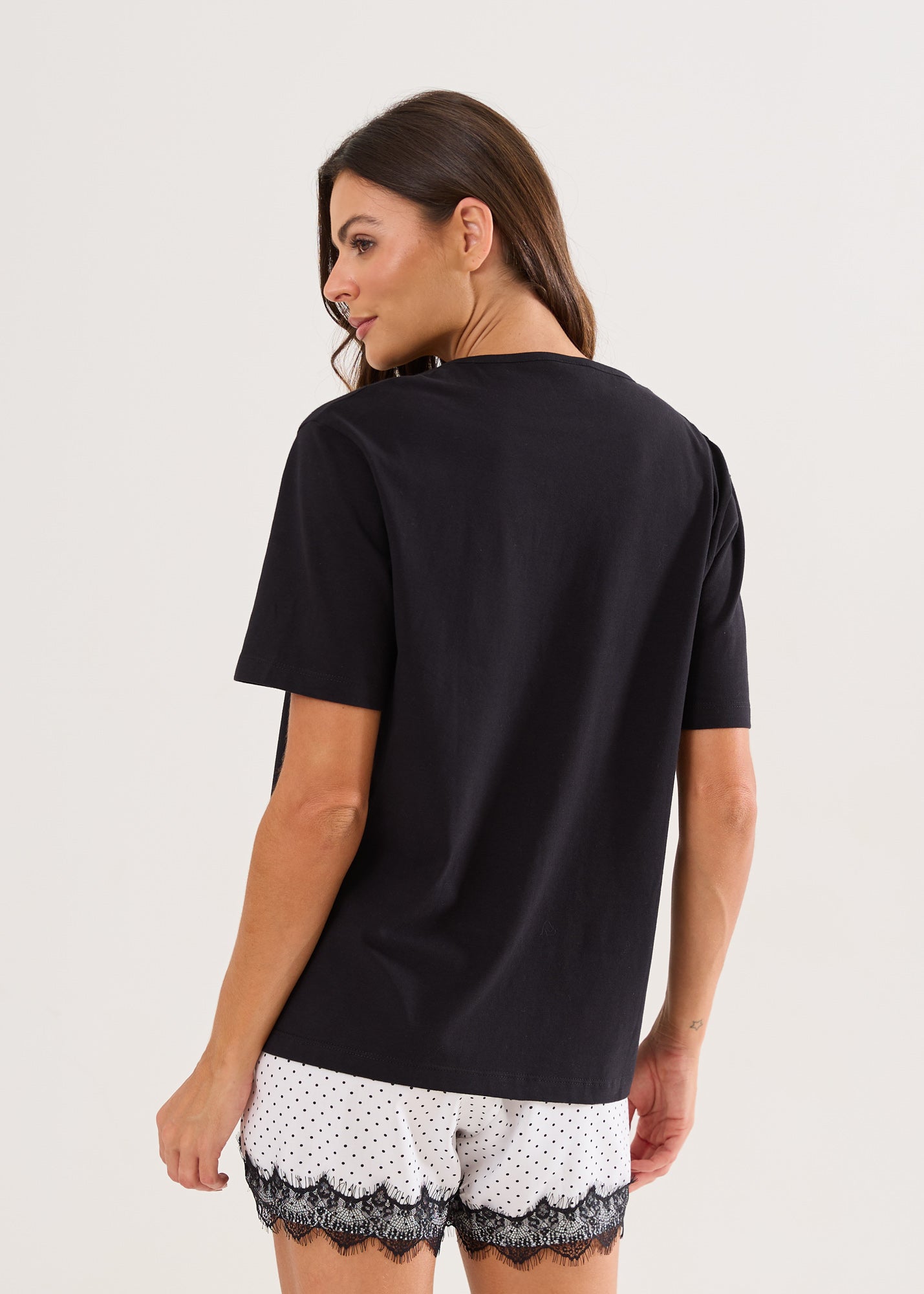 Blusa feminina com modelagem soltinha, mangas curtas e um delicado detalhe em renda no decote. Muito versátil, essa blusa é a basiquinha com bossa. É uma peça avulsa e você pode combinar com seus pijamas e montar vários looks!