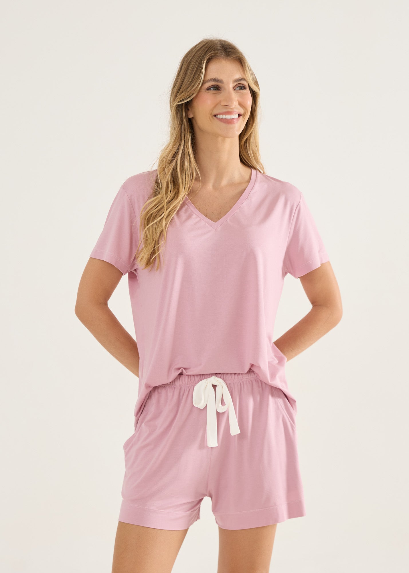 Short avulso estilo homewear com o toque inigualável da malha modal. Short feminino com elástico na cintura e bolsos laterais. O elástico é confortável, sem apertar ou marcar. Detalhe do laço em off-white. Item essencial para você curtir o conforto em casa ou passear por aí.