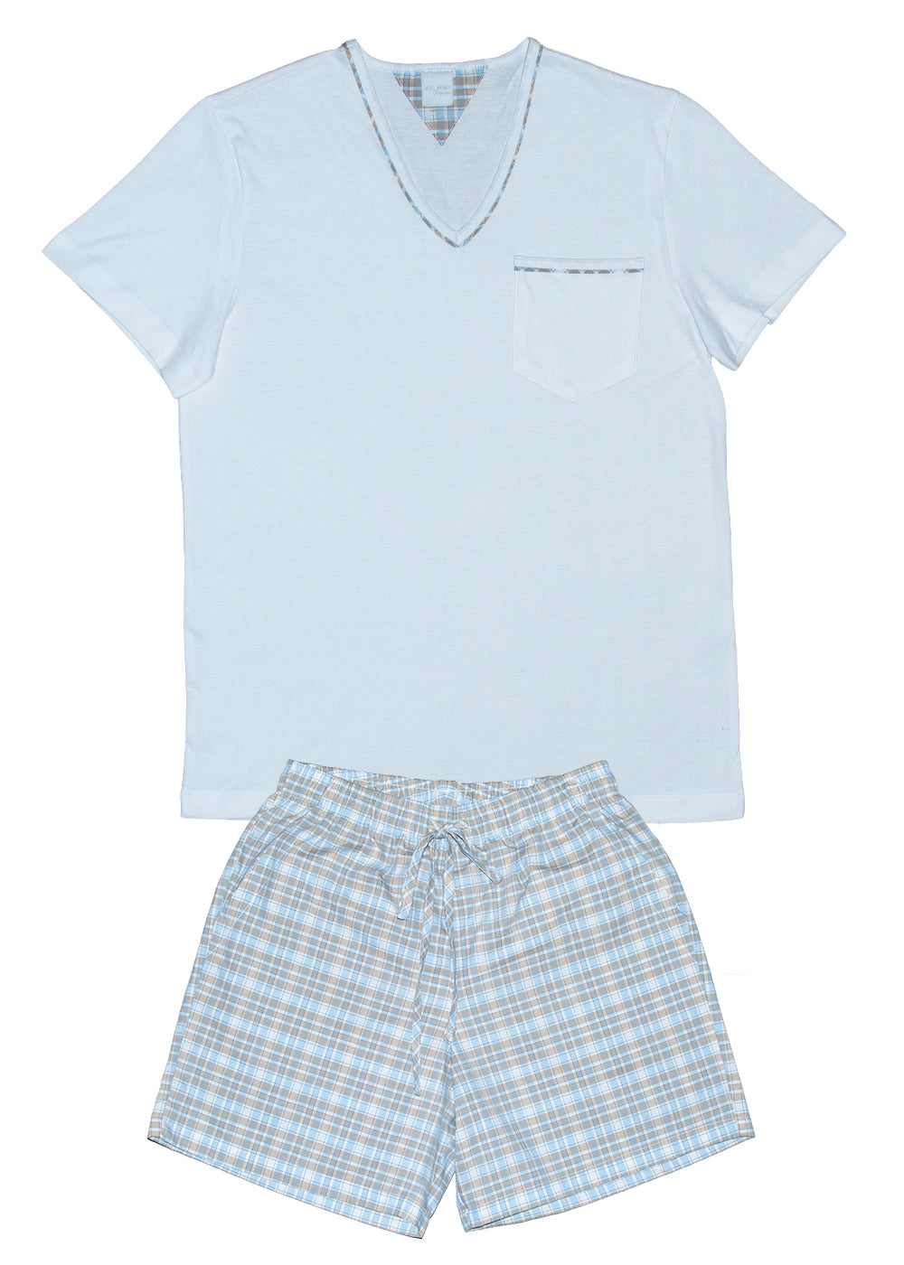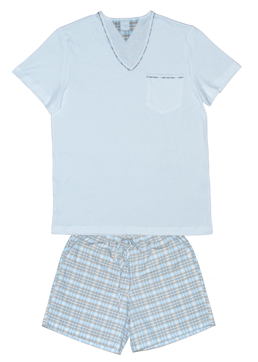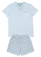 Pijama masculino adulto, bermuda em tecido xadrez 100% algodão, em tons de azul claro e caqui, elástico na cintura e bolsos laterais. Blusa em malha de algodão premium na cor branca,  gola V, com detalhe do xadrez na gola. Bolso lateral.
