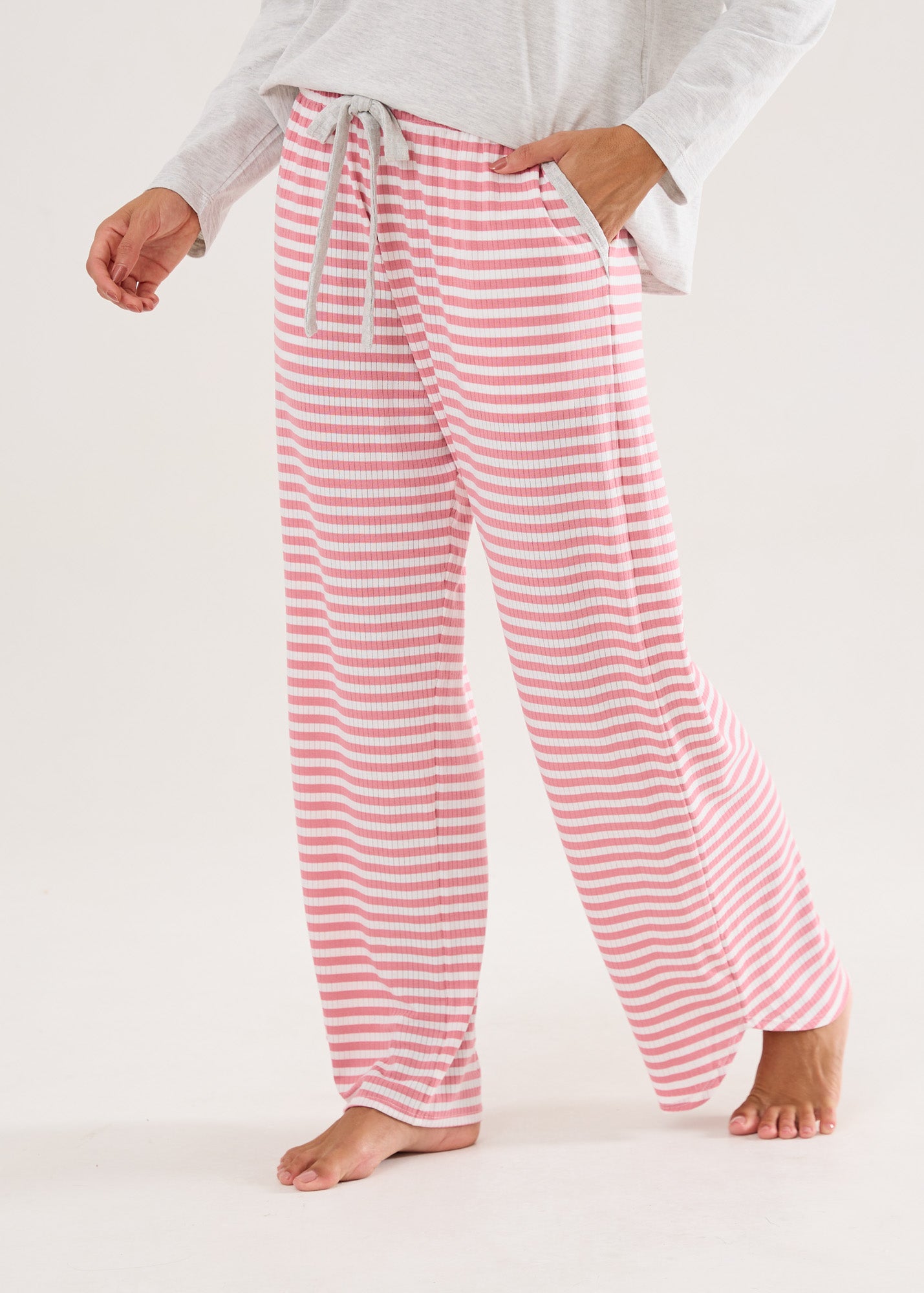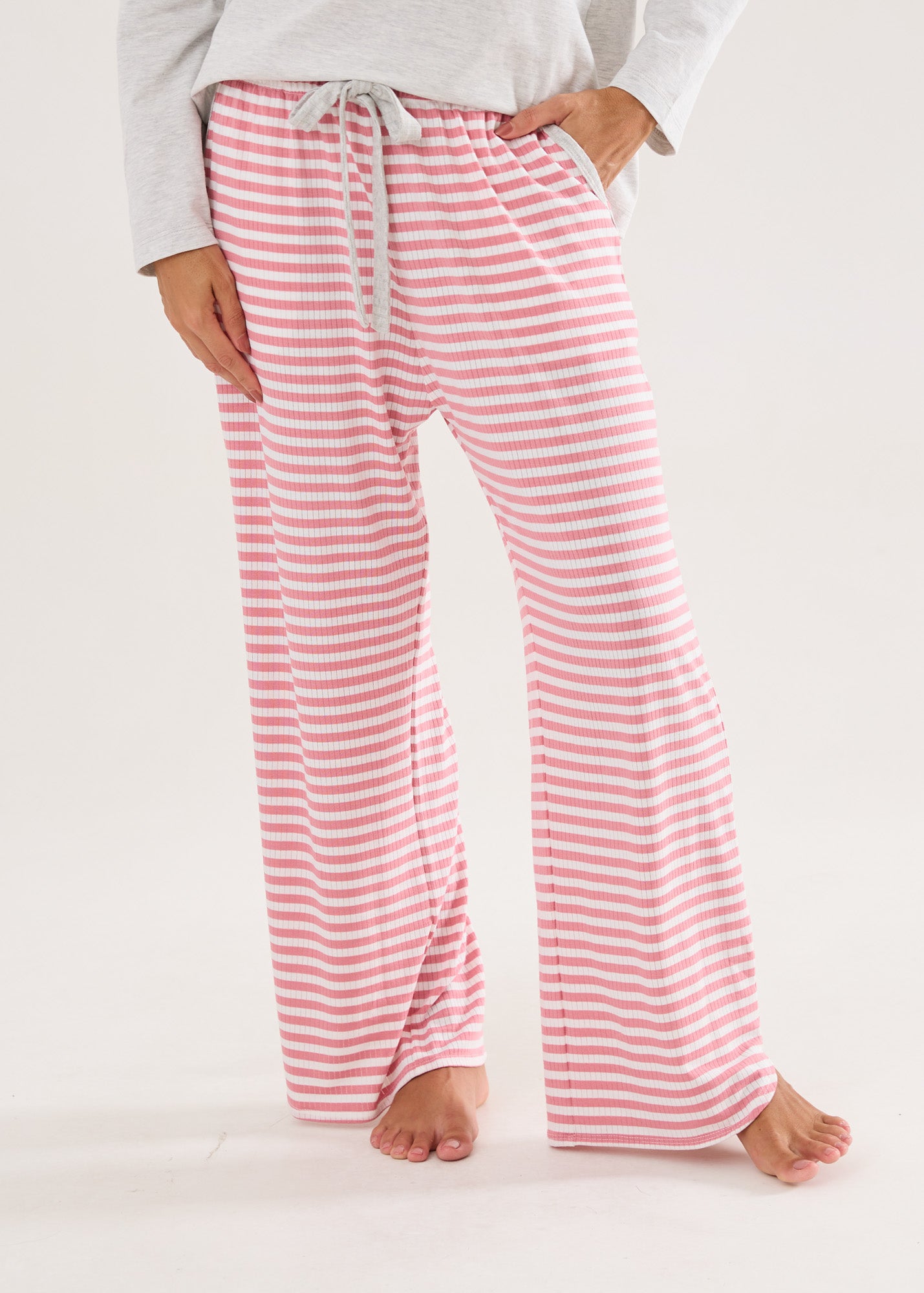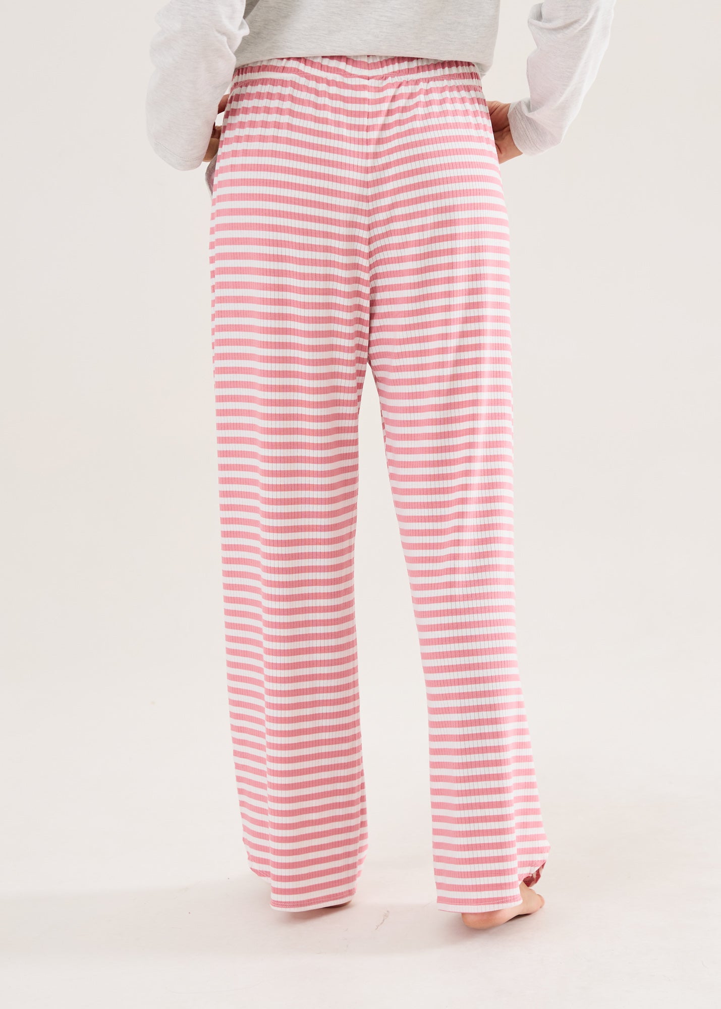 Calça avulsa em canelado listrado, com bolsos laterais, elástico na cintura e detalhe arredondado na barra. Listrado de rosa e branco com detalhes em canelado mescla. Combine a sua calça avulsa com as blusas avulsas lisas branca ou mescla e crie vários looks diferentes.
