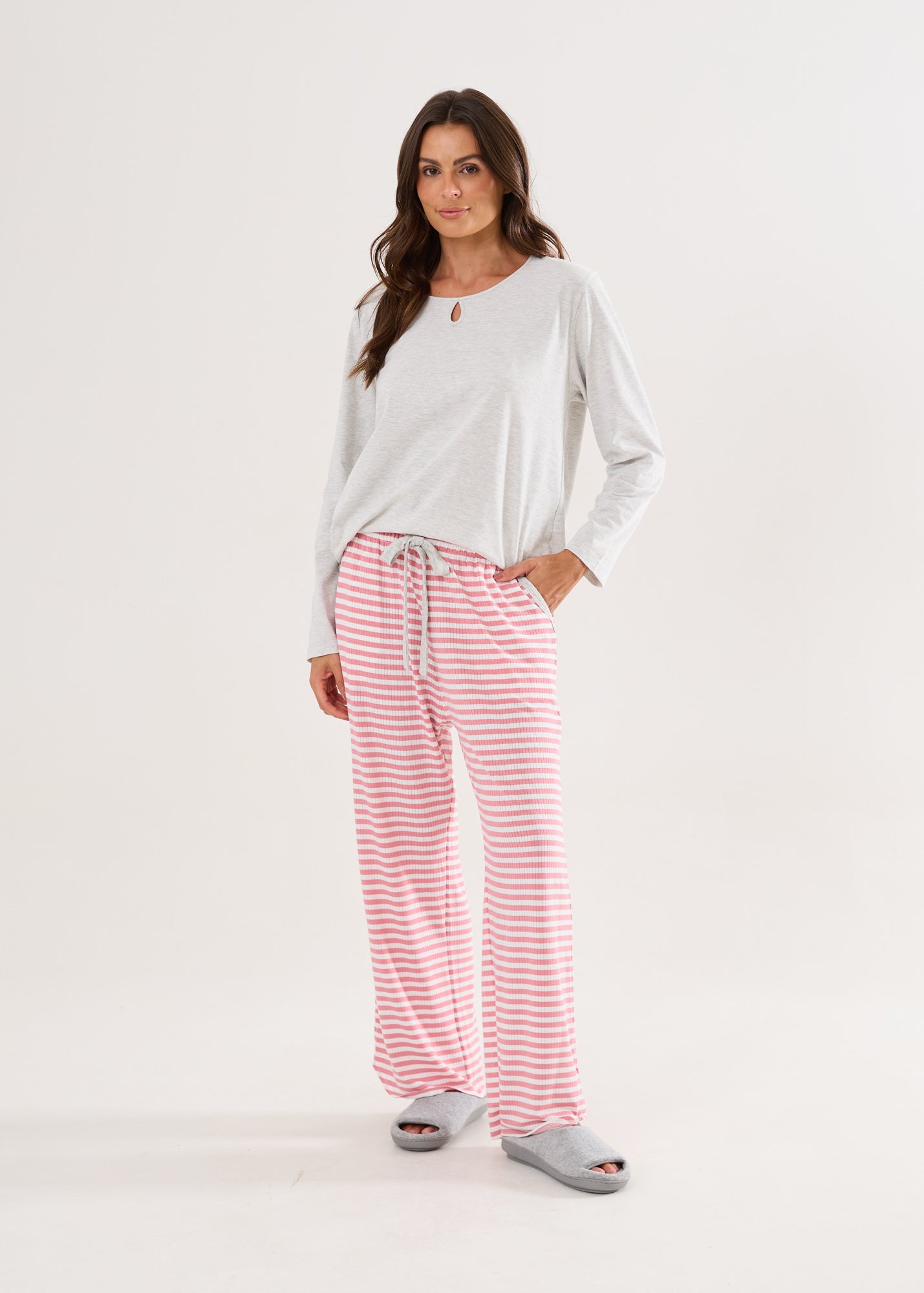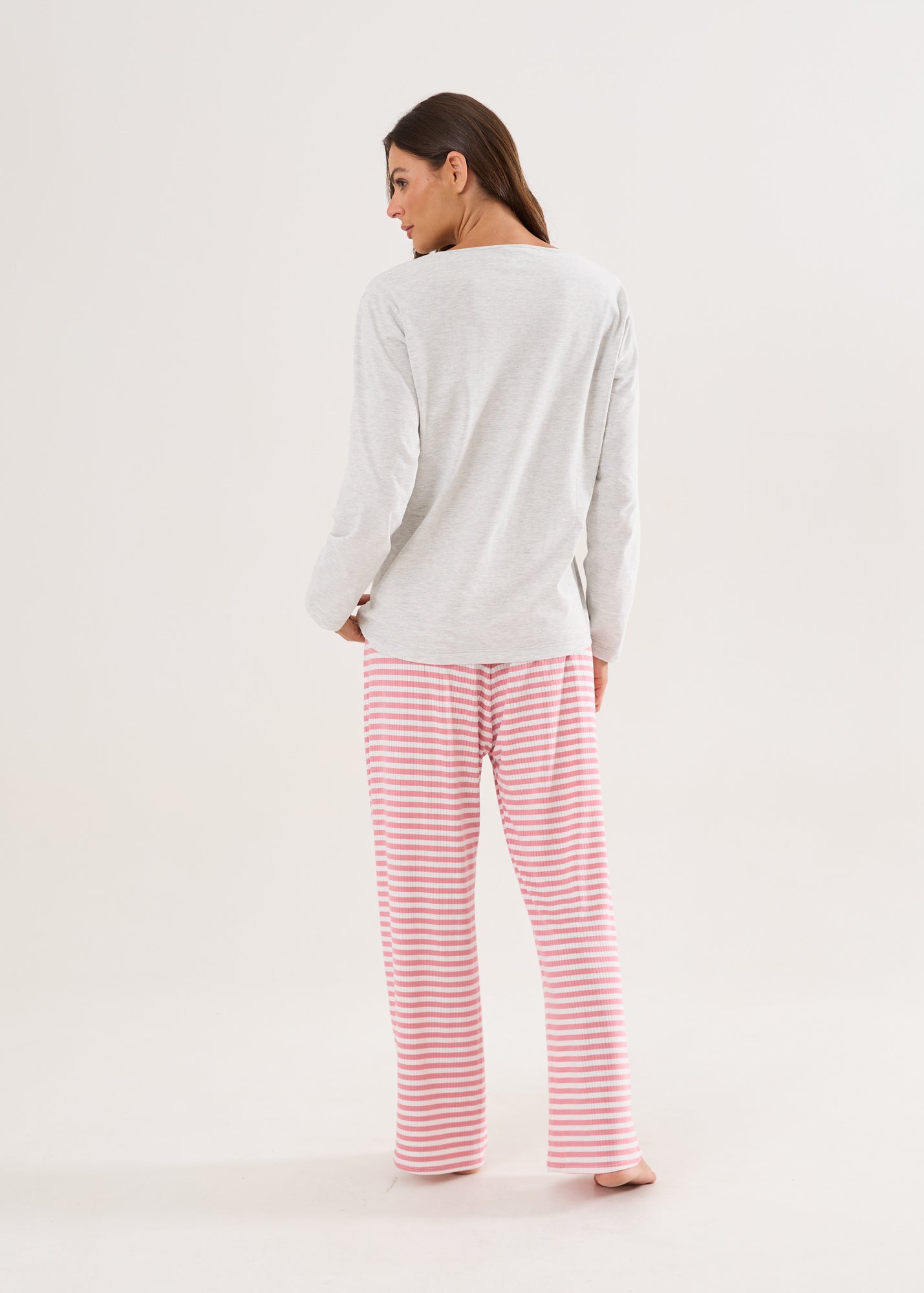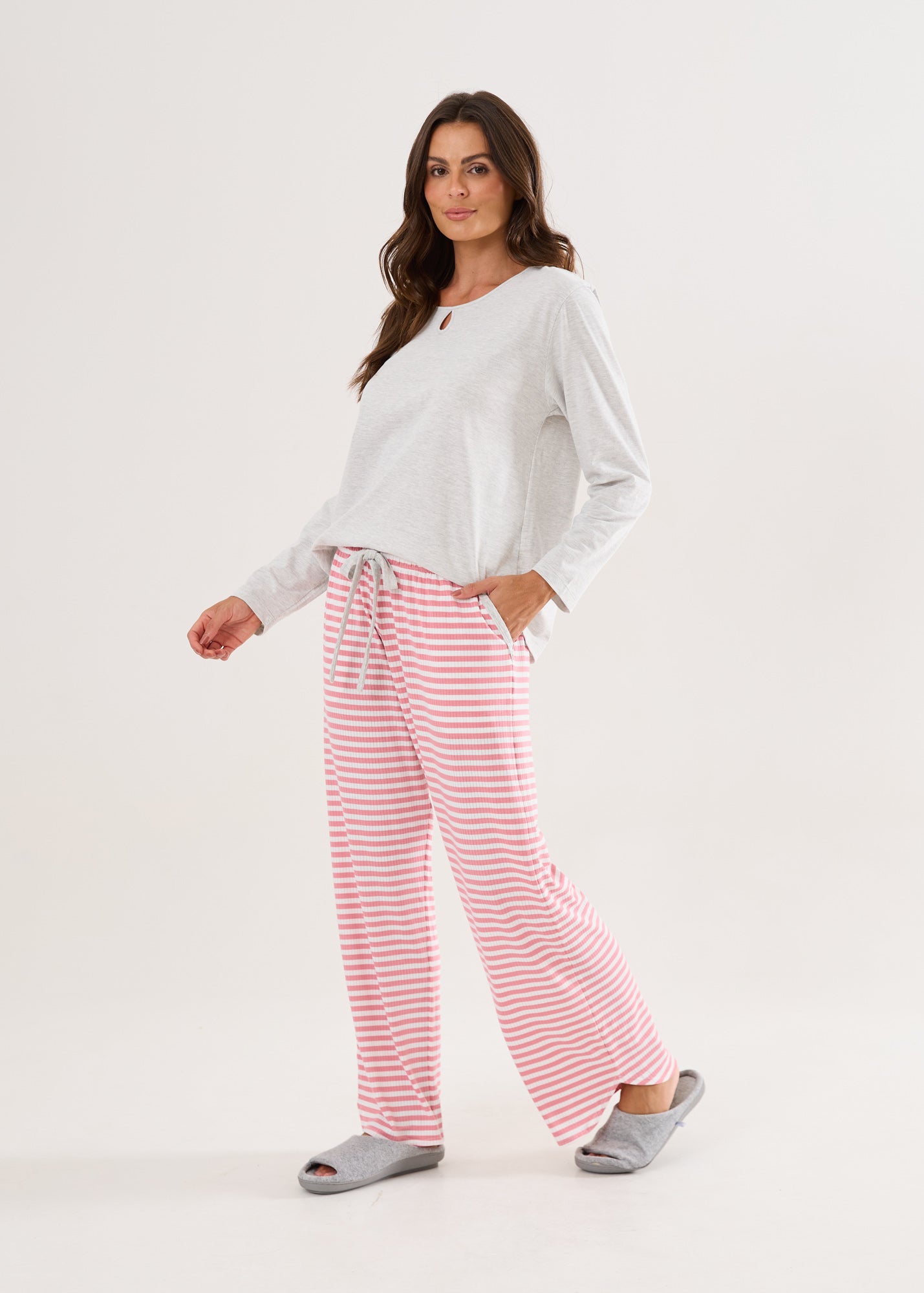 Calça avulsa em canelado listrado, com bolsos laterais, elástico na cintura e detalhe arredondado na barra. Listrado de rosa e branco com detalhes em canelado mescla. Combine a sua calça avulsa com as blusas avulsas lisas branca ou mescla e crie vários looks diferentes.