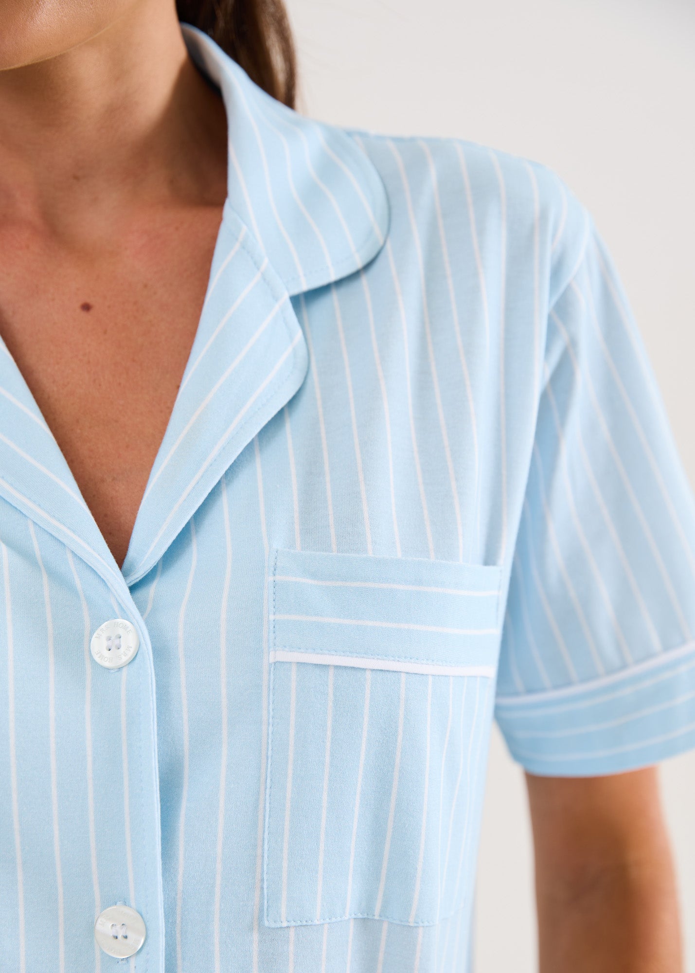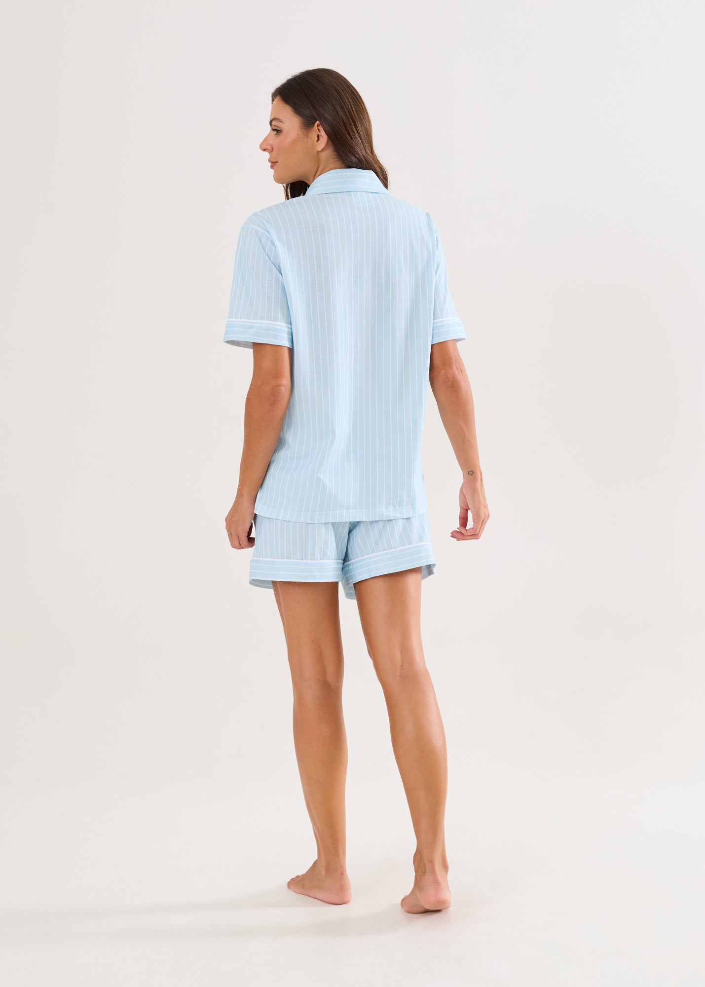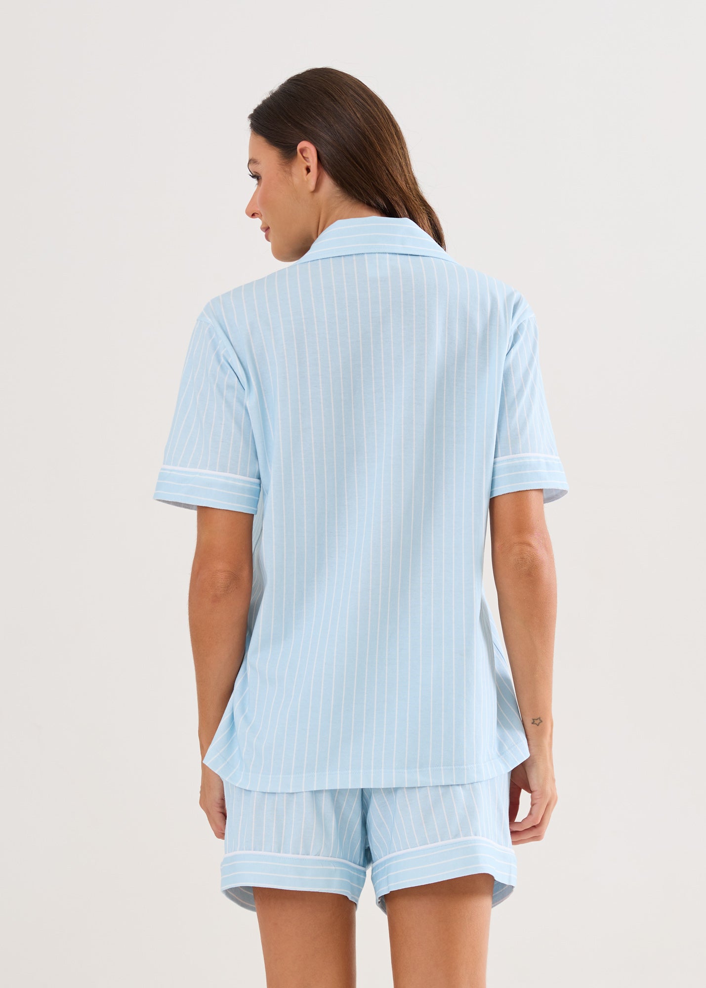 Pijama curto feminino, modelo americano, com mangas curtas, gola, bolsinho lateral e botões personalizados. Bermuda com bolsos e elástico na cintura.