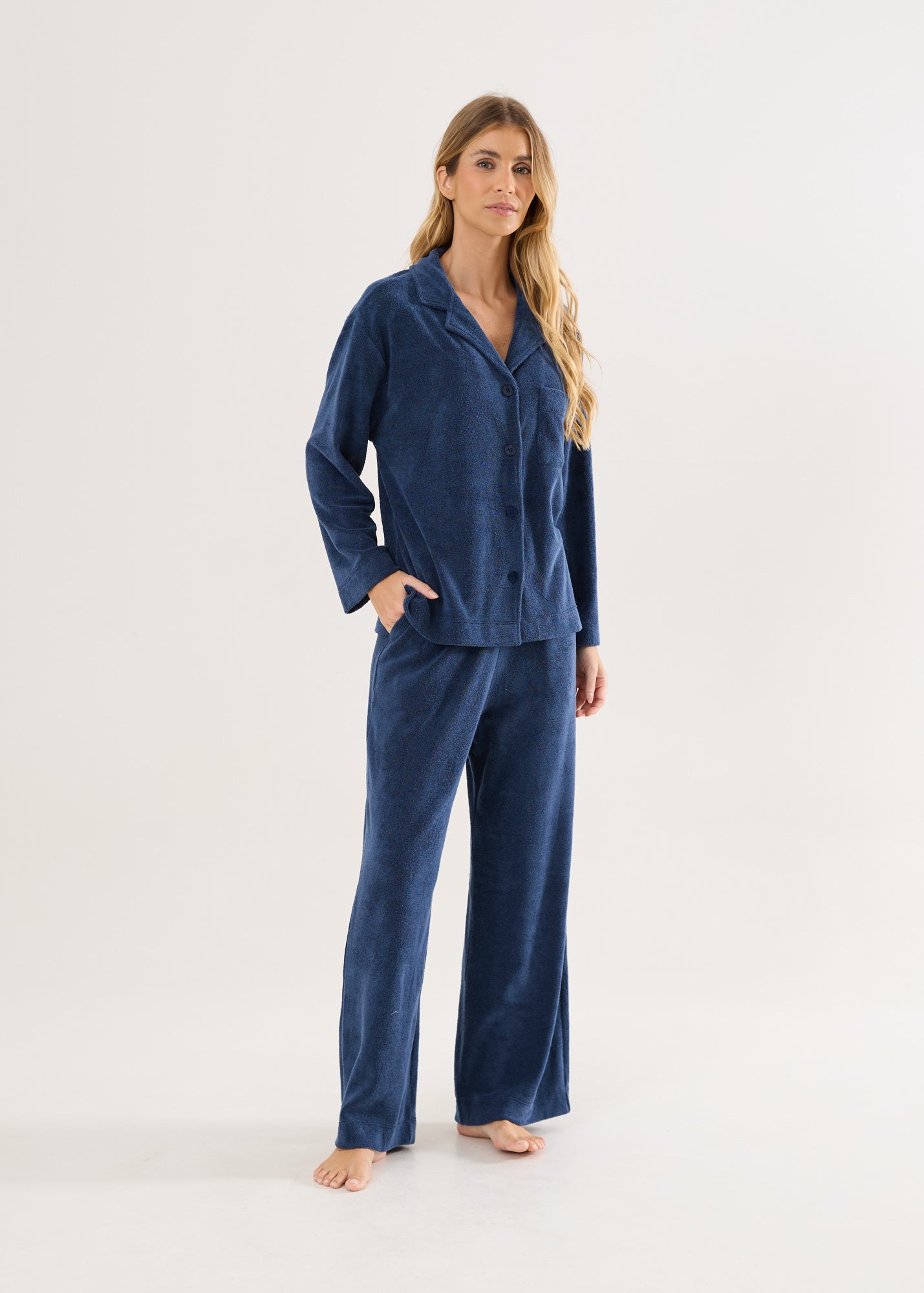 Pijama longo feminino, modelo calça e blusa mangas longas, abotoado, botões personalizados. Calça com elástico na cintura.