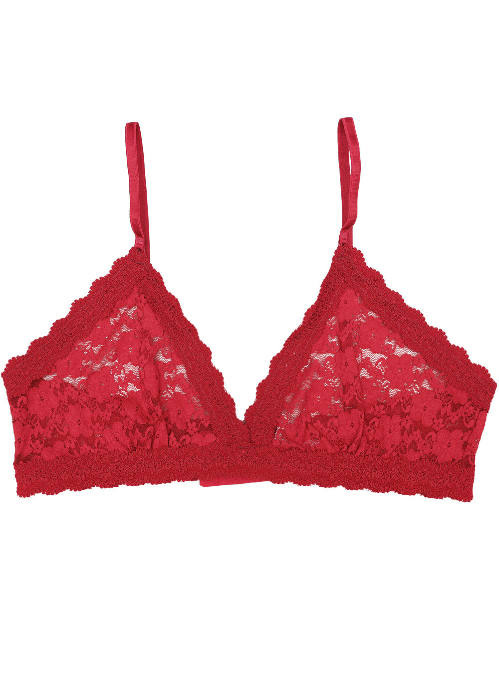 Sutiã modelo triângulo, todo em renda sem bojo na cor nude. Possui regulagem no fecho em 3 tamanhos, alças finas com elástico na cor também reguláveis.