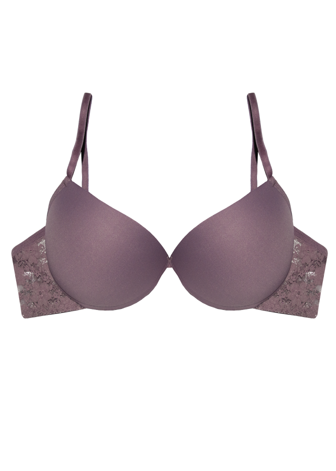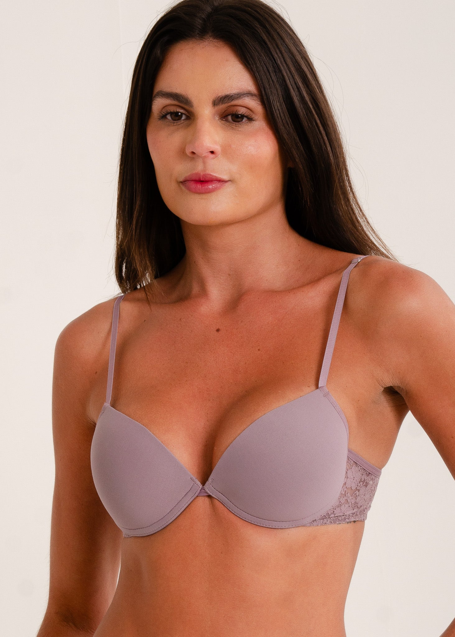 Modelo com bojo liso para não marcar na roupa, alças de elástico na cor, e renda na cor nas laterais e costas. Cor nude.