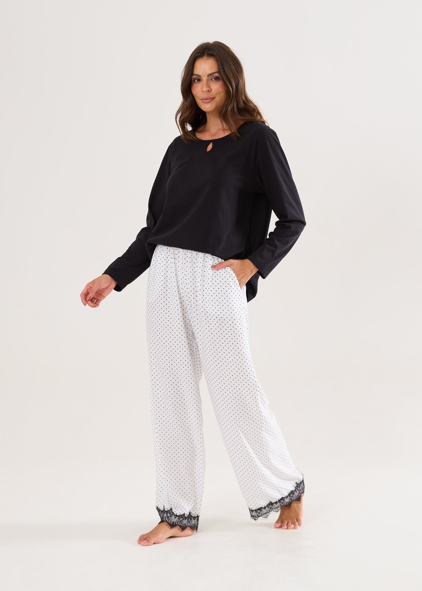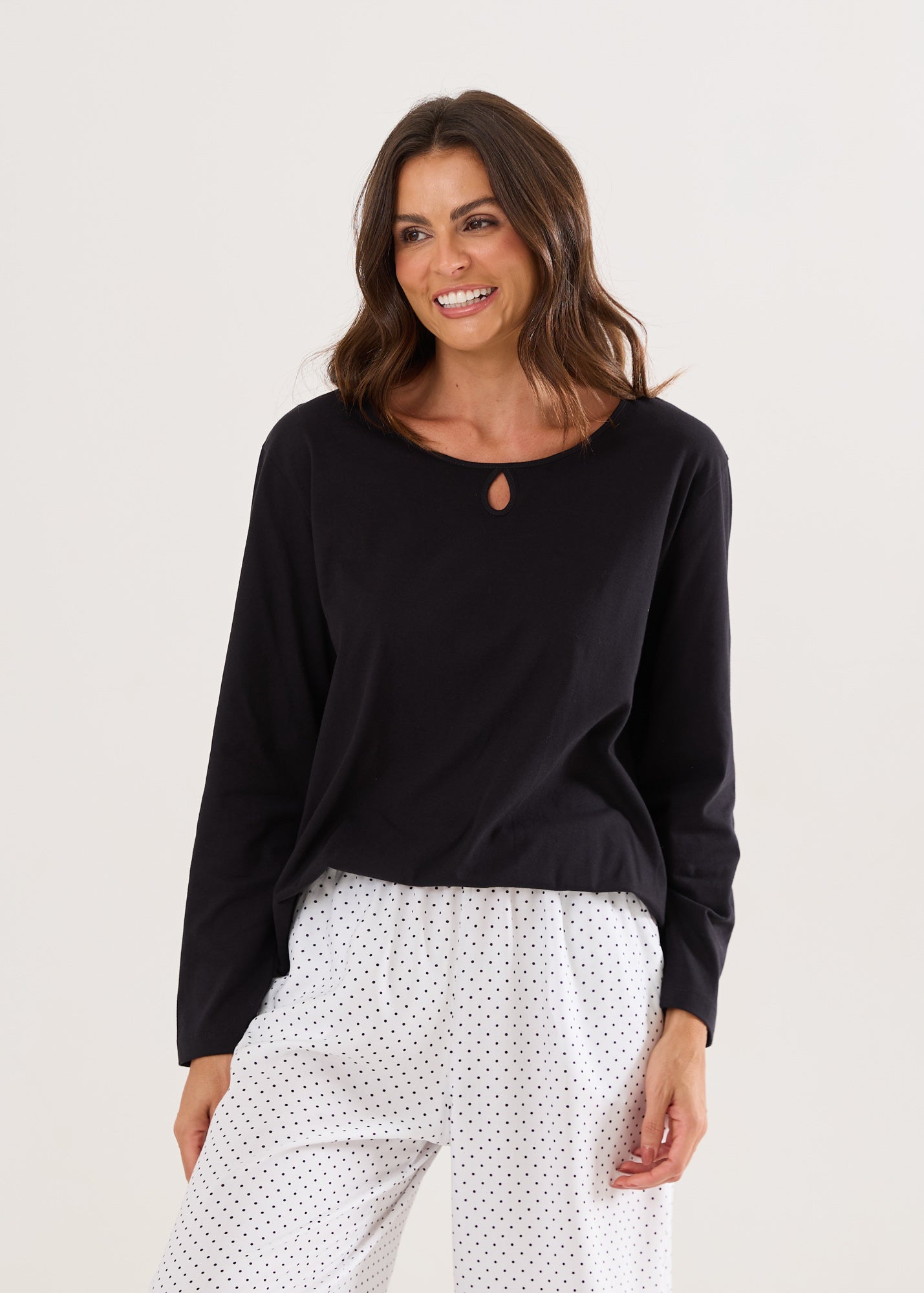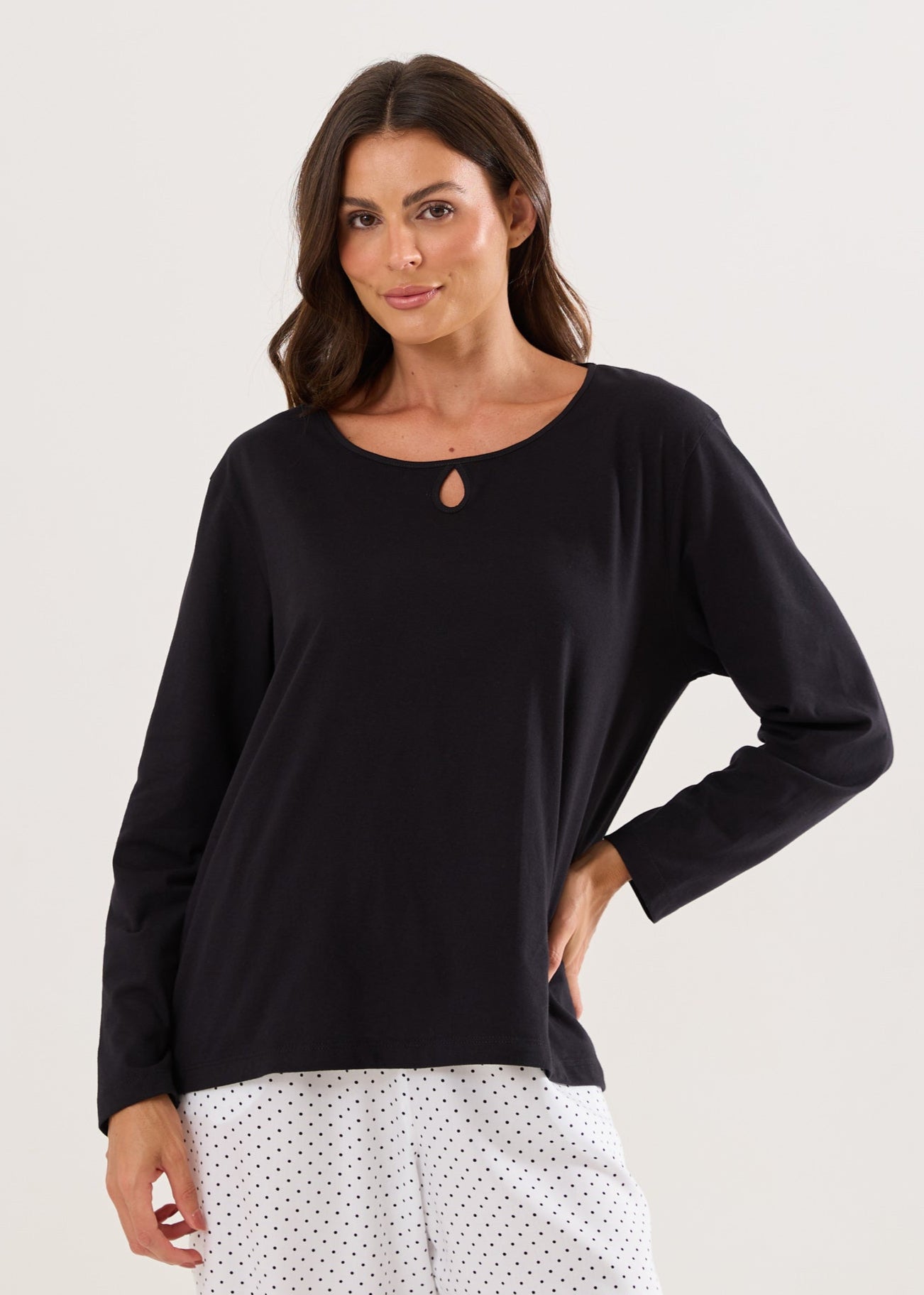 Blusa feminina com mangas longas, decote redondo e detalhe gota no decote. Muito versátil, essa é uma peça avulsa e você pode combinar com seus pijamas e montar vários looks!