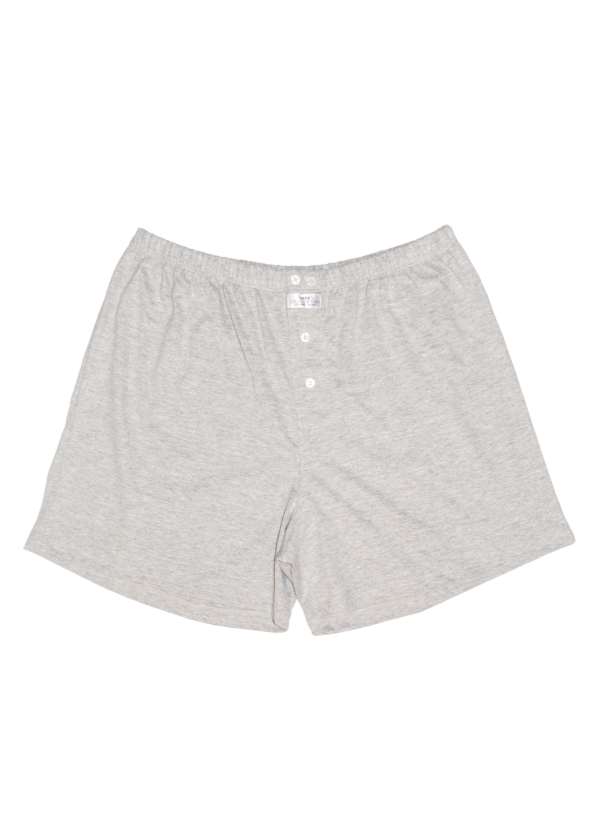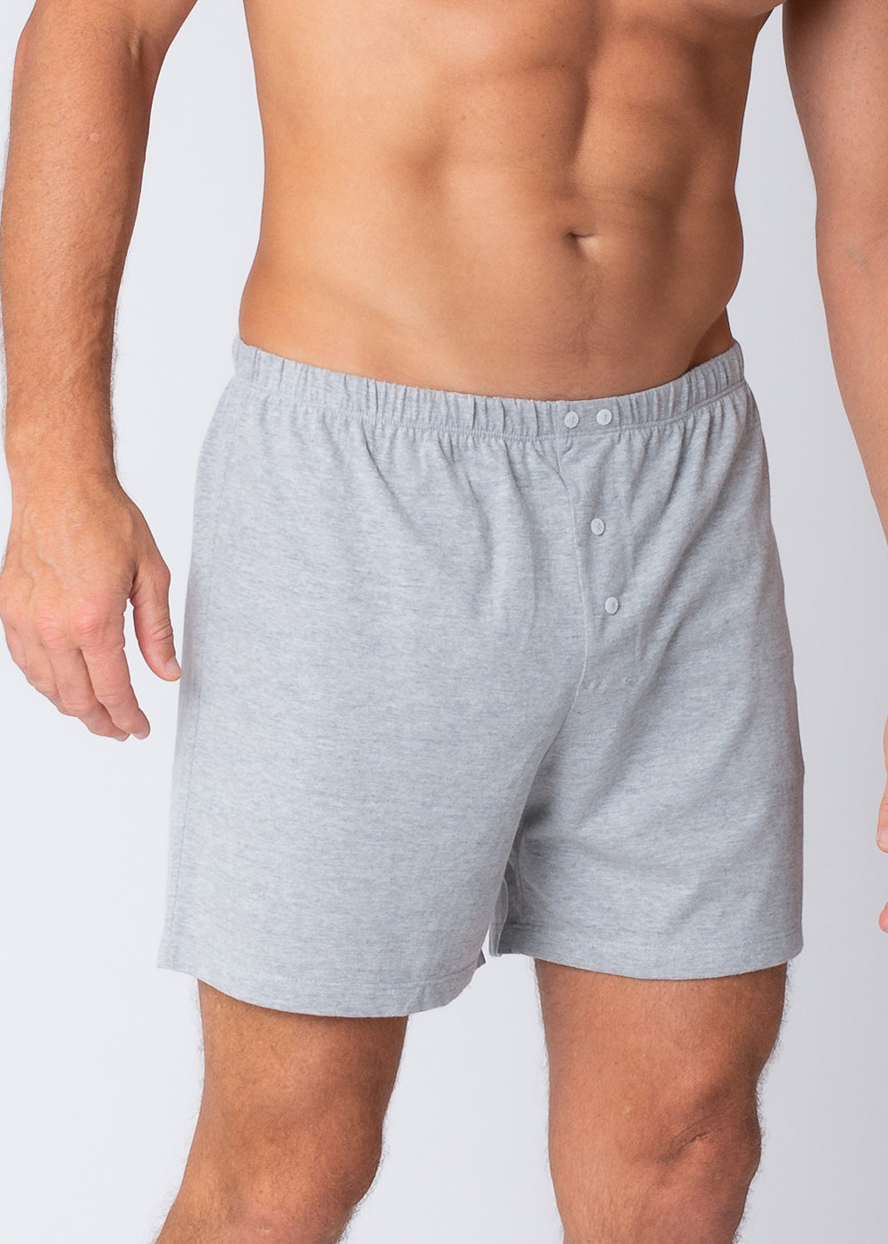 Boxer adulto masculina em malha na cor cinza mescla, em malha ultra soft que tem um toque maravilhoso e proporciona muito conforto! Acabamento de elástico no cós e braguilha falsa com botões.
