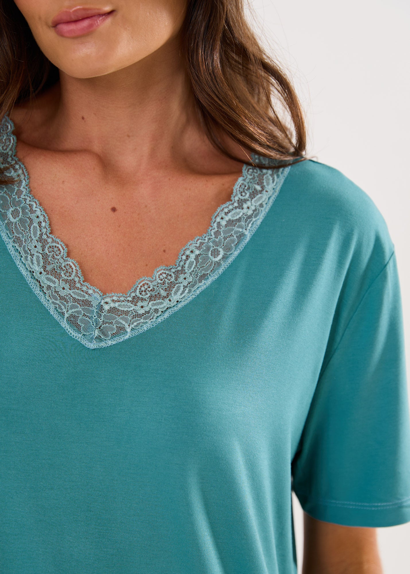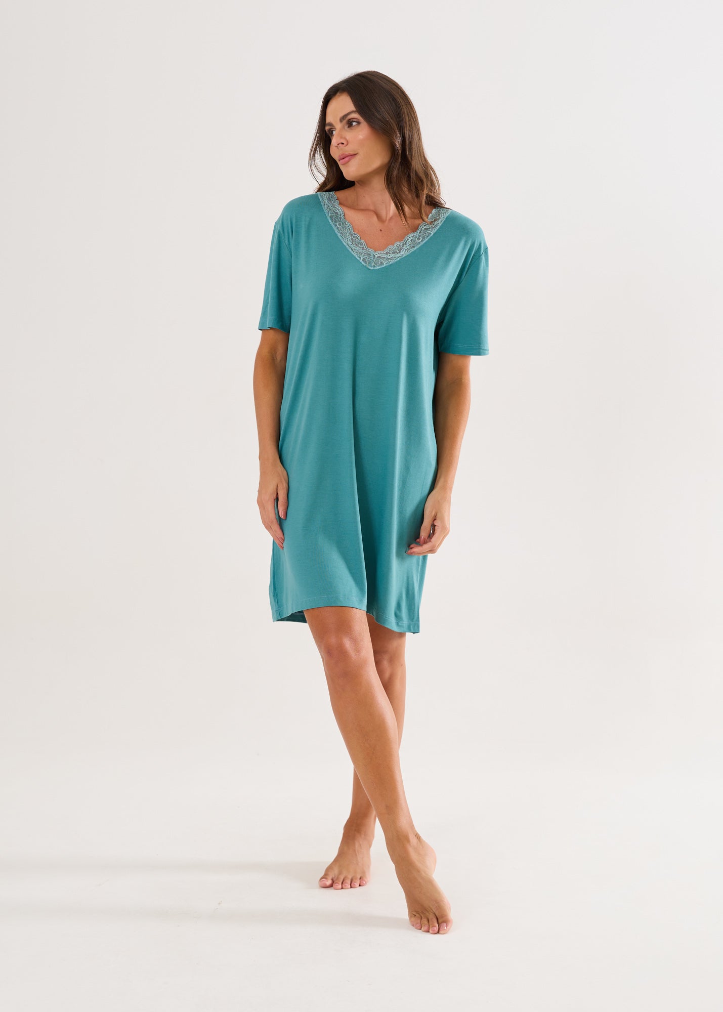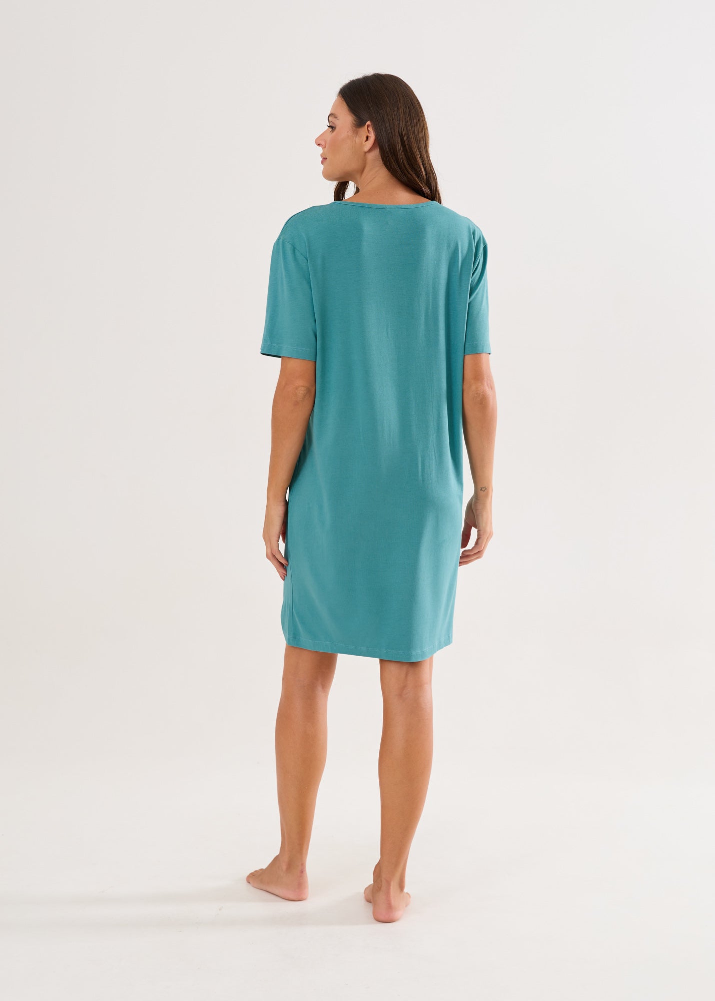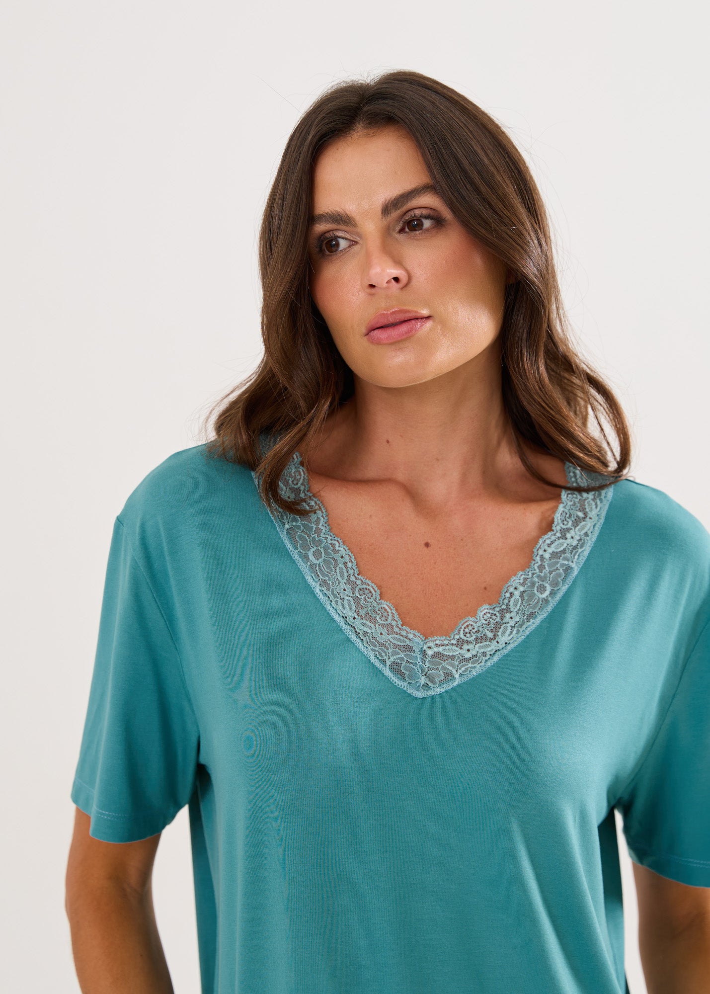 Camisola feminina, modelagem ampla e soltinha, com mangas, decote com detalhe em renda. Num tom azul esverdeado, essa é a cor do ano de 2026! A malha visco é confortável e leve, com toque muito macio, perfeita para qualquer estação do ano. Comprimento no joelho.