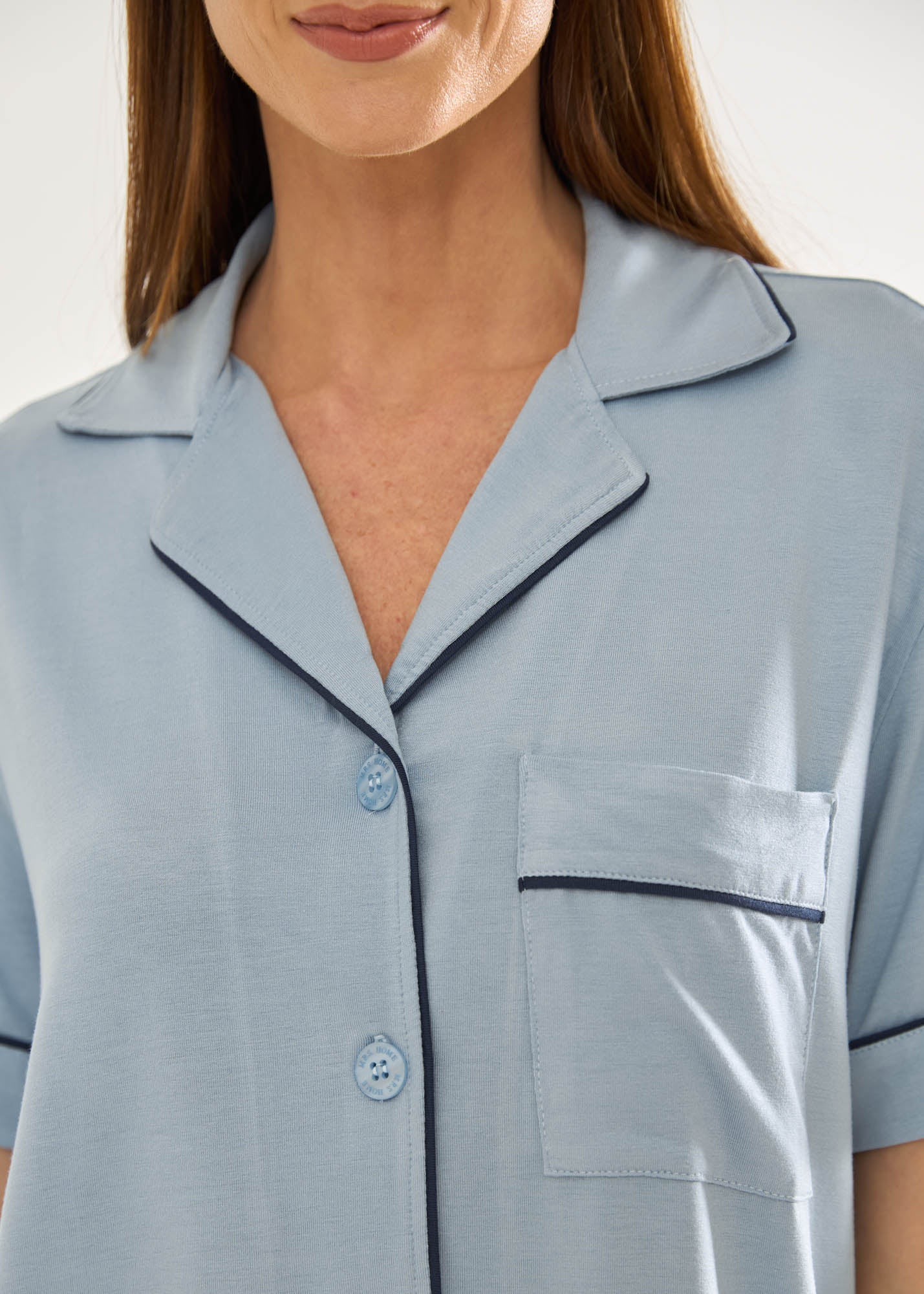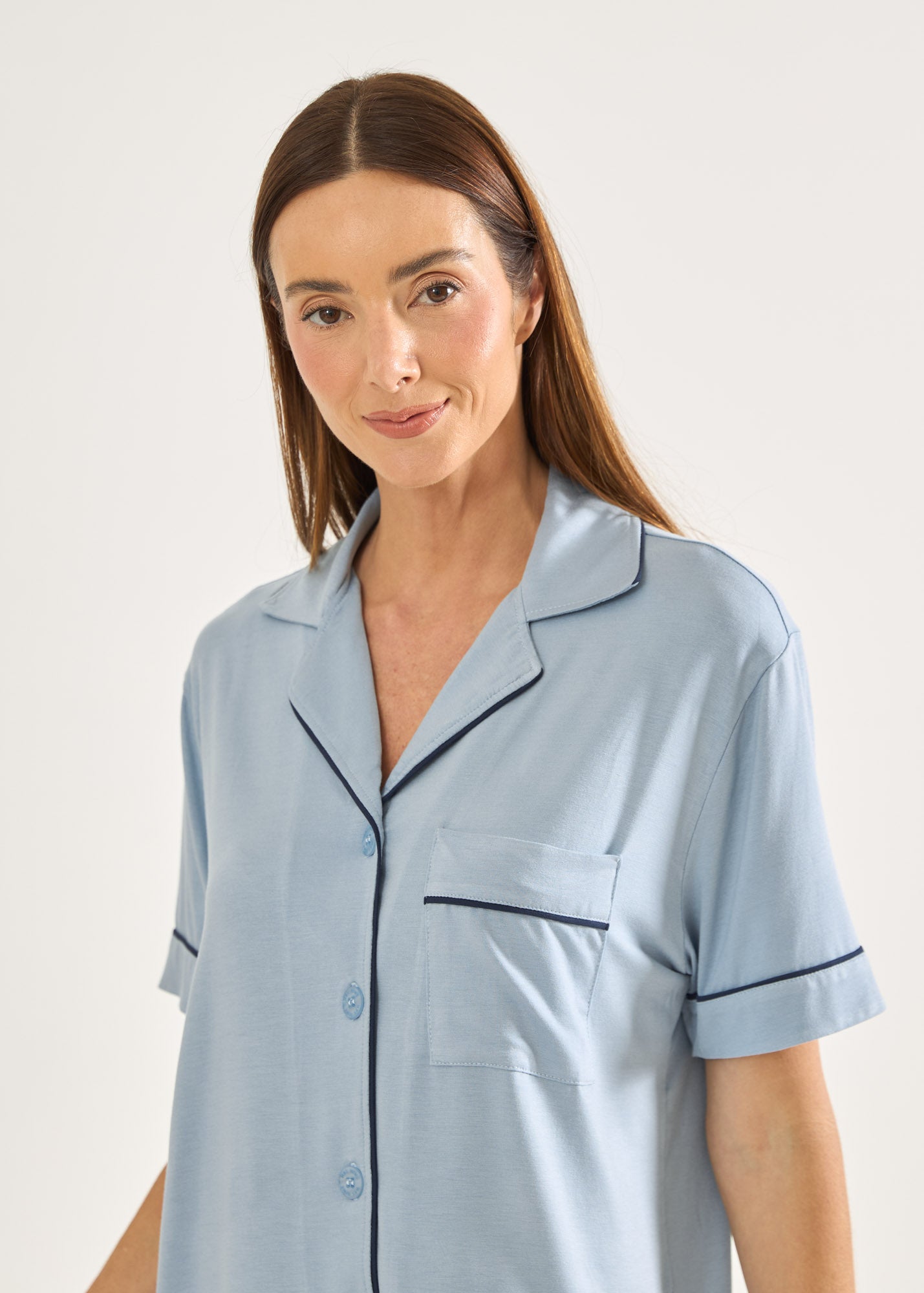 Pijama feminino, modelo americano, bermuda e blusa de mangas curtas, com gola e botões personalizados, aberto na frente em malha visco. A malha visco é leve, prática e muito confortável. Bonito e confortável, esse pijama é o nosso modelo best seller em todas as coleções.