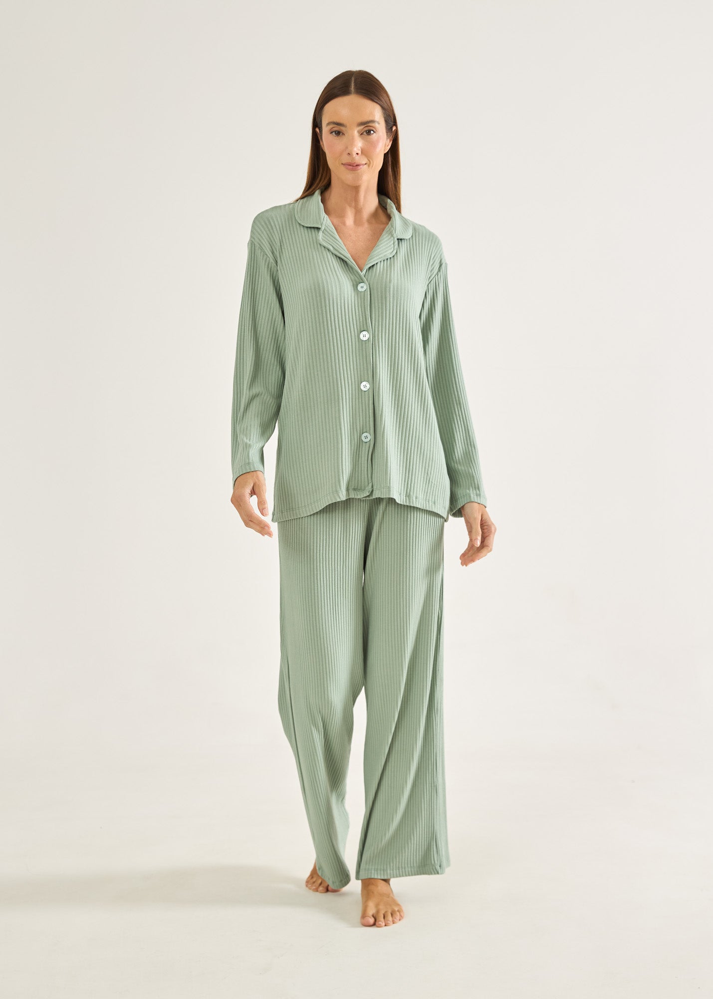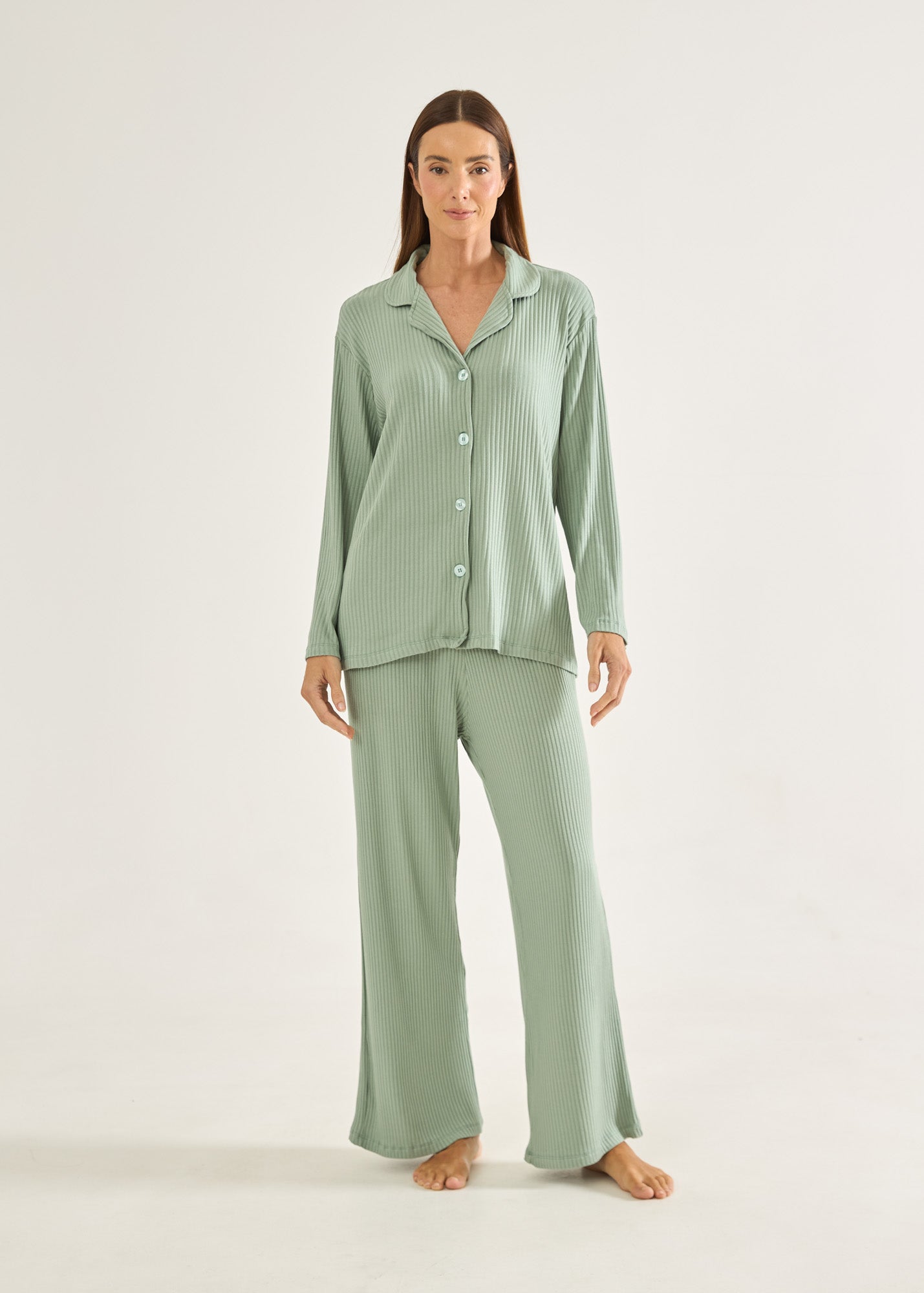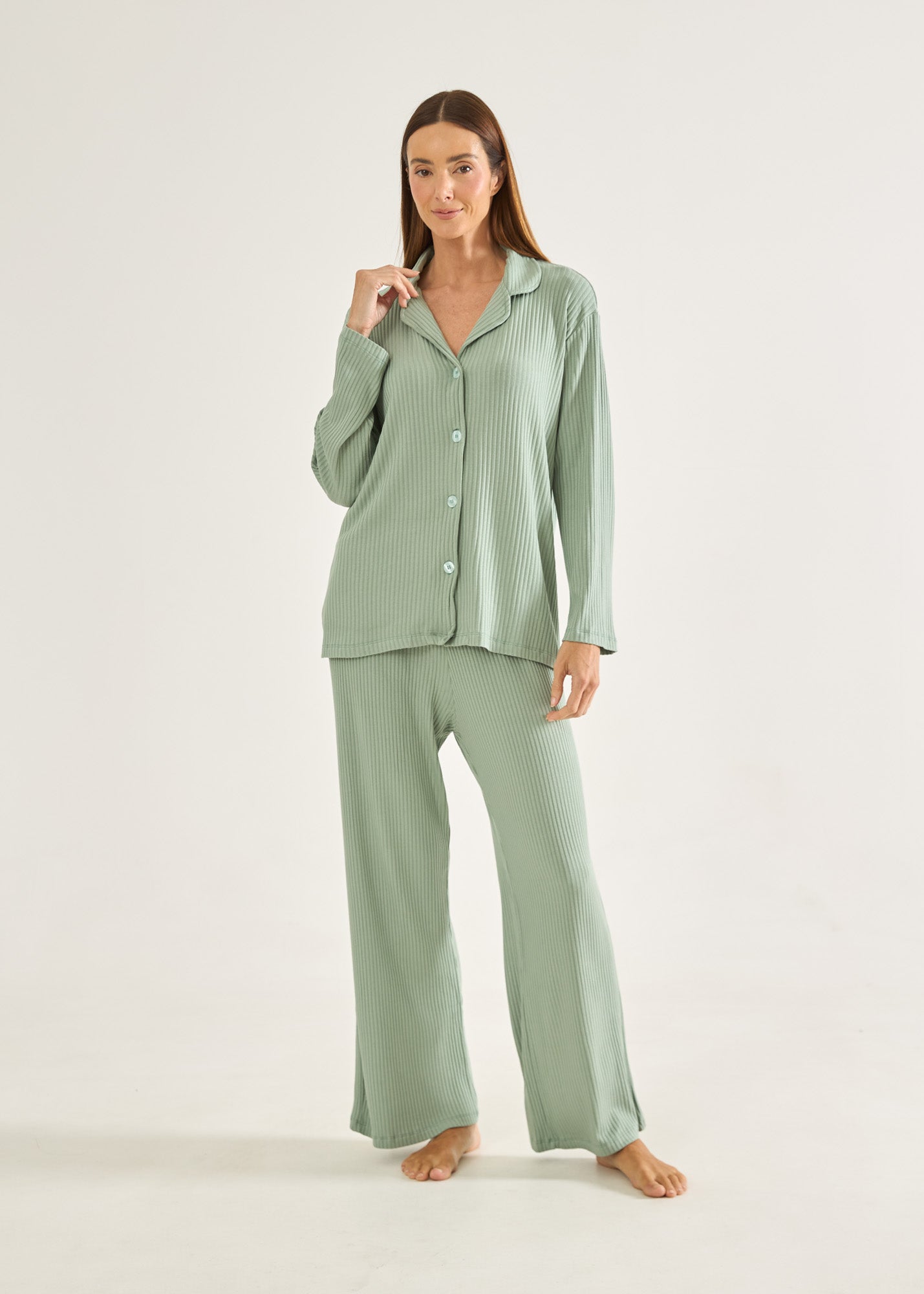Pijama longo feminino, em malha canelada com fio da viscose. Modelo abotoado, com botões personalizados, blusa mangas longas e calça ampla com elástico na cintura e bolsos laterais.