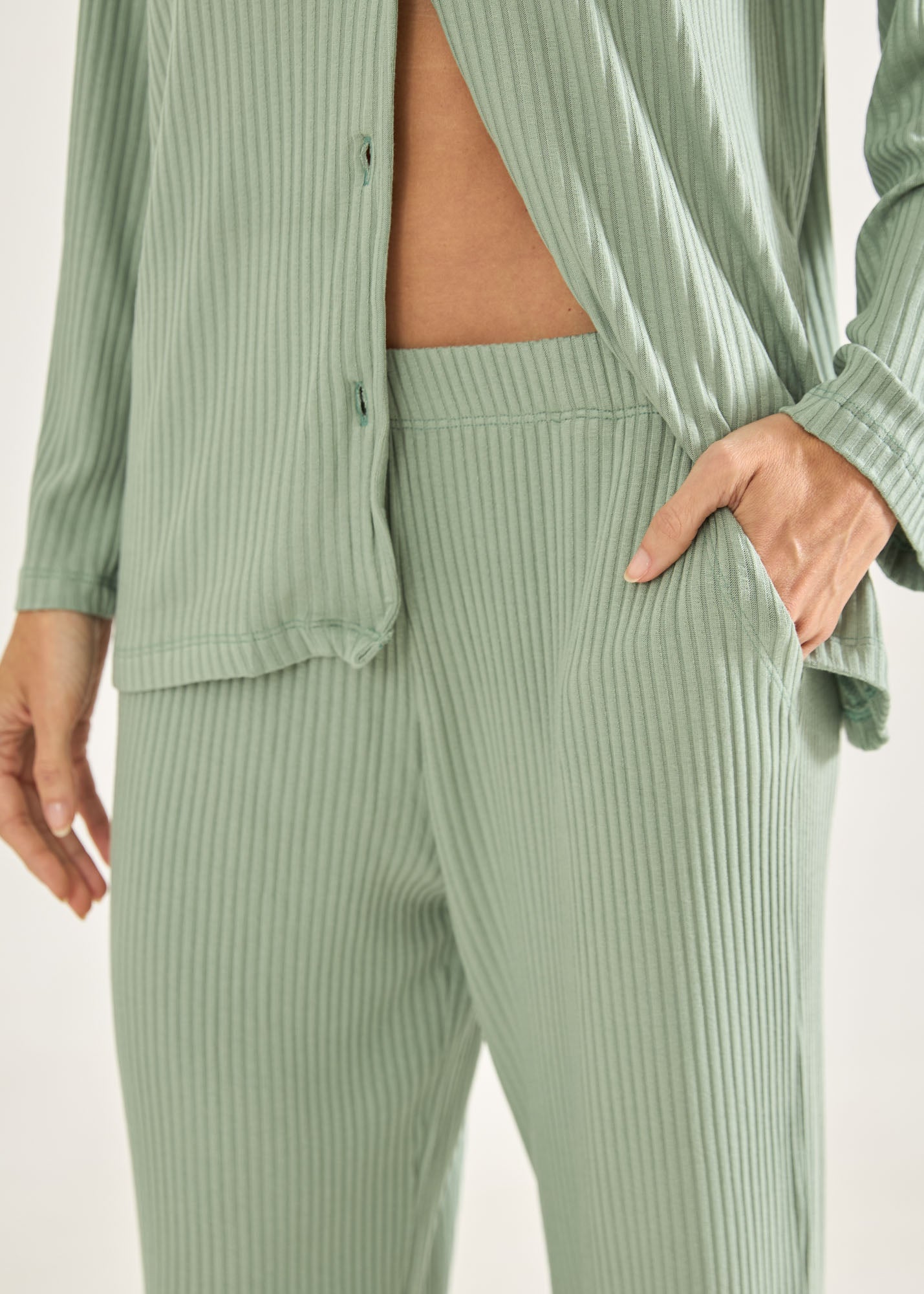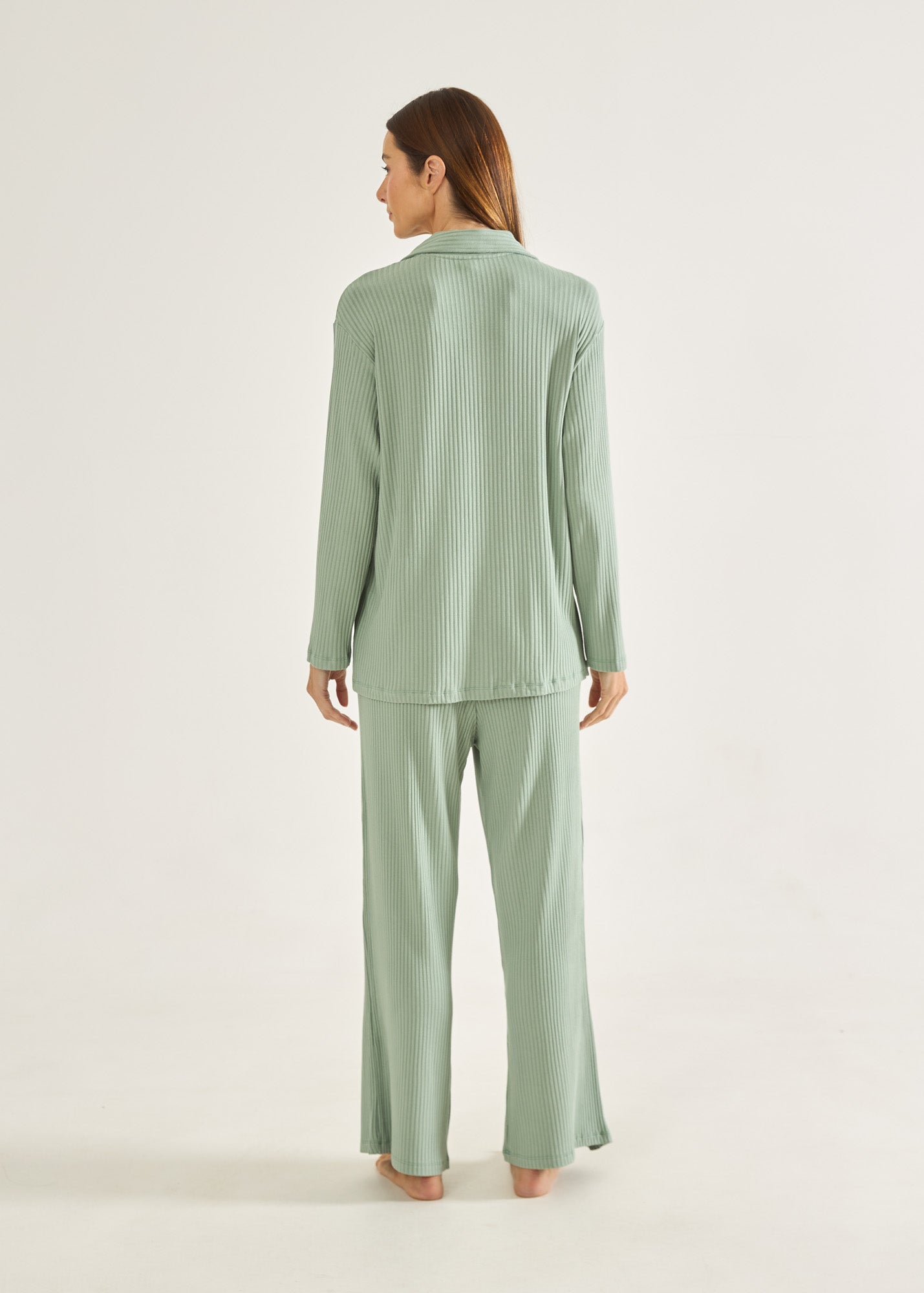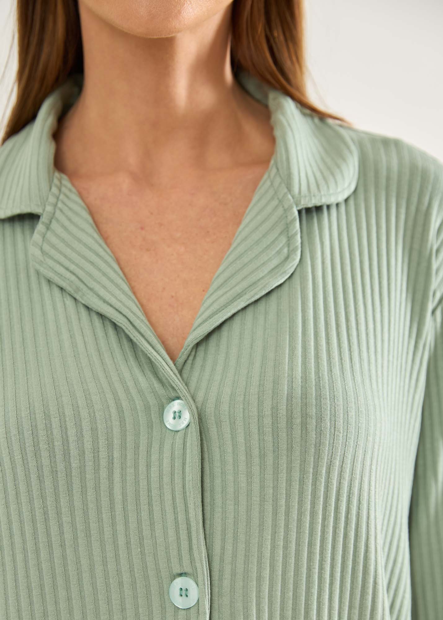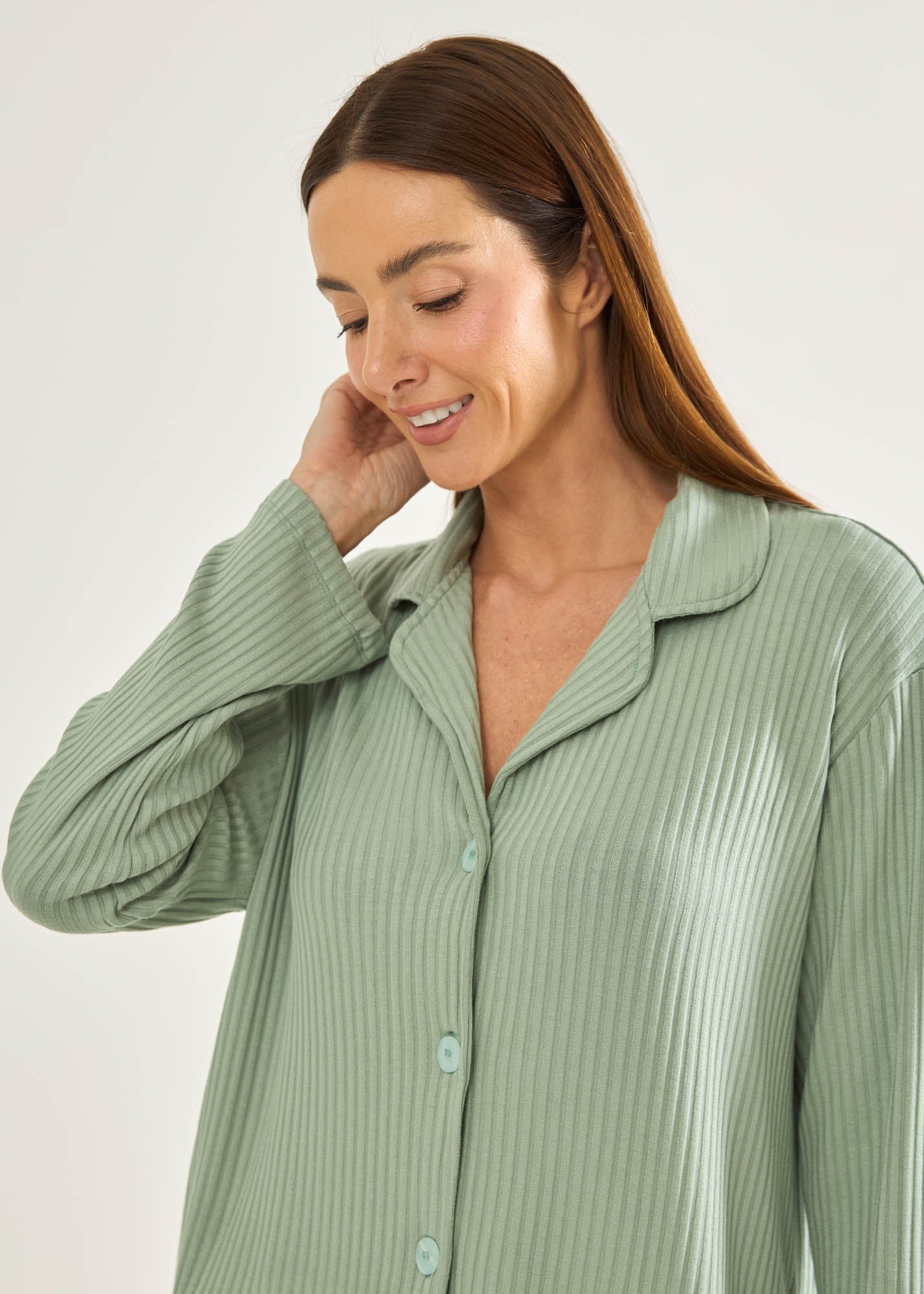 Pijama longo feminino, em malha canelada com fio da viscose. Modelo abotoado, com botões personalizados, blusa mangas longas e calça ampla com elástico na cintura e bolsos laterais.