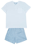 Pijama masculino adulto, modelo bermuda em tecido 100% algodão com padronagem xadrez em tons de azul claro e cinza, elástico na cintura e bolsos laterais e blusa em malha 100% algodão, mangas curtas e decote polo com botões e detalhe xadrez.
